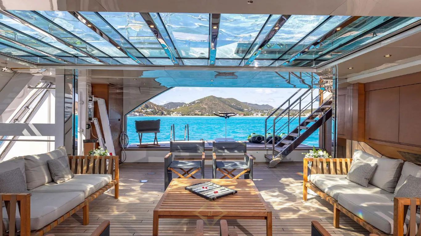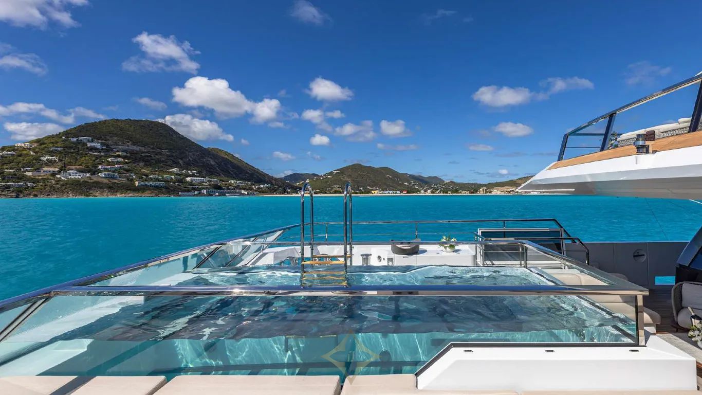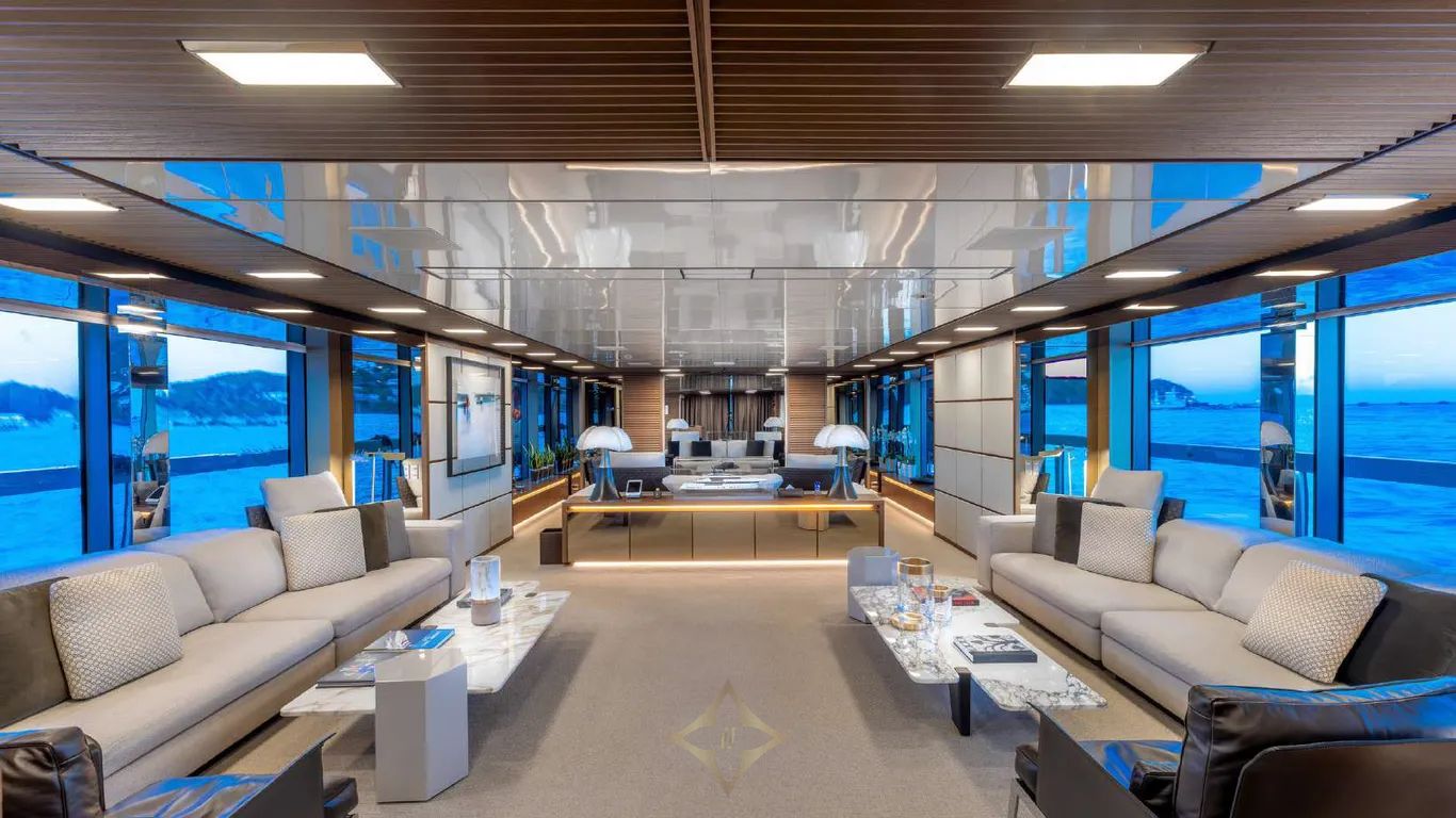 Her interiors, by Officina Italiana Design, are light-filled and contemporary, with a refined palette of white, taupe, beige, and warm brown leathers, accented by glass, marble, and reflective surfaces that amplify space and elegance. Outside, her sleek, modern lines are punctuated by signature features: a glass-bottom pool and a drive-in tender bay that transforms into a full-beam beach club with floating terraces, perfect for entertaining or relaxing in style.
