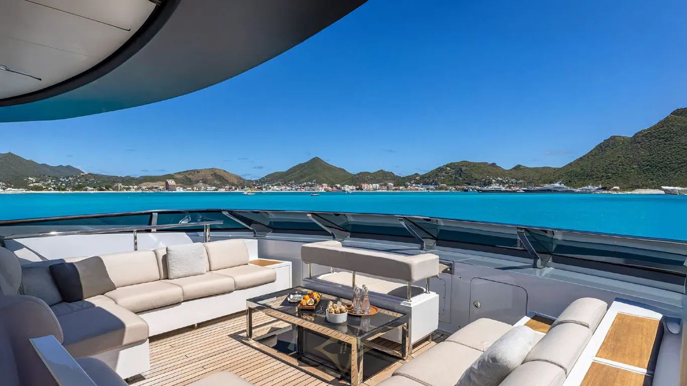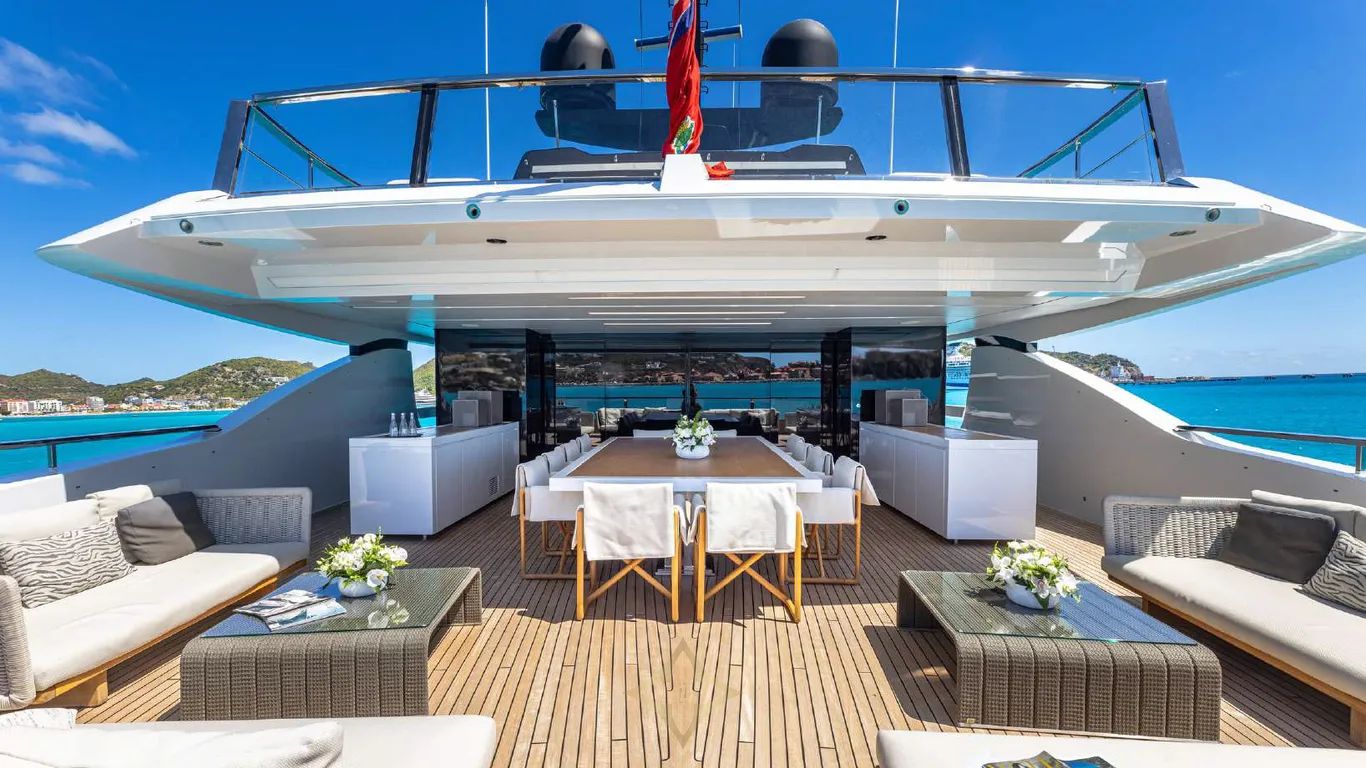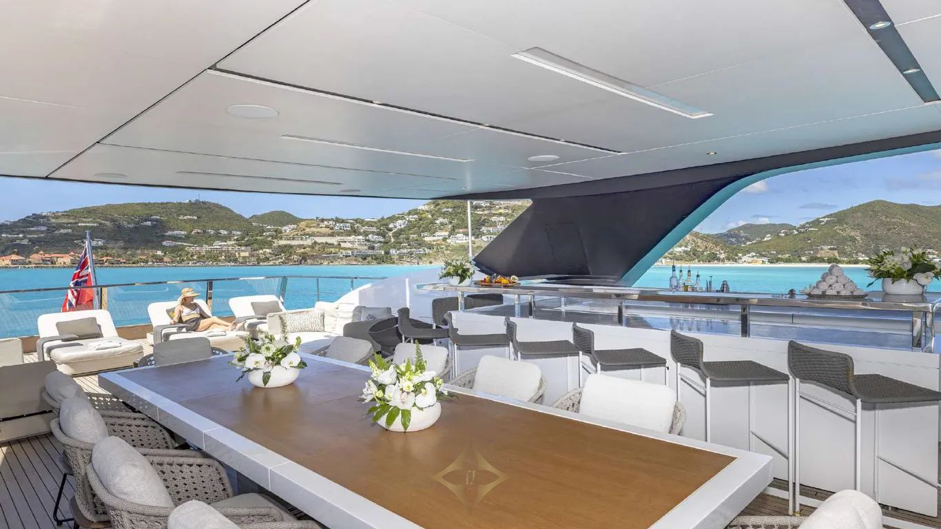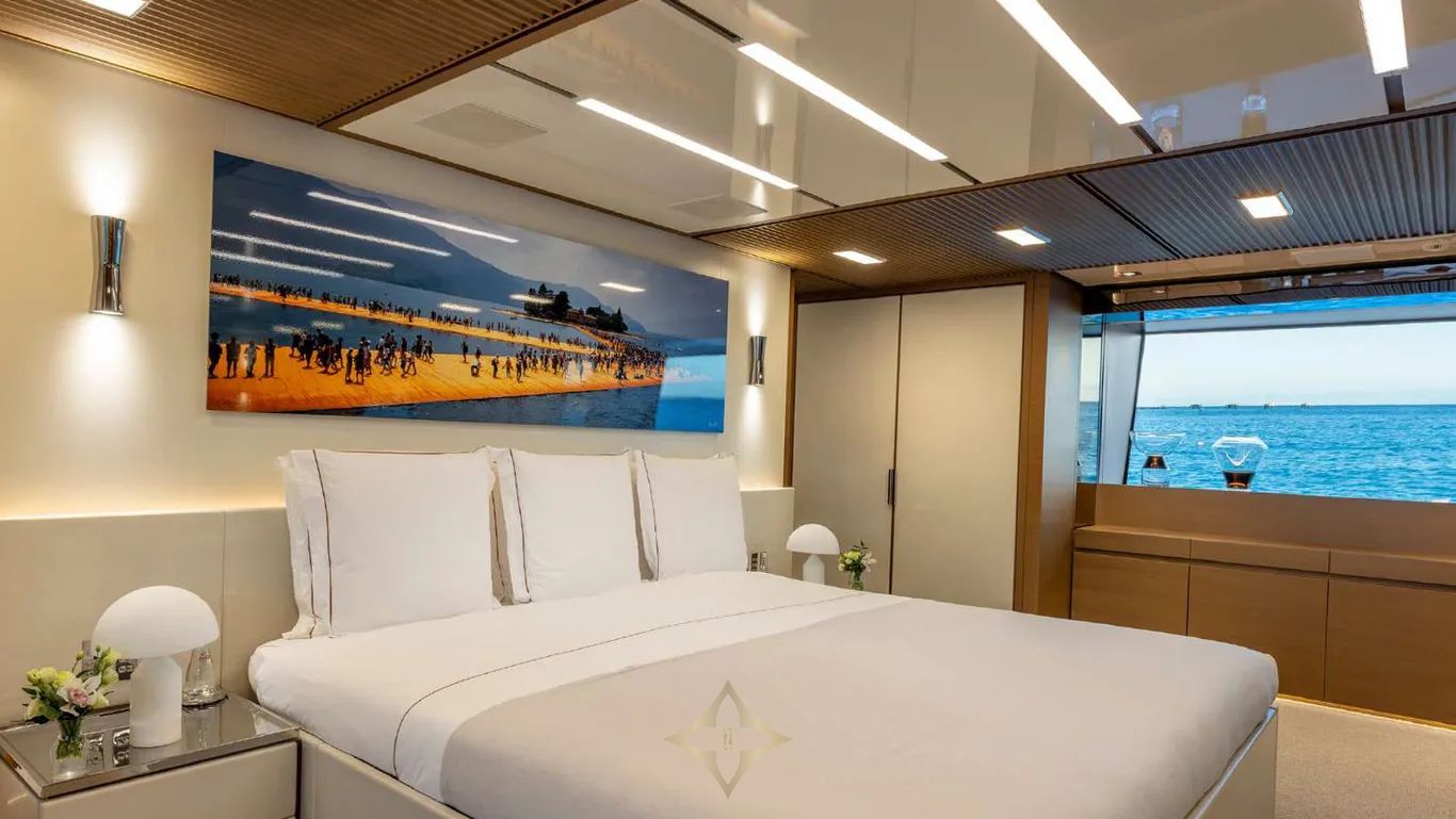 Her interiors, by Officina Italiana Design, are light-filled and contemporary, with a refined palette of white, taupe, beige, and warm brown leathers, accented by glass, marble, and reflective surfaces that amplify space and elegance. Outside, her sleek, modern lines are punctuated by signature features: a glass-bottom pool and a drive-in tender bay that transforms into a full-beam beach club with floating terraces, perfect for entertaining or relaxing in style.