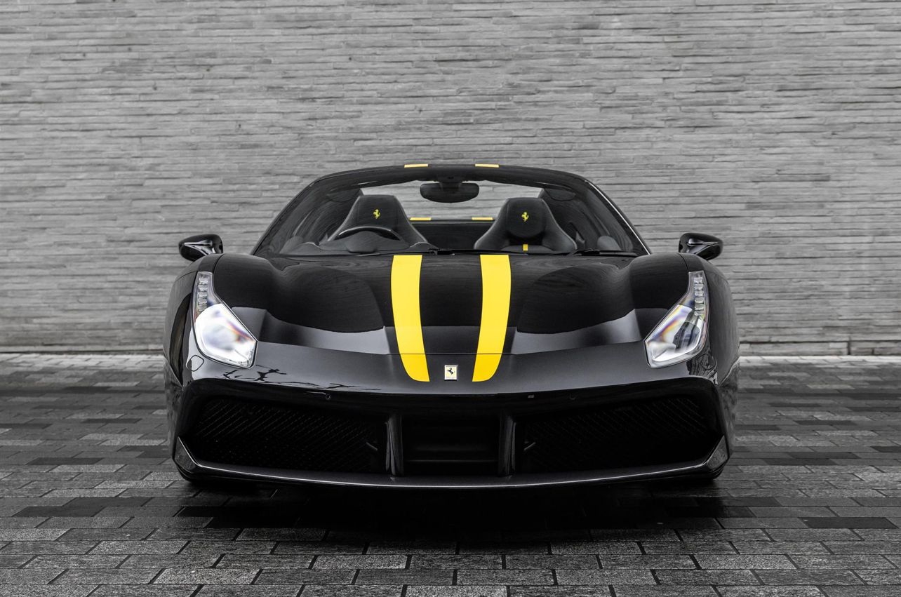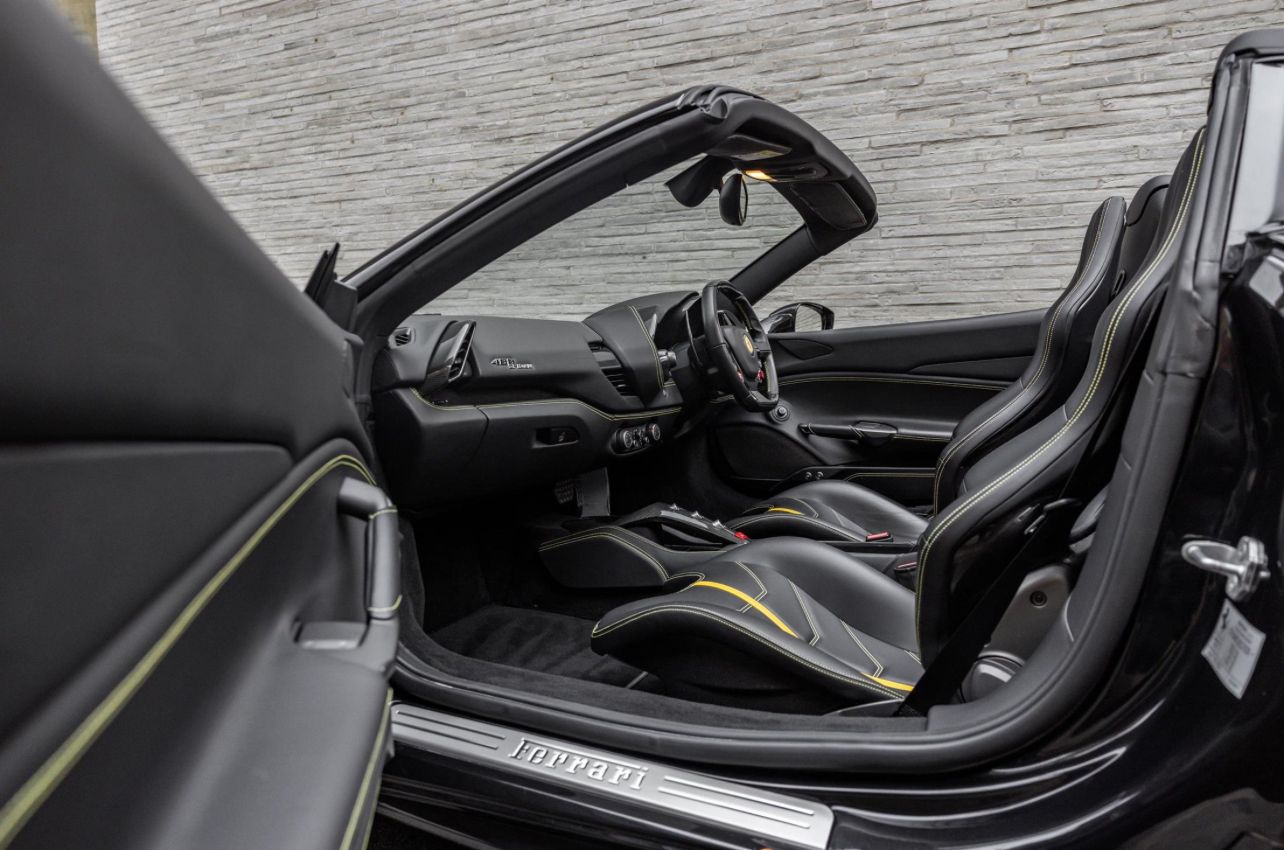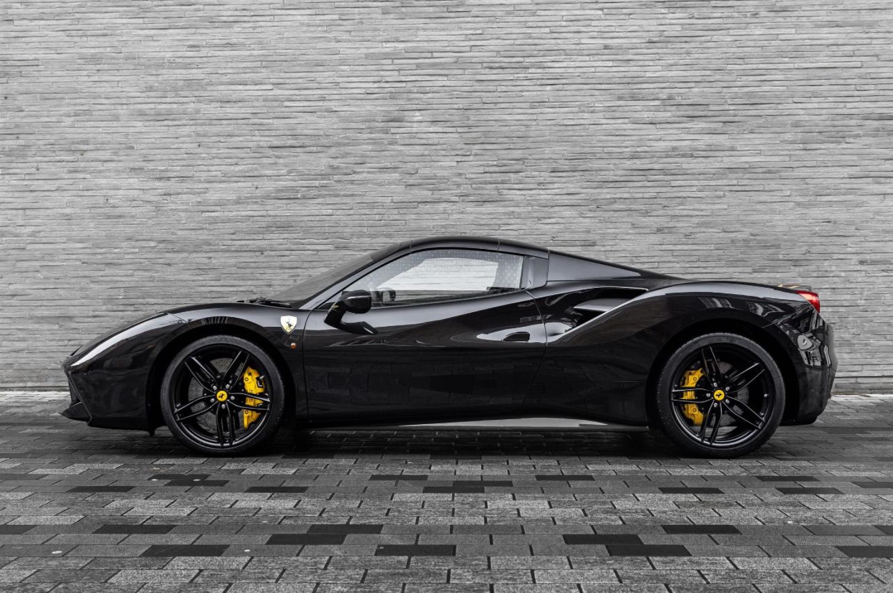 Finished in the timeless and purposeful Nero Daytona with a Nero leather interior, this Ferrari 488 Spider is a beautifully specified and exceptionally low-mileage example of Maranello’s acclaimed open-top V8 supercar. Registered in October 2018 and supplied new by H.R. Owen Ferrari London, it has had just one owner and covered only 3,150 miles, presenting in outstanding condition throughout. The exterior is enhanced by a comprehensive carbon fibre package including the carbon racing pack, paired with 20″ forged wheels in matte Grigio Corsa, sports tailpipe tips, and Giallo Modena brake callipers, giving the car a striking and aggressive stance while retaining a refined, understated look. Inside, the driver-focused cabin features carbon fibre Goldrake racing seats in Taglia Large, yellow contrast stitching, embroidered Cavallino headrests, and the iconic yellow rev counter, delivering a perfect balance of luxury and motorsport inspiration. The upper cabin in Nero leather adds a further layer of craftsmanship and comfort. Specification highlights include front suspension lift, adaptive headlights, rear parking camera, front parking sensors, electrochromic mirrors, and Ferrari’s HELE efficiency system, ensuring everyday usability alongside thrilling performance. A superbly presented, one-owner 488 Spider in an iconic colour combination, a truly outstanding opportunity. CALY – Giallo Modena brake calipers CFEP – Carbon fibre pack for exterior CRPK – Racing pack in carbon fibre EXA3 – Sports tailpipe tips FLMA – Overmats with embroidered vehicle logo LOGO – “Scuderia Ferrari” shields on wings RIFS – 20″ forged wheels, matte Grigio Corsa RIMM – Matt painted wheels CRPT – Carpet colour: Nero 152 EMPH – Embroidered Cavallino emblem on headrest (Filo Giallo) RMPY – Yellow rev counter RSCG – “Goldrake” carbon fibre racing seats (Sedili Taglia Large) RSES – Manual ratchet seat height adjustment STC2 – Special stitching (Filo Speciale Giallo) ULEZ – Upper zone in Nero leather AFS1 – Adaptive frontlight system ATTC – Drawing Attached ELEV – Front suspension lift FNEN – Functional equipment HELE – High Emotion Low Emission system MIR2 – Electrochromic exterior & interior mirrors NDSP – N.O.T.A Sulla Disposizione NVT1 – 1-year anti-theft satellite system subscription PAC1 – Rear parking camera PAR2 – Front parking sensors SPEC – Special Features