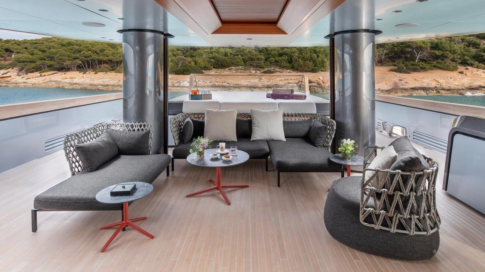 GECO also offers expansive exterior decks. The spectacular beach club is a standout feature, offering direct access to the sea and a luxurious spot for lounging by the large swimming pool. Fitness enthusiasts will appreciate the open-air sundeck gym, allowing for workouts with breathtaking ocean views. Additionally, the yacht is equipped with a convenient touch-and-go helipad for seamless arrivals and departures.