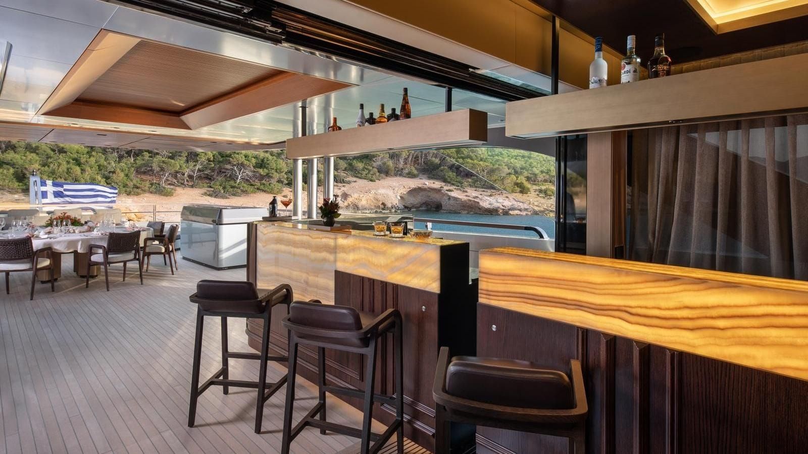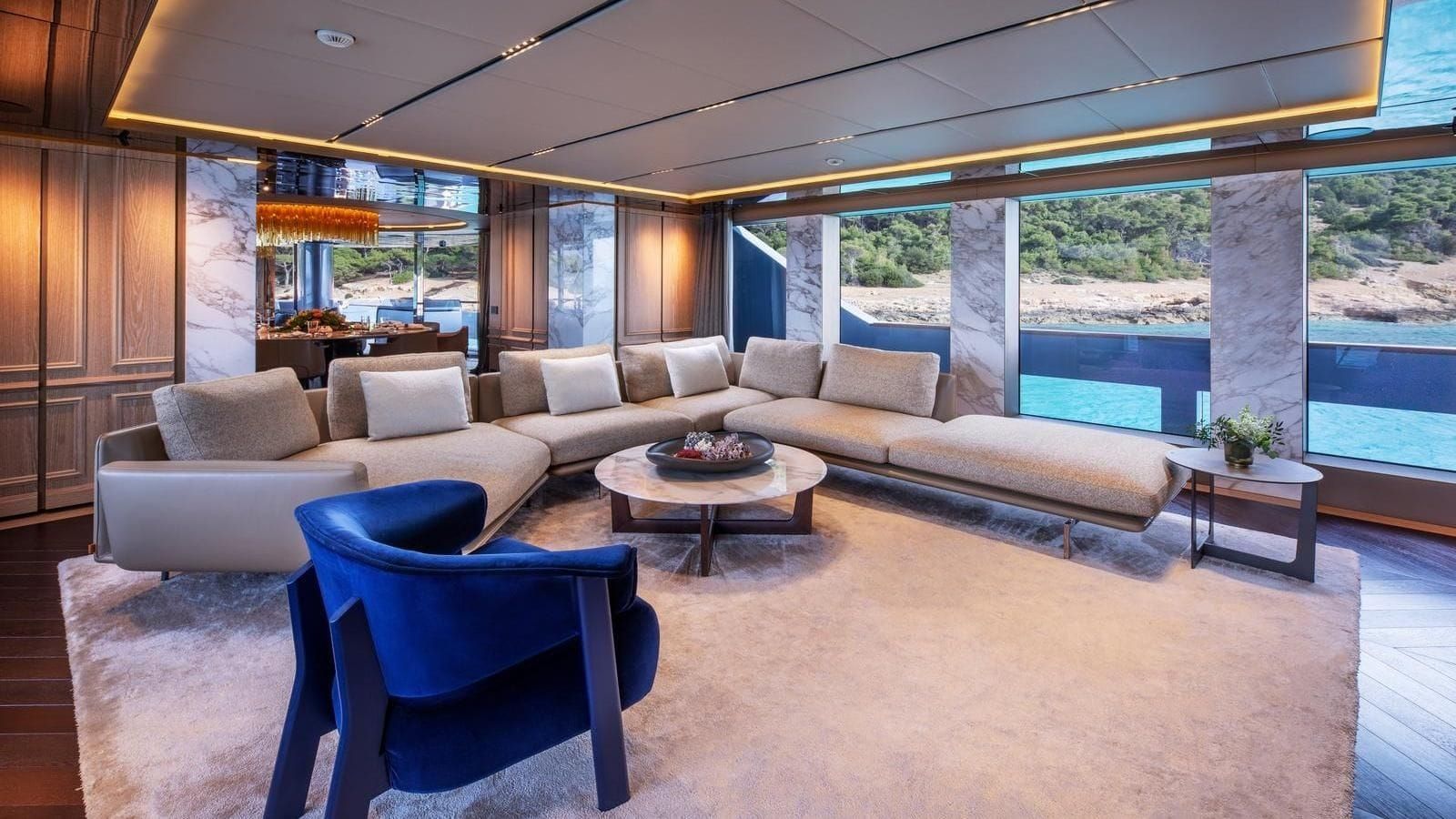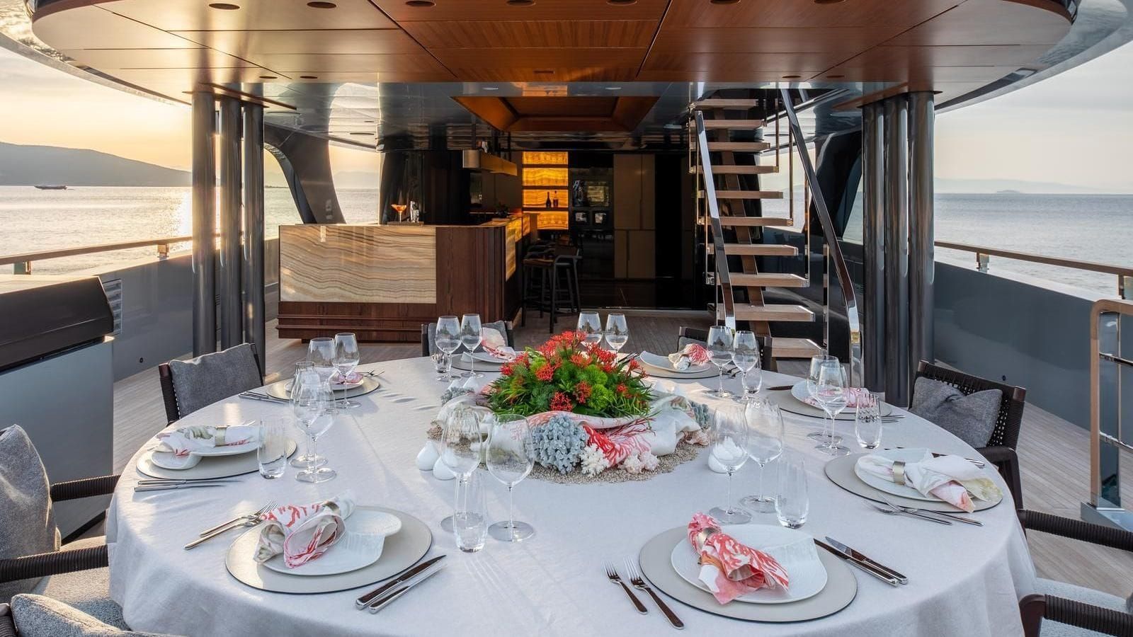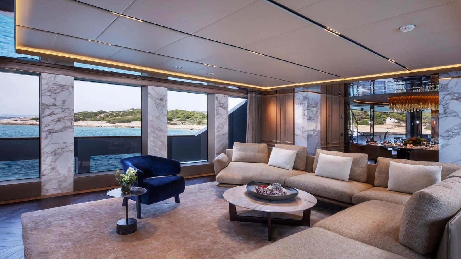 GECO is an award-winning superyacht designed and built by Admiral and honored as the Best Motor Yacht over 40M at the 2021 International Yacht & Aviation Awards. Its striking design is complemented by expansive windows that flood the interior with natural light. Luxurious materials like leather, light woods, marble, and hardwood floors are used throughout, creating a sophisticated yet comfortable atmosphere. The serene main salon features lounge seating and an entertainment system, while the private dining room, with its elegant chandelier, offers an intimate setting for shared meals. On the upper deck, a second salon flows seamlessly into the Buddha Bar, perfect for relaxed socializing indoors or outdoors.