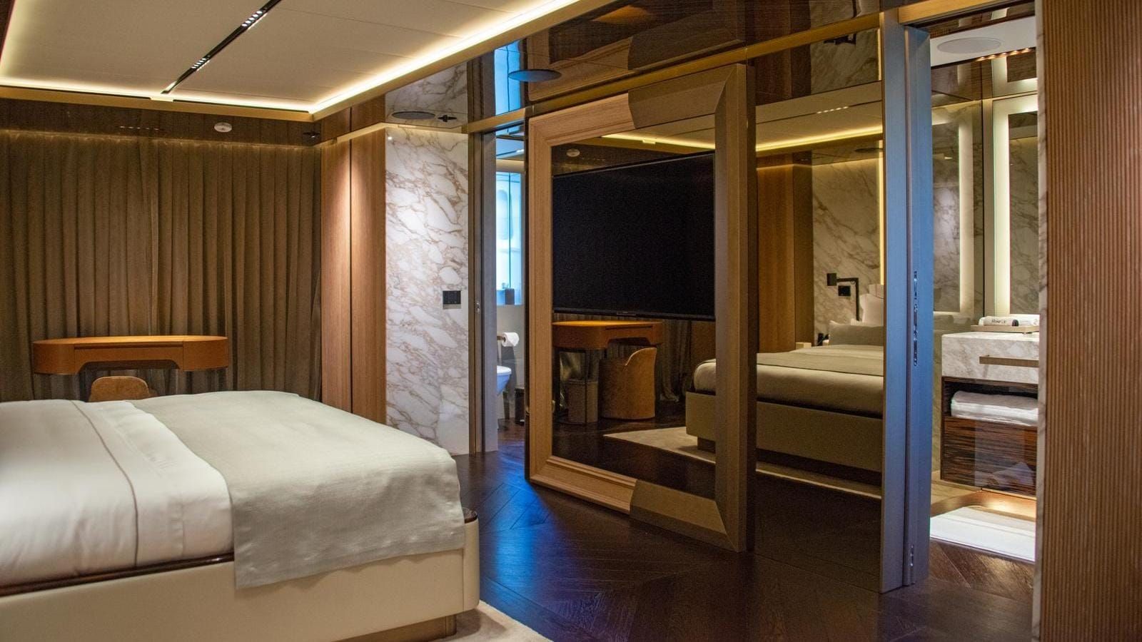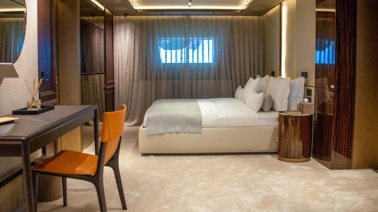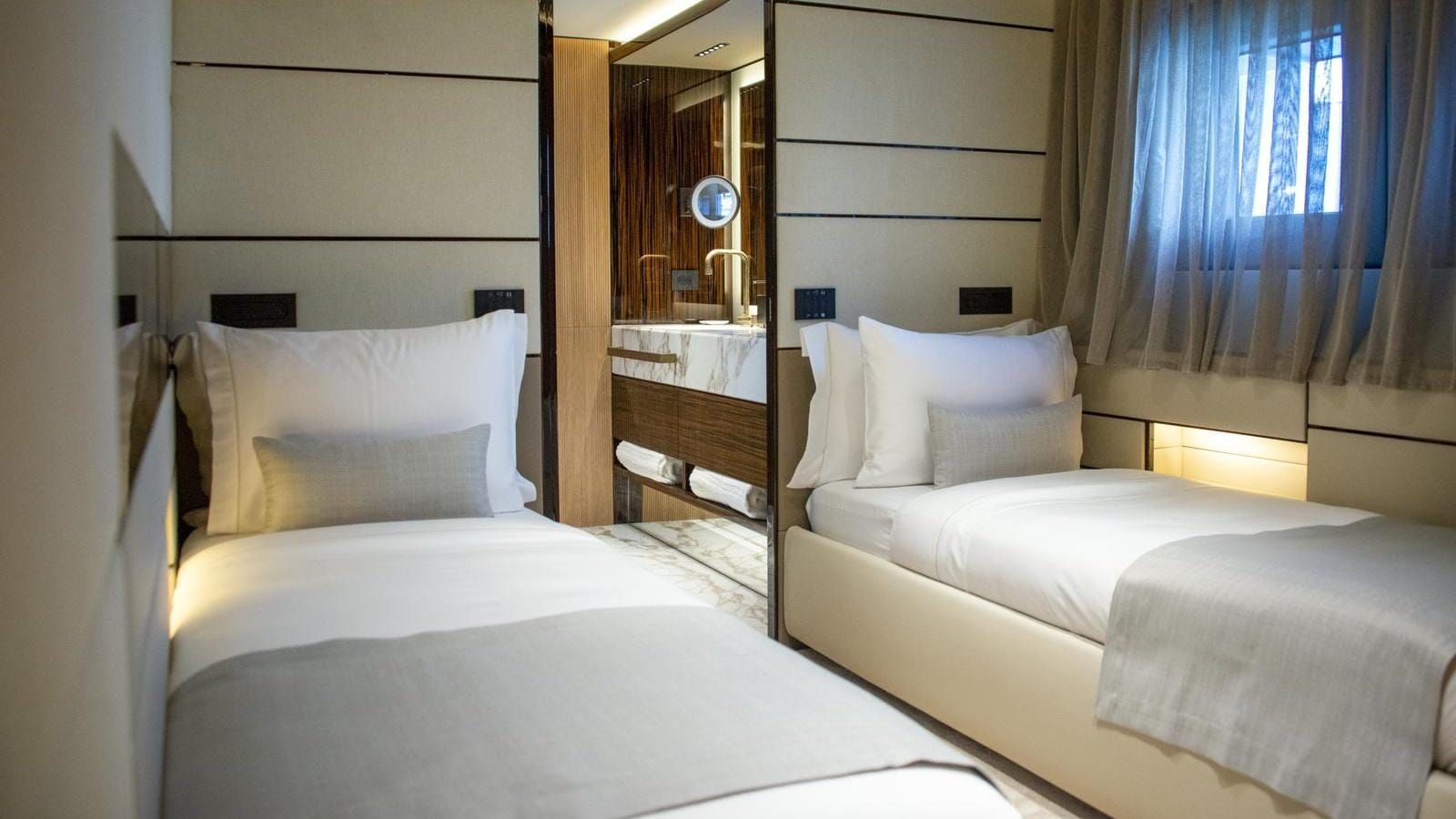 The yacht accommodates 12 guests in six spacious cabins, featuring a master cabin, a full-beam VIP suite, two double cabins, and two twins with Pullmans. The impressive cabin volume ensures comfort for all, with guest areas connected by a glass-walled staircase and an art-filled main foyer. Accommodation for a crew of 13 means the yacht is well-equipped for world-class service with an impressive crew-to-guest ratio.