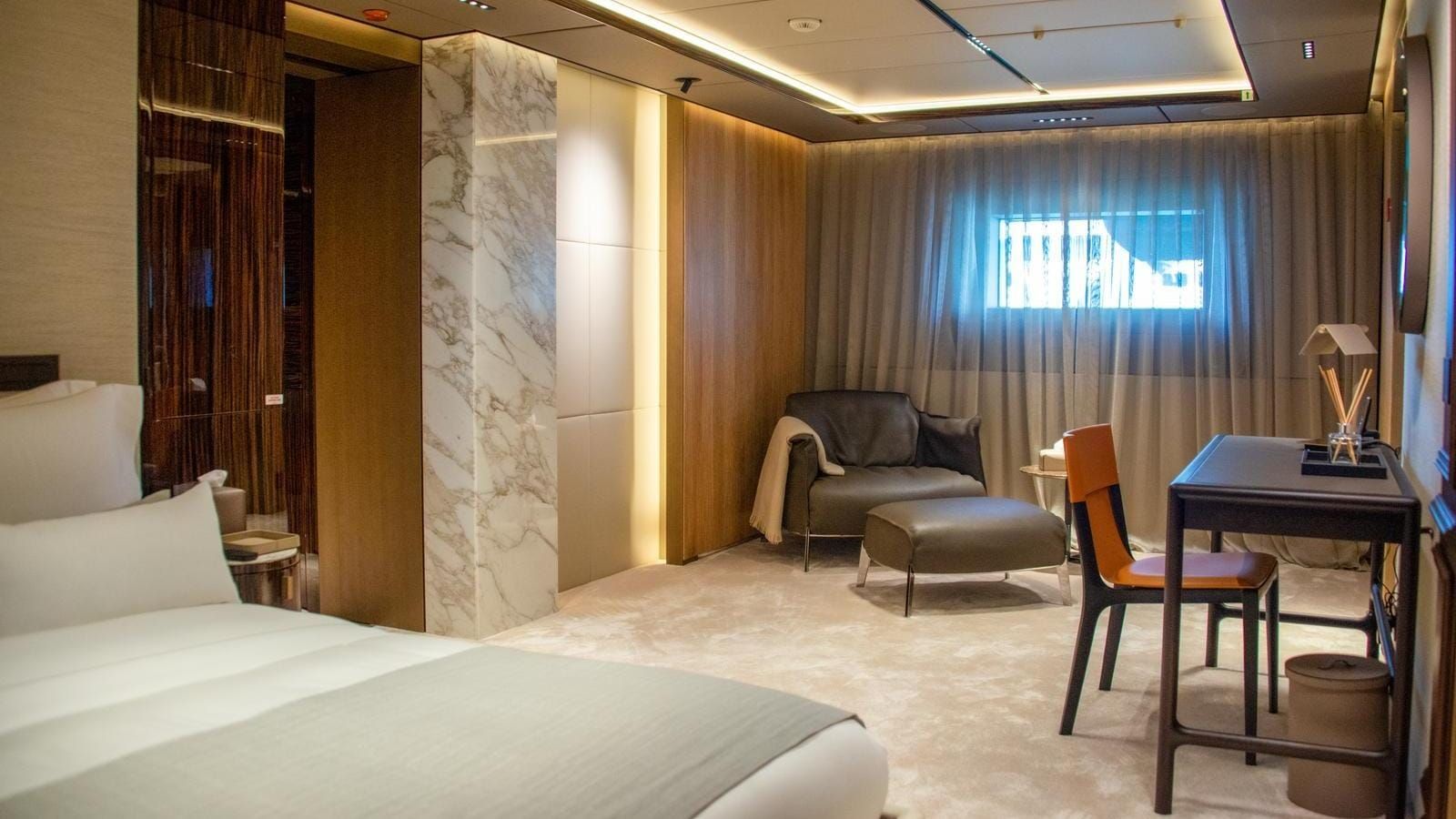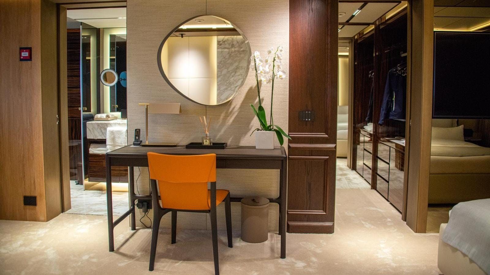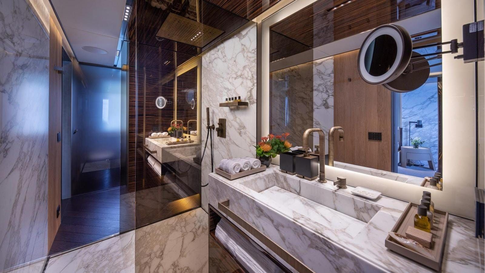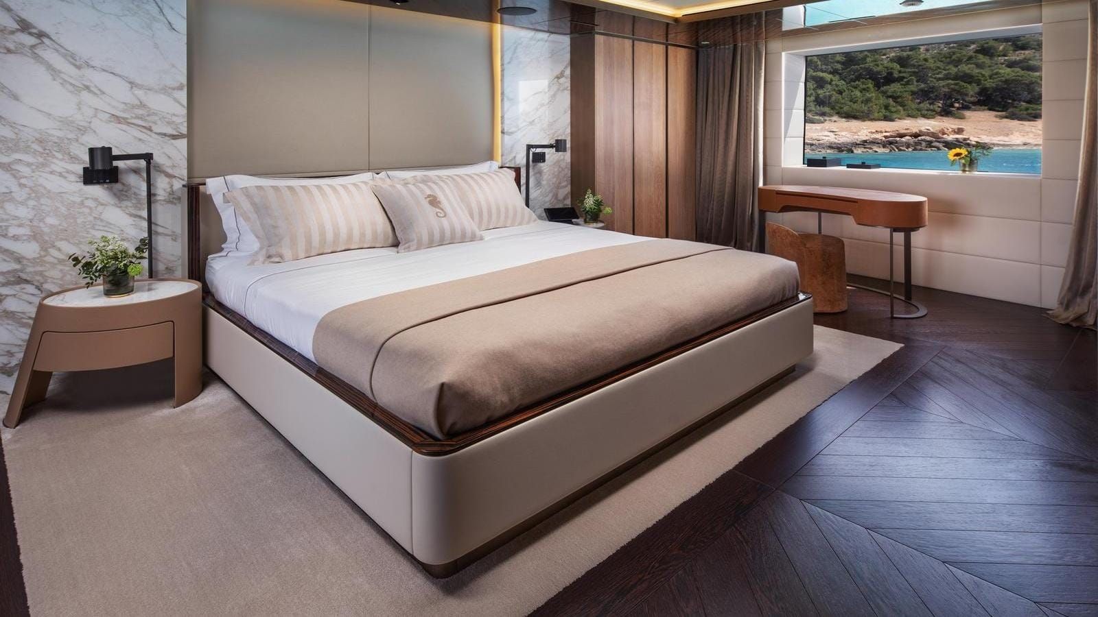 The yacht accommodates 12 guests in six spacious cabins, featuring a master cabin, a full-beam VIP suite, two double cabins, and two twins with Pullmans. The impressive cabin volume ensures comfort for all, with guest areas connected by a glass-walled staircase and an art-filled main foyer. Accommodation for a crew of 13 means the yacht is well-equipped for world-class service with an impressive crew-to-guest ratio.