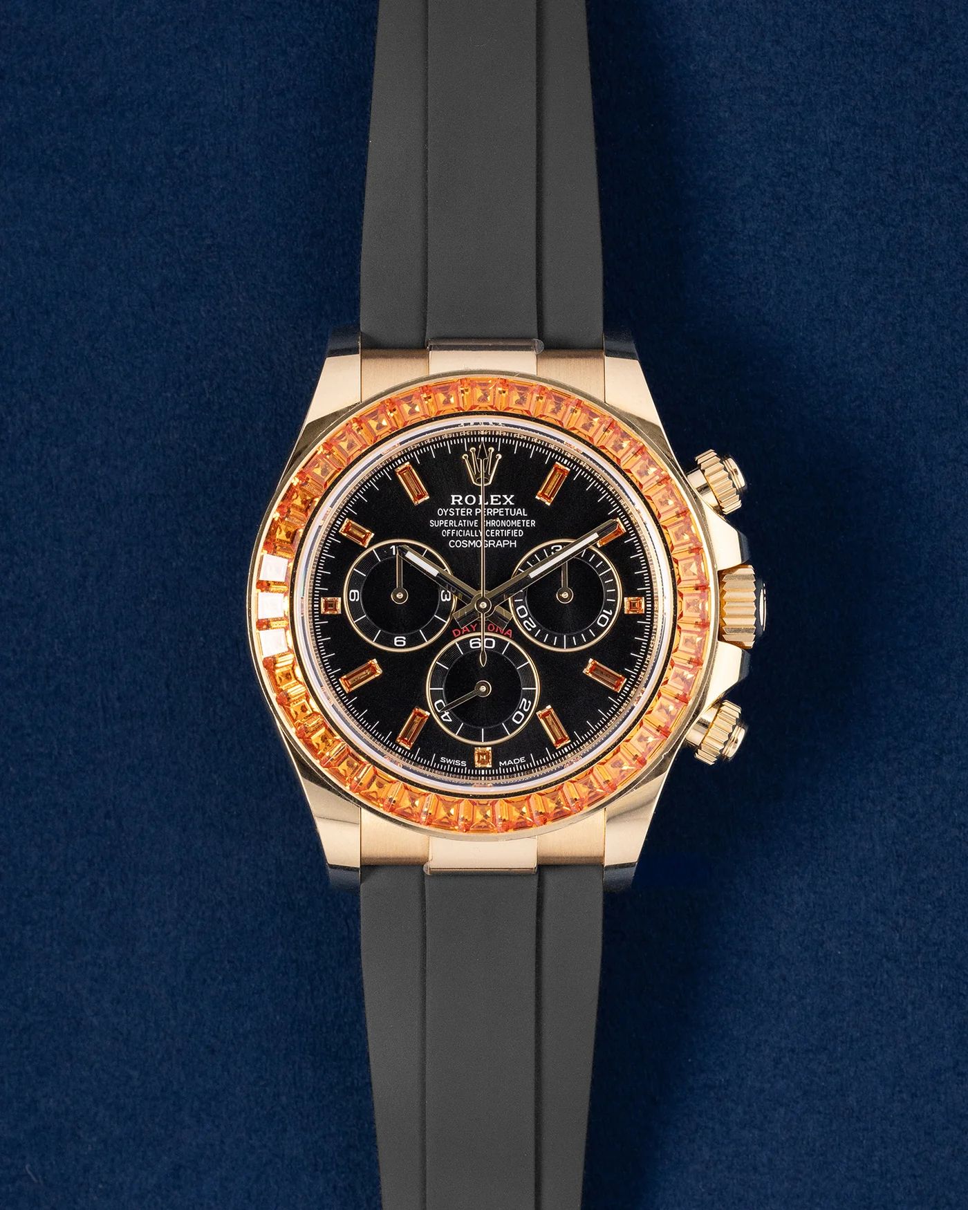 Rolex Daytona 116588SACO PRICE: $326,025.00 The Rolex Daytona 116588SACO is a masterpiece in motion with its solid 40mm yellow gold and square-cut orange sapphire-set bezel. The black dial keeps it clean but striking, featuring luminous gold hands and baguette-cut orange sapphire hour markers that catch light at every angle. Secured with an Oysterflex strap, this Rolex watch is powered by the legendary caliber 4130 automatic movement, packing a 72-hour power reserve. A sport watch that keeps you on time and in style. DETAILS Brand: Rolex Model: Daytona Reference: 116588SACO Case Material: Yellow Gold (YG) Bracelet Material: Oyster-Flex Size: 40mm Dial Color: Black Bezel Material: Orange Sapphire Date: 2020 Condition: Pre-Owned Included Items: Watch with original box and papers Movement: 4130 Crystal: Sapphire Crystal Water Resistance: 10 ATM Stock ID: 0538Z ——— Grand Caliber SHOWROOM 2811 McKinney Ave. Suite 260, Dallas, TX 75204, United States Phone: +1 214-225-7198 Email: info@grandcaliber.com