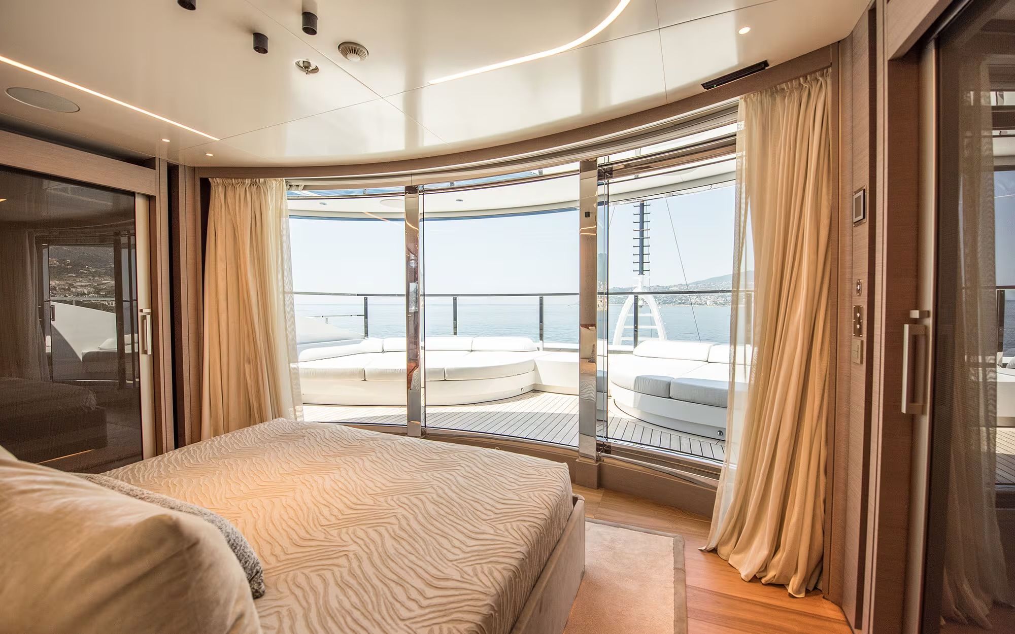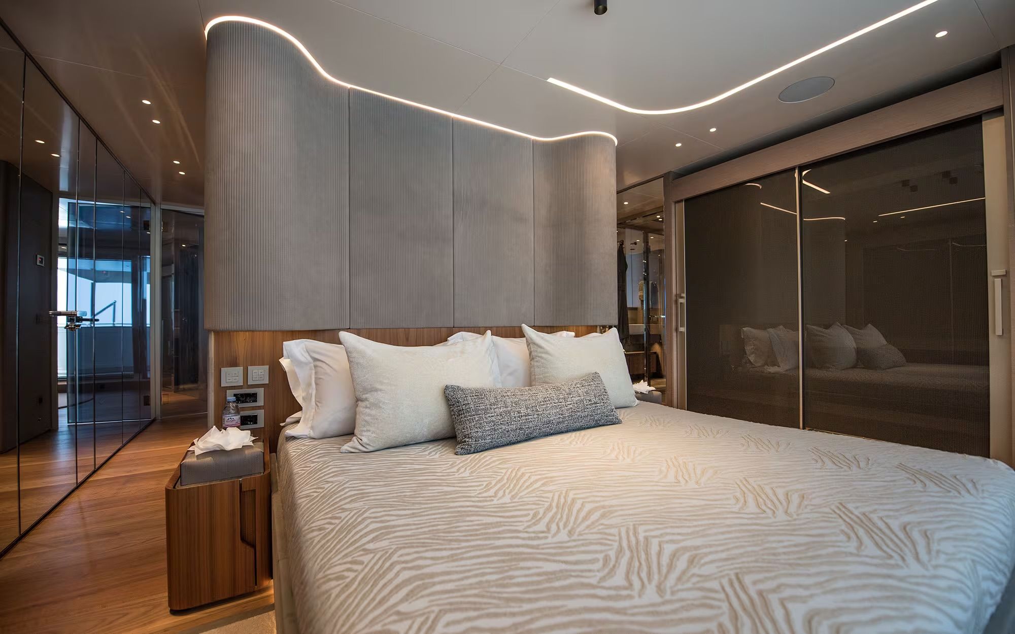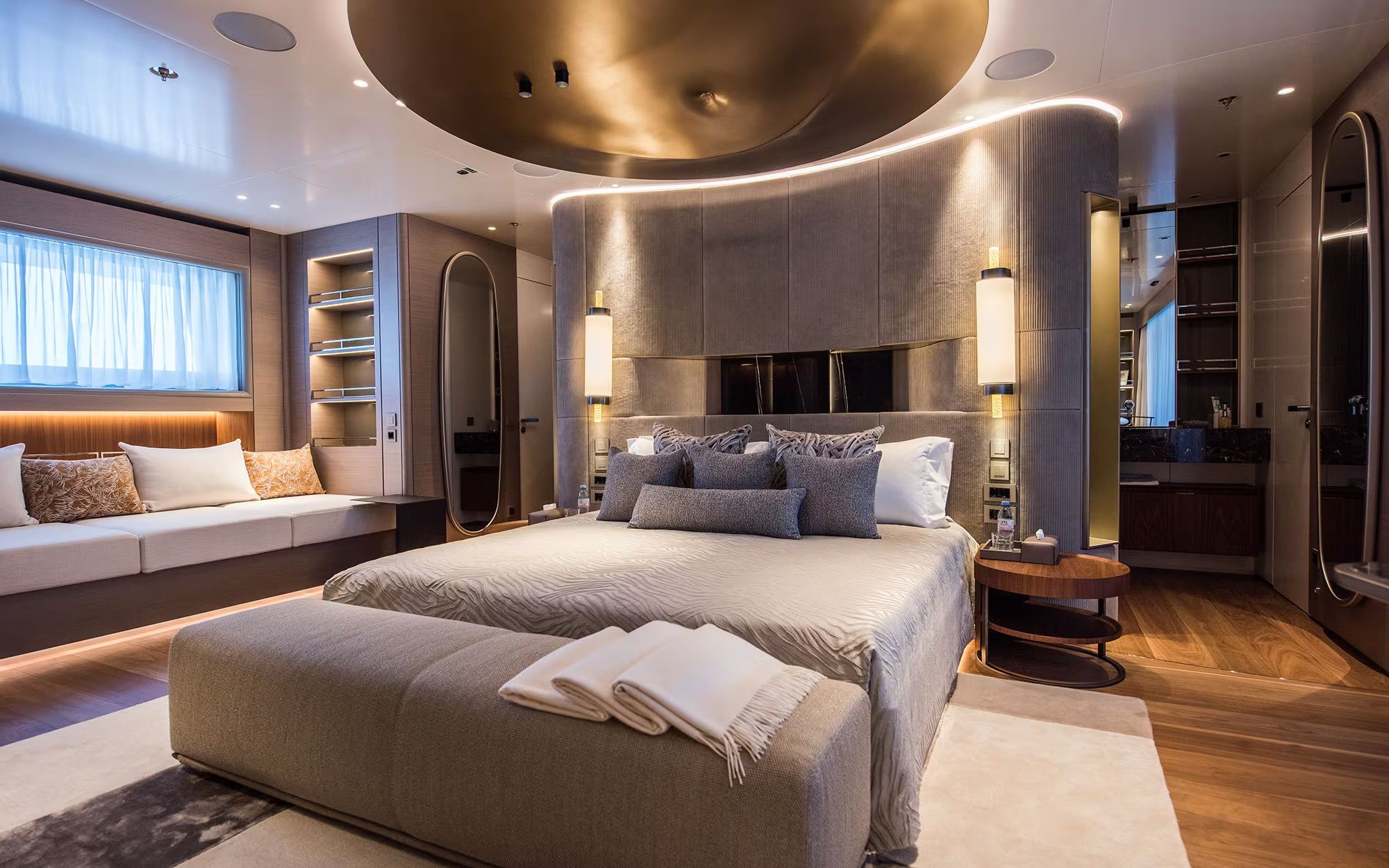 The Owner’s suite is located on the Main Deck forward and benefits from exceptional privacy. A private balcony invites morning coffees with ocean views, while the suite itself includes two walk-in wardrobes and a full-beam marble bathroom with a walk-through shower. The design balances sophistication with everyday practicality, catering to both relaxed living and formal entertaining.