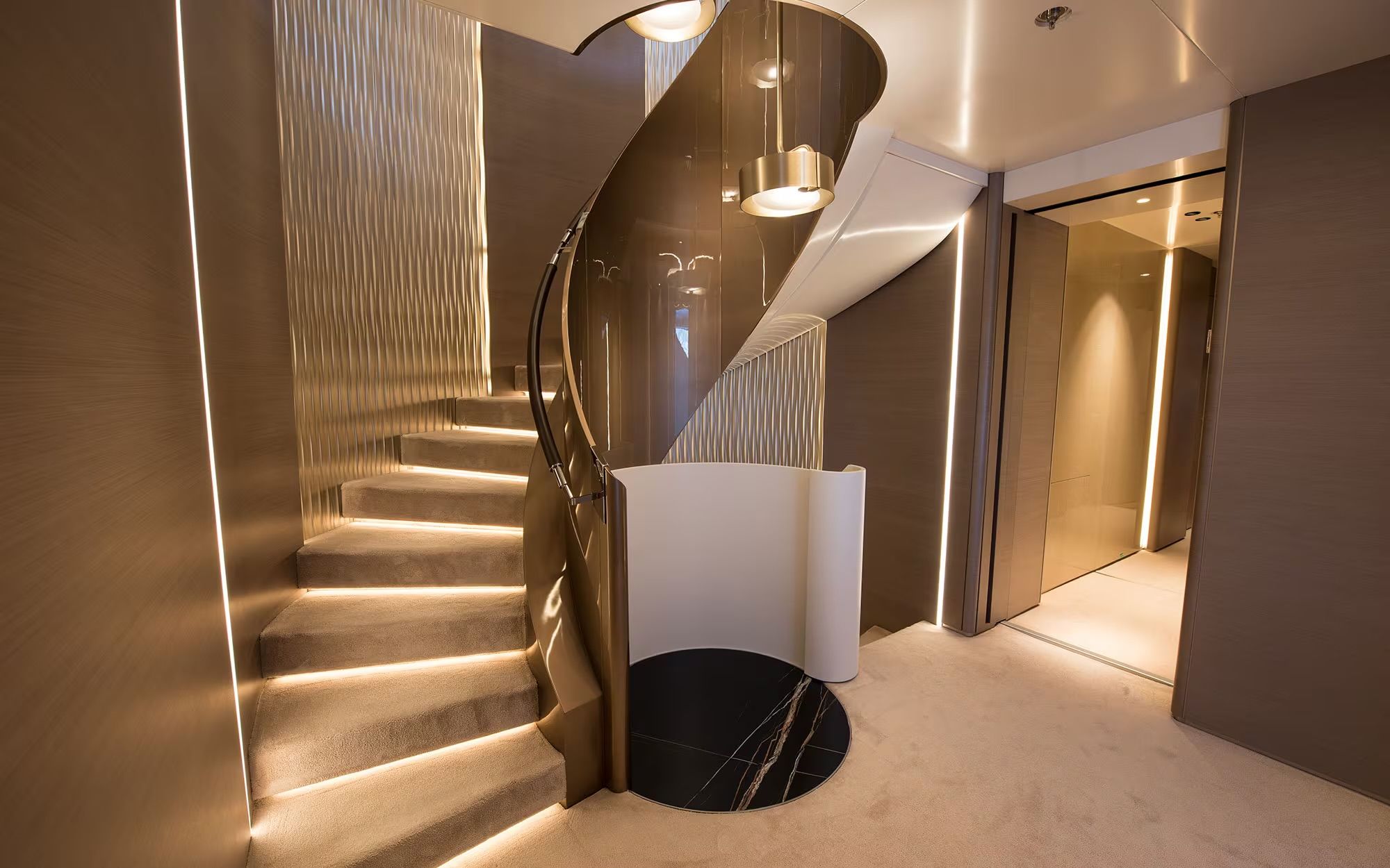 High ceilings – including a notable net height of 2.35 metres – contribute to the sense of volume and ease. These generous proportions are particularly evident on the Main Deck, where the central helical staircase provides a sculptural focal point that connects each deck seamlessly.