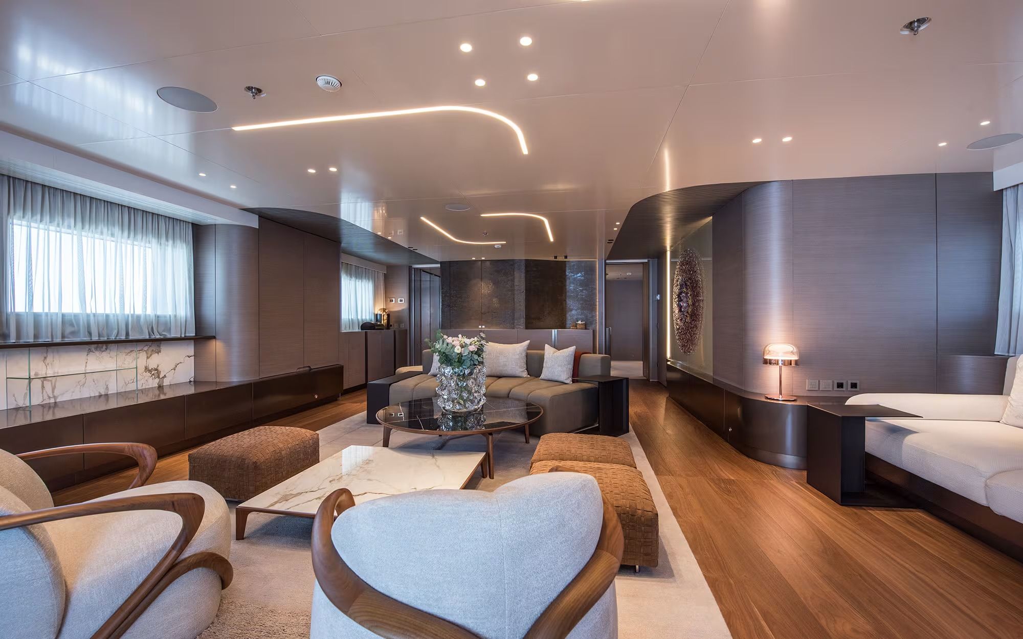 The main salon and adjoining formal dining area serve as the social heart of the yacht. Large windows flood the space with natural light, while furnishings are arranged to encourage conversation and connection. On the upper deck, a multifunctional lounge adapts to suit a variety of uses, from casual family time to a private cinema or cocktail bar setup.