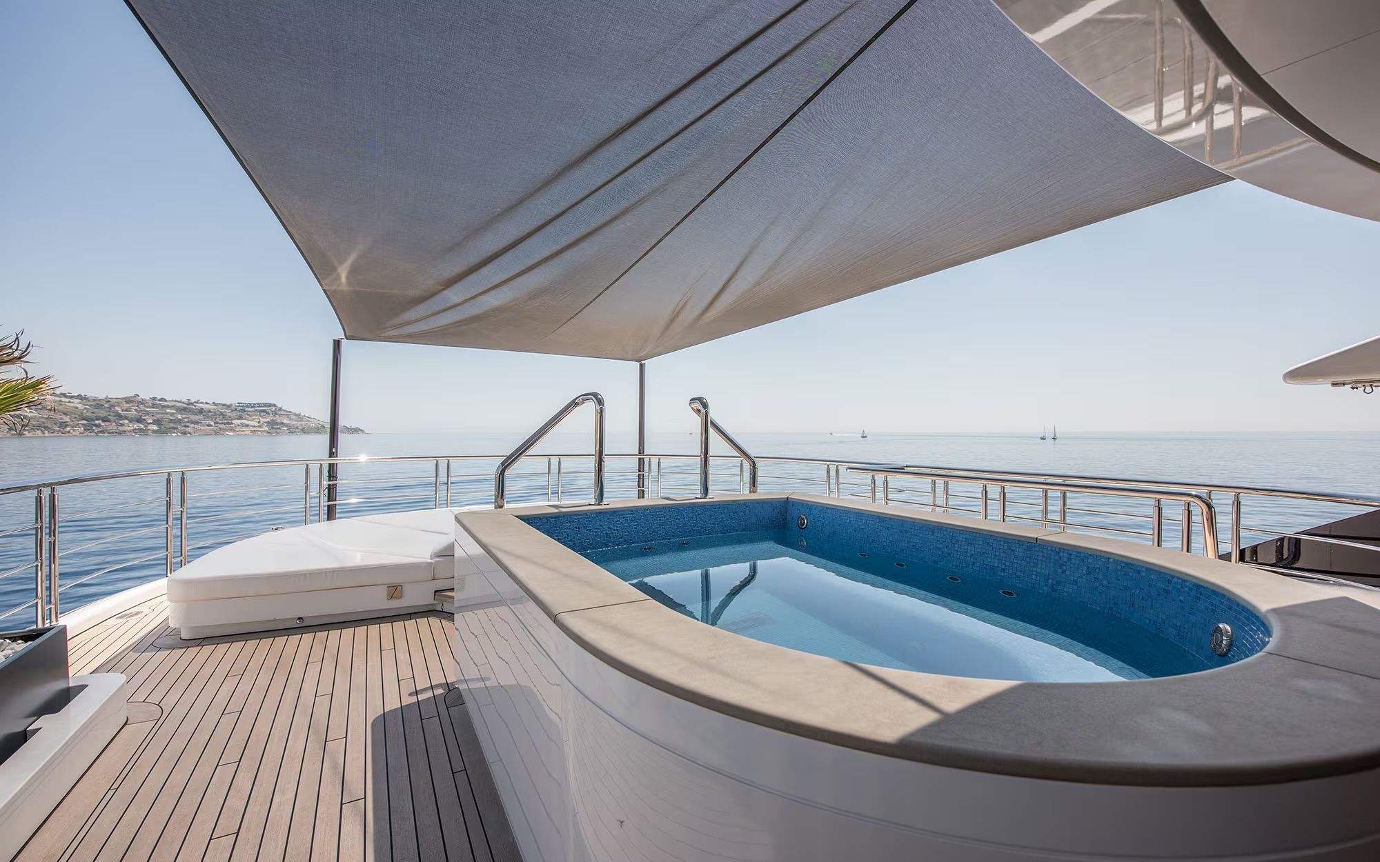 The flybridge, a standout feature, offers a panoramic VIP suite with its own balcony – a unique touch that adds privacy and a sense of exclusivity. This area also includes a sundeck and an outdoor Jacuzzi, perfect for relaxing in the sun or unwinding after a day of exploration.