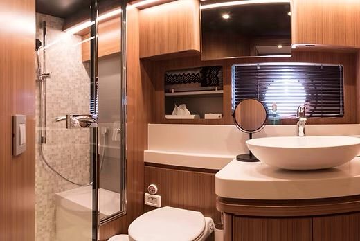 The 68 has a beautiful open layout - with 360 degree panoramic views in the saloon. Sit on the sofa, watch a movie, drink a glass of wine, enjoy indoor dinners and a homely feel. The indoor saloon combines seamlessly with the outdoor dining area through fully opening doors and an electric retractable window.