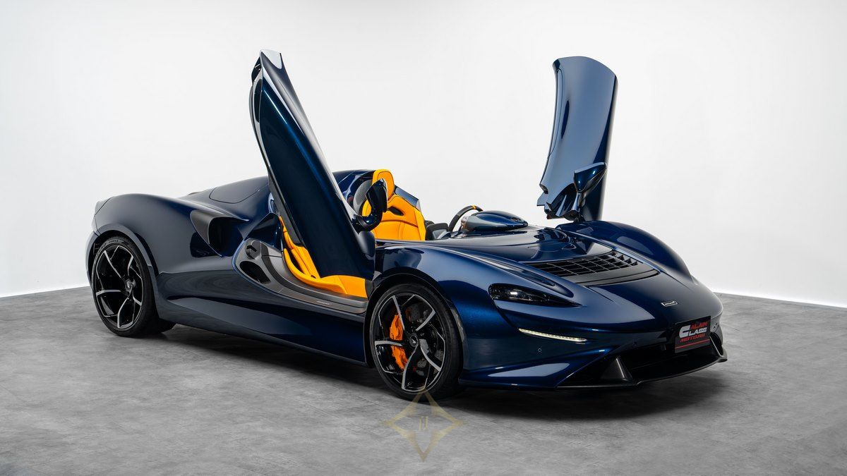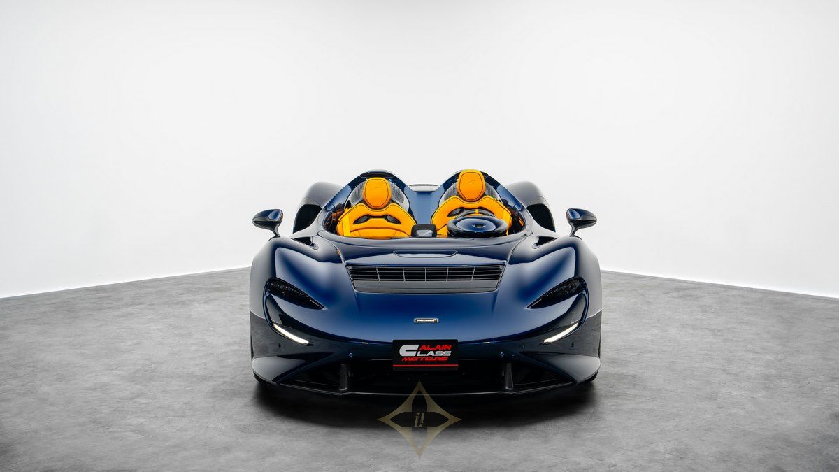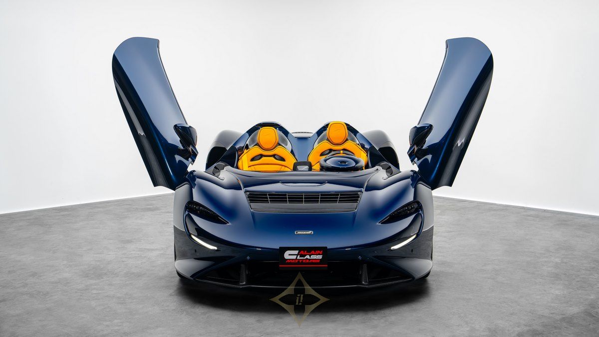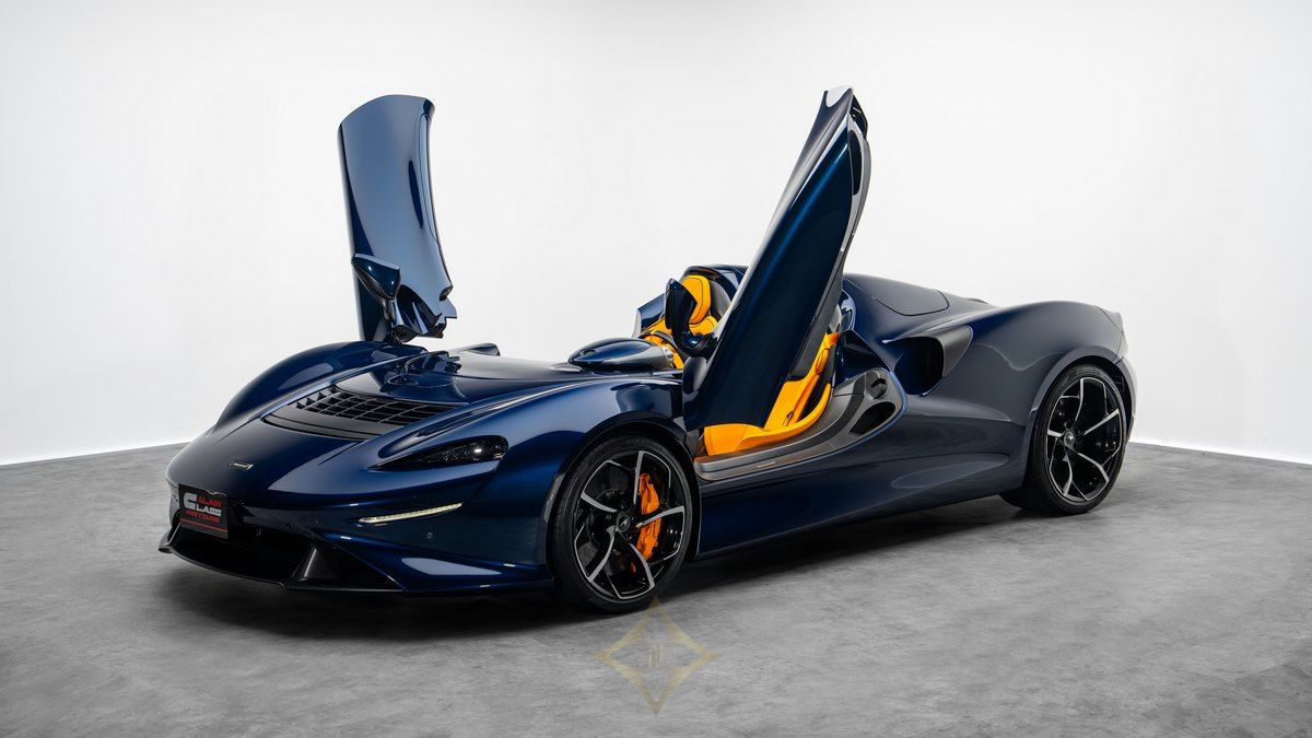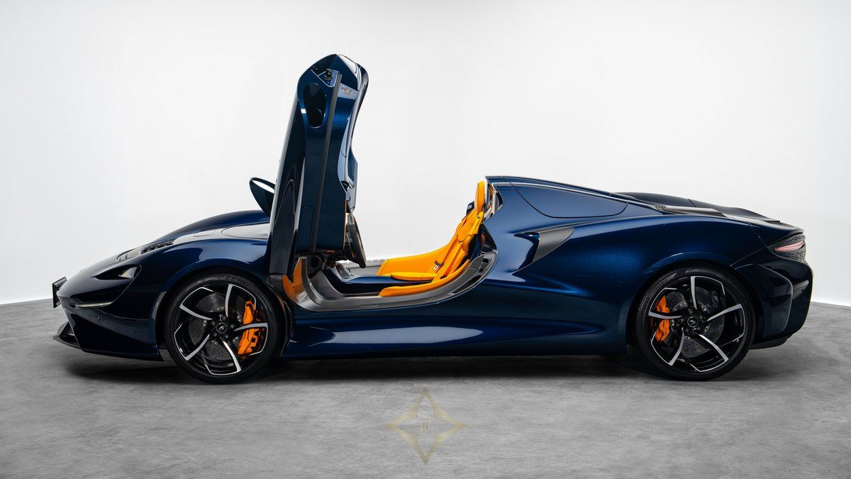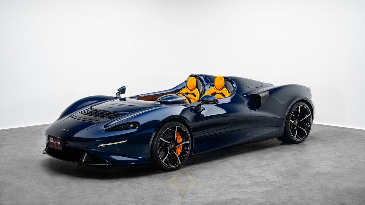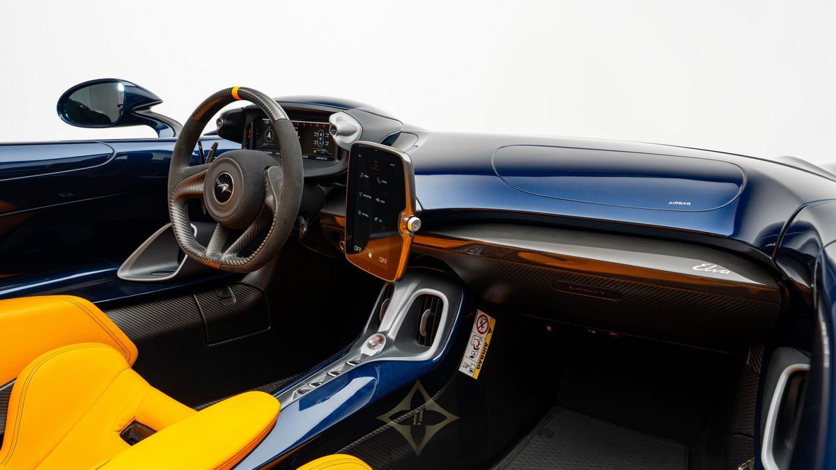 McLaren Elva, a 2021 model showing only 1,147 km. This example comes in a Blue exterior paired with an Orange interior, a striking configuration that underlines the car’s ethos as part of McLaren’s Ultimate Series. The Elva is defined by its open-cockpit design without a windshield, relying instead on McLaren’s Active Air Management System to channel airflow over the cabin, ensuring a unique connection between the driver, machine, and environment.