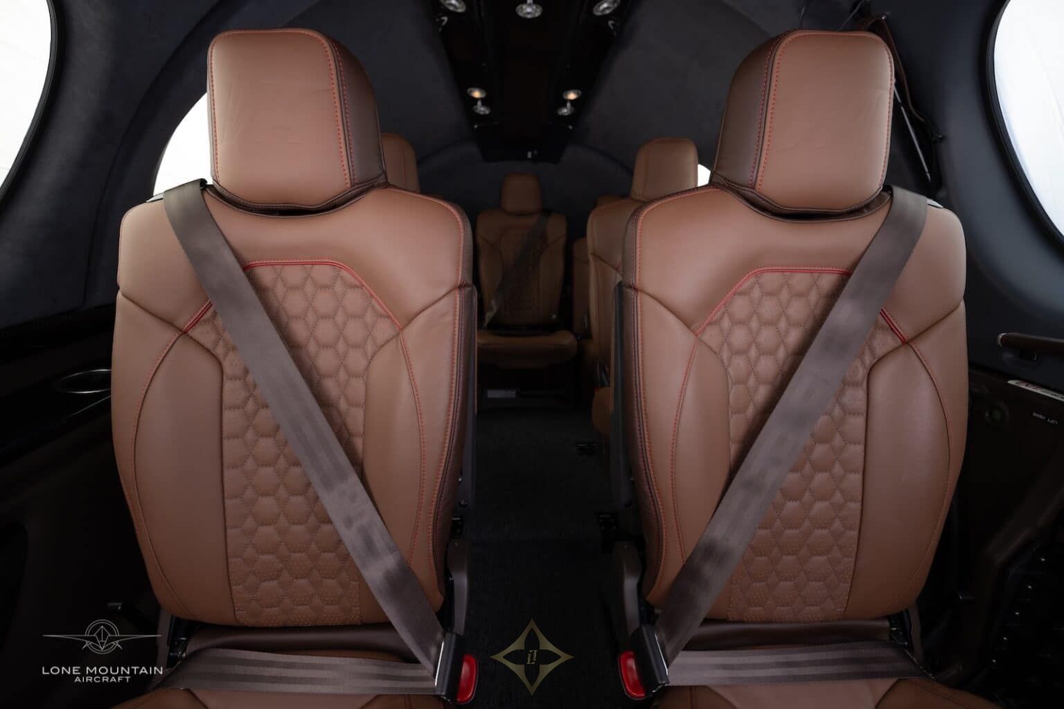 Interior with executive seating and center console included. Brown premium leather seats with red accents. Cross country seats included.