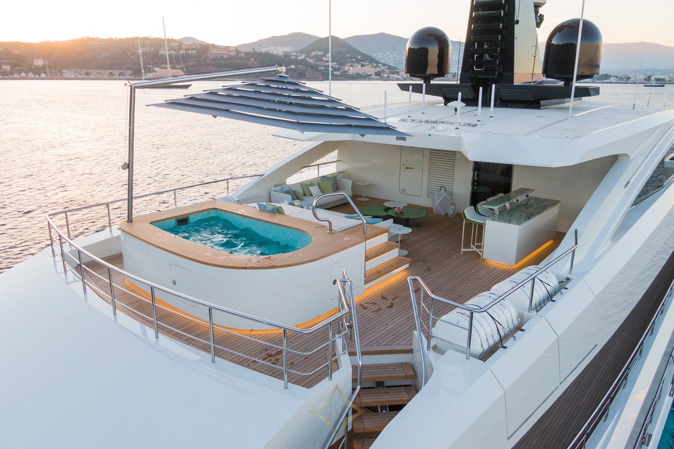 Her outdoor spaces are vast and versatile with options for lounging and entertaining in each area, including a private foredeck area, forward of the master suite. Whether it’s the jacuzzi and al fresco dining for 12 on the owner’s deck, or the pool on the sundeck, she has a lot to offer. RIO has a bar on each floor, that comes complete with rare marbles from all over the world.