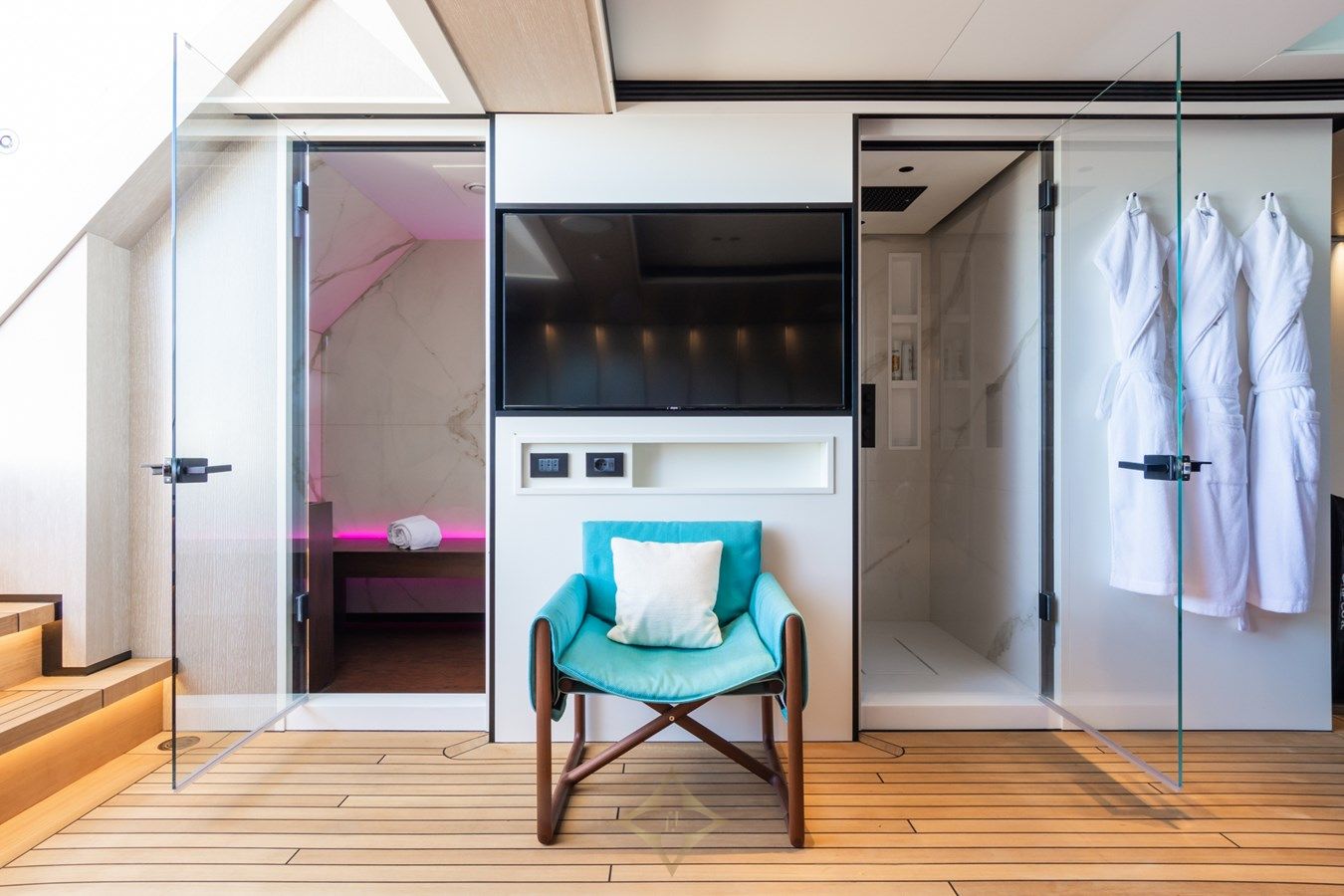 RIO accommodates 12 guests across 6 cabins, of which 3 are full beam, unusual for vessels in this size category - a master suite on the owner’s deck, main deck VIP and lower deck VIP. The master suite includes an owner's office, large dressing room area and his and hers bathrooms.