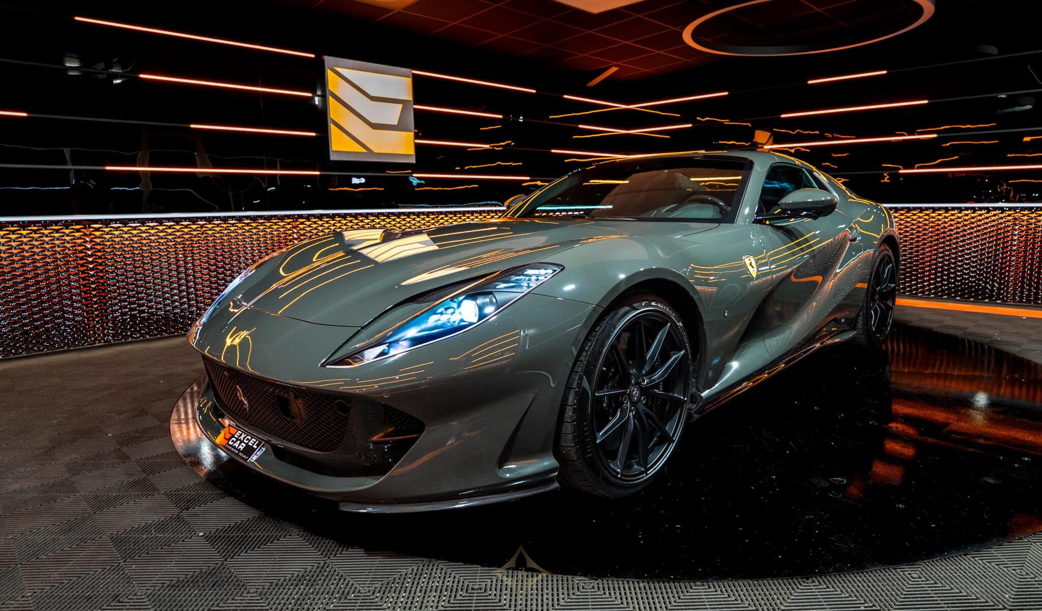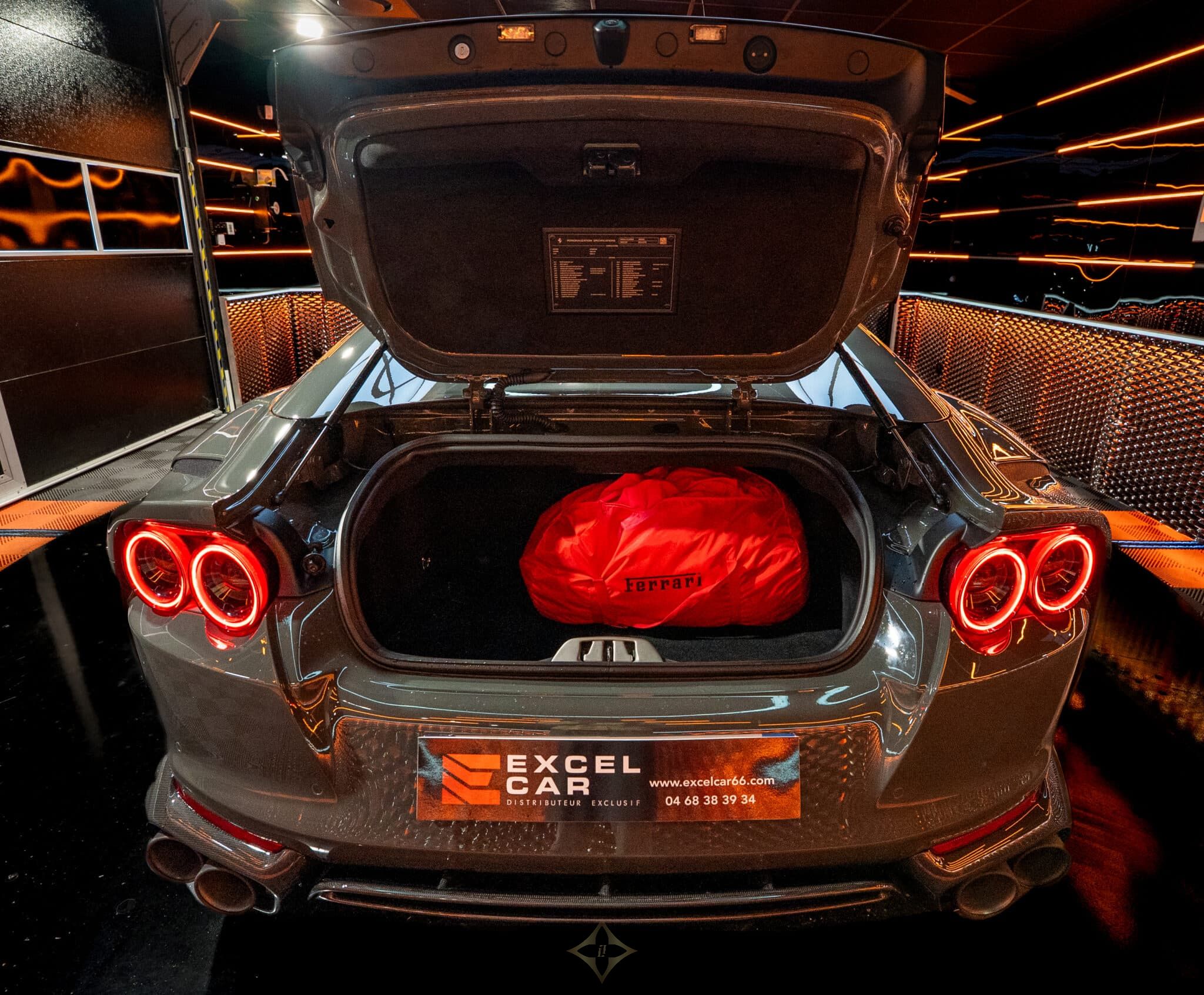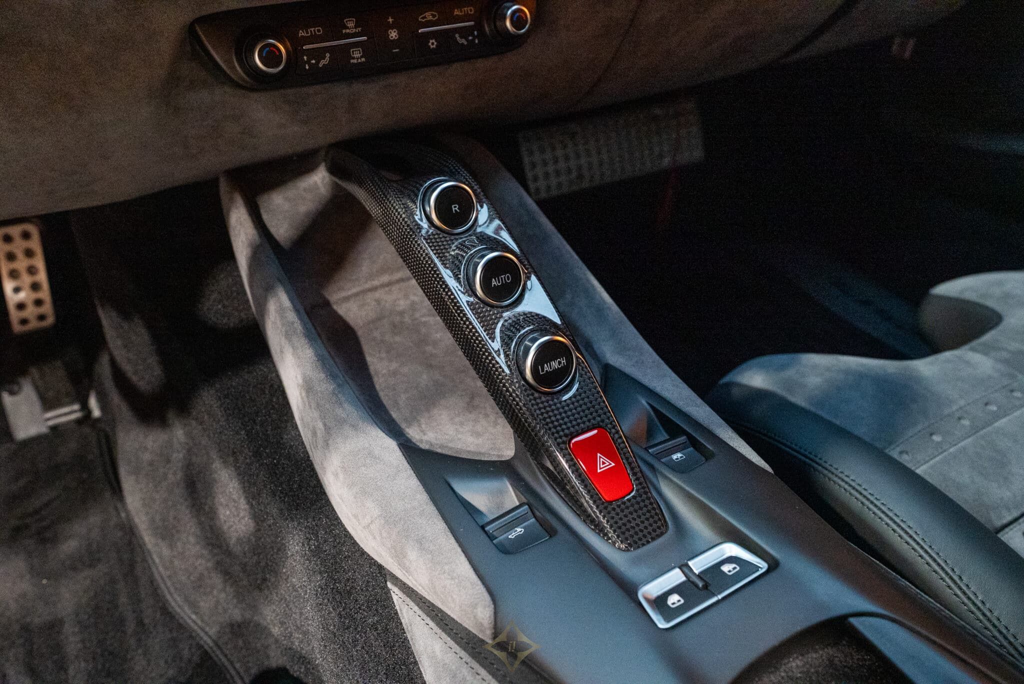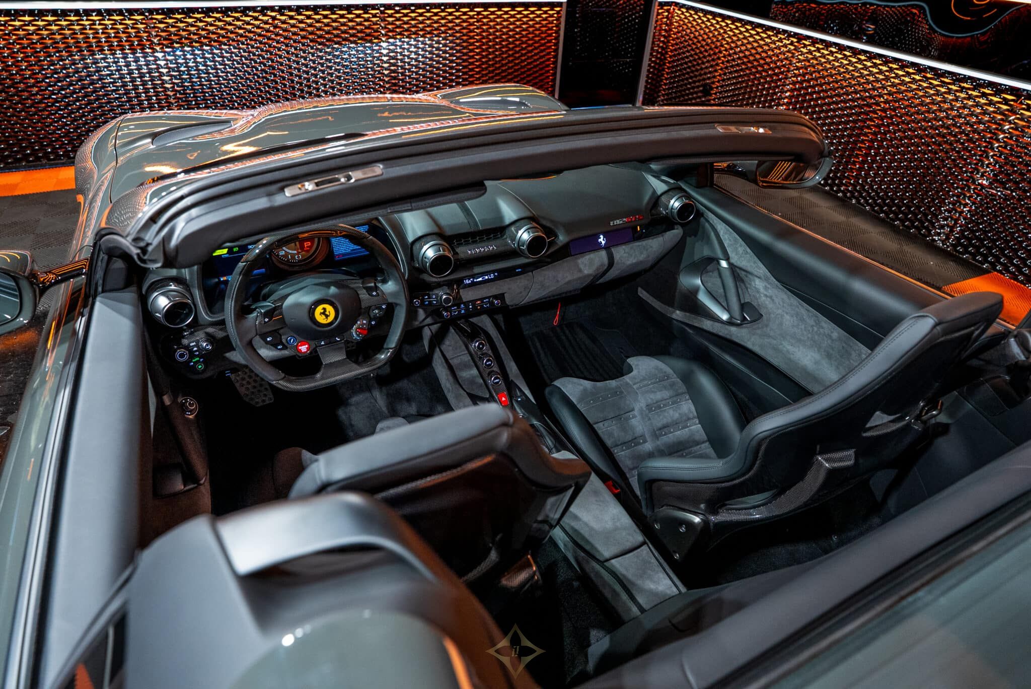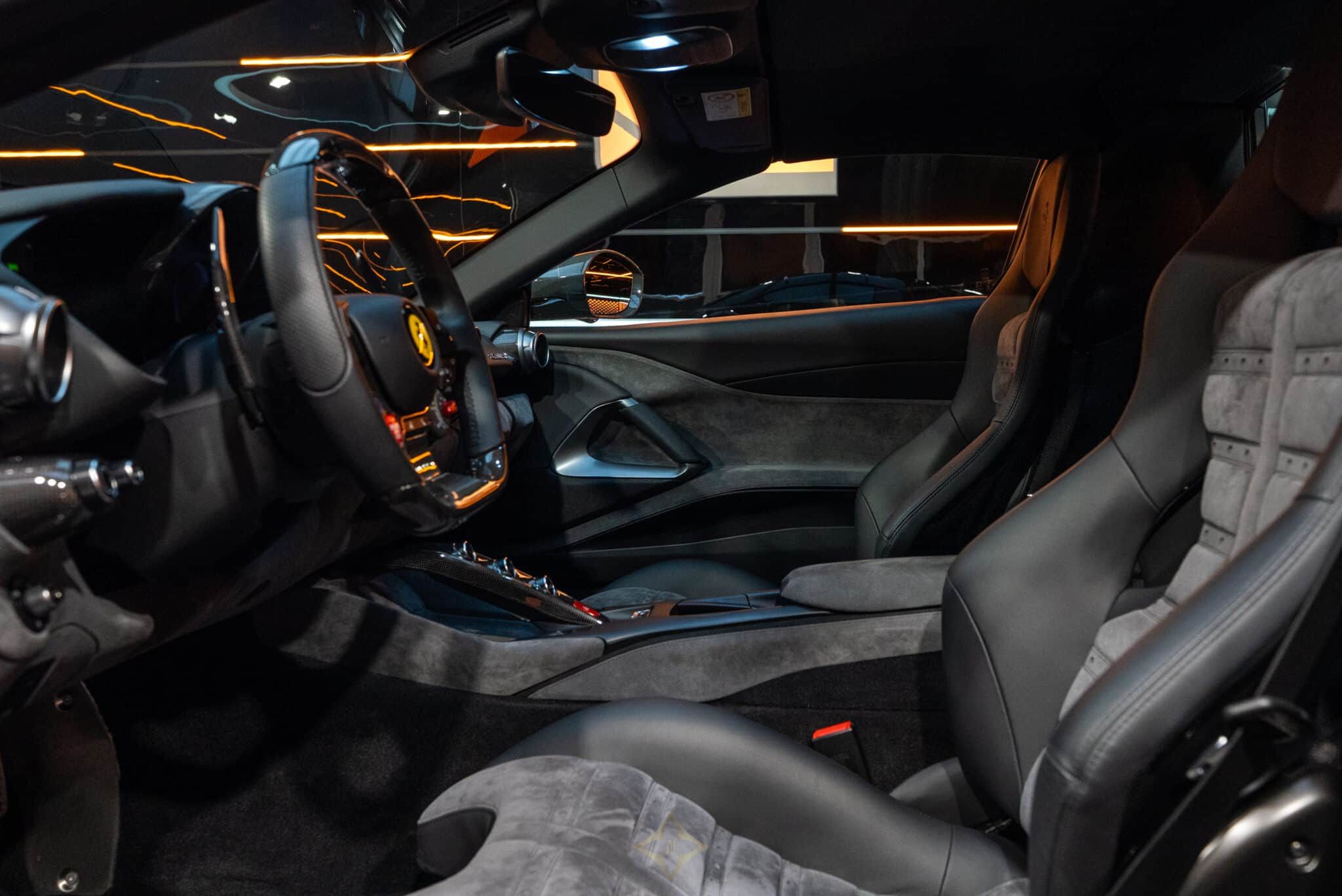 SURR 360° panoramic view - STC1 Standard color stitching on the entire vehicle (Nero 4000) - SNDB High-performance Hi-Fi system - RSFR Matte black forged racing rims - RSES RSCD racing seat lifter bucket seats (Large size) - RPMA Aluminum rev counter - Historical Ferrari color (Grigio Scuro) - PDIS Passenger screen - LOGO Scuderia Ferrari shields on the front wings - FLMA Personalized additional mats with logo - FCWS Carbon fiber front spoiler - DATR Carbon fiber dashboard inserts - DSIA Lower part of the Alcantara dashboard (Alcantara Charcoal 7452) - ELEV Suspension lifting system - EMPH Cavallino embroidered elements on the headrests (Nero 4000) - EXAB Black exhaust outlets - ALDT interiors in colored Alcantara (Alcantara Nero 9440) - ALDP Alcantara Door Panels (Alcantara Charcoal 7452) - ALCS Alcantara Center Seat (Alcantara Charcoal 7452) - AFS2 Adaptive Headlights with SBL Function - ACPL Apple CarPlay - ACC1 Front Radar with Distance Control (ACC) - CUPC Carbon Fiber Rim Caps - CTLA Alcantara Center Console (Alcantara Charcoal 7452) - CISK Carbon Fiber Door Sills - CILR Carbon Fiber Dashboard Top - CIDL Carbon Fiber Driver's Area with LEDs - CEXS Carbon Fiber Side Base Cover - CEXD Carbon Fiber Rear Diffuser - CELB Carbon Fiber Rear Shield - CEAI Front Part of the Front Fiber Front Bumper carbon - CALD Brake calipers color Grigio Silverstone - BVEN Black air vents on the dashboard