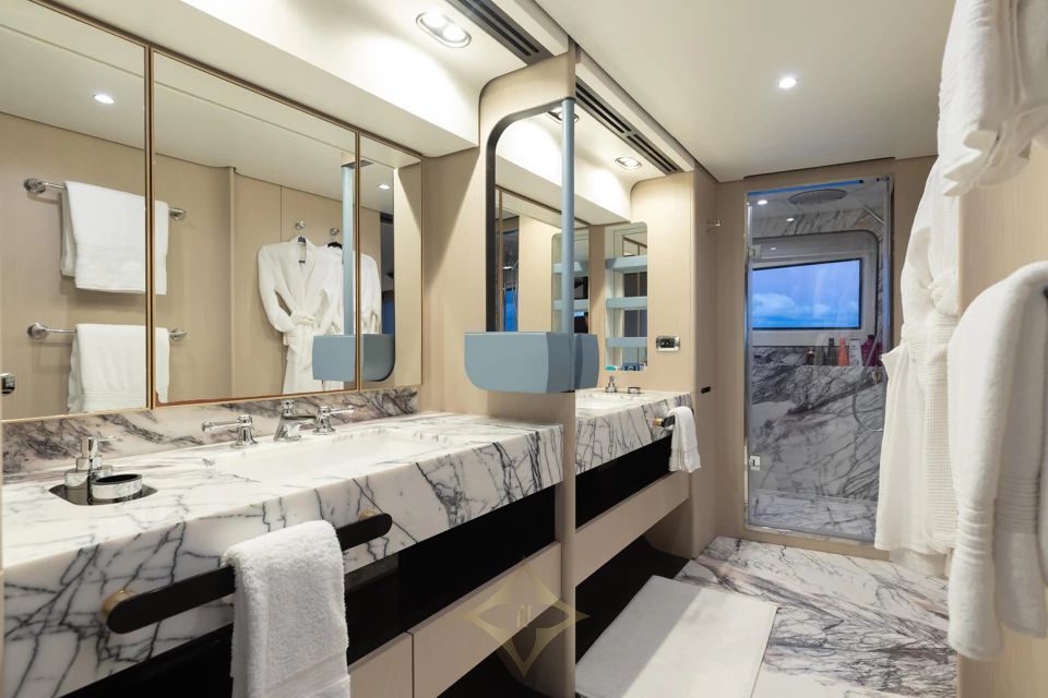 Inside, floor-to-ceiling windows in the main salon and master suite create bright, contemporary living spaces. LA MAMA accommodates up to 10 guests across 5 staterooms, including a full-beam master suite, two double cabins, and two twin cabins, each with a Pullman berth. Accommodations for 5 crew ensure attentive service on board.