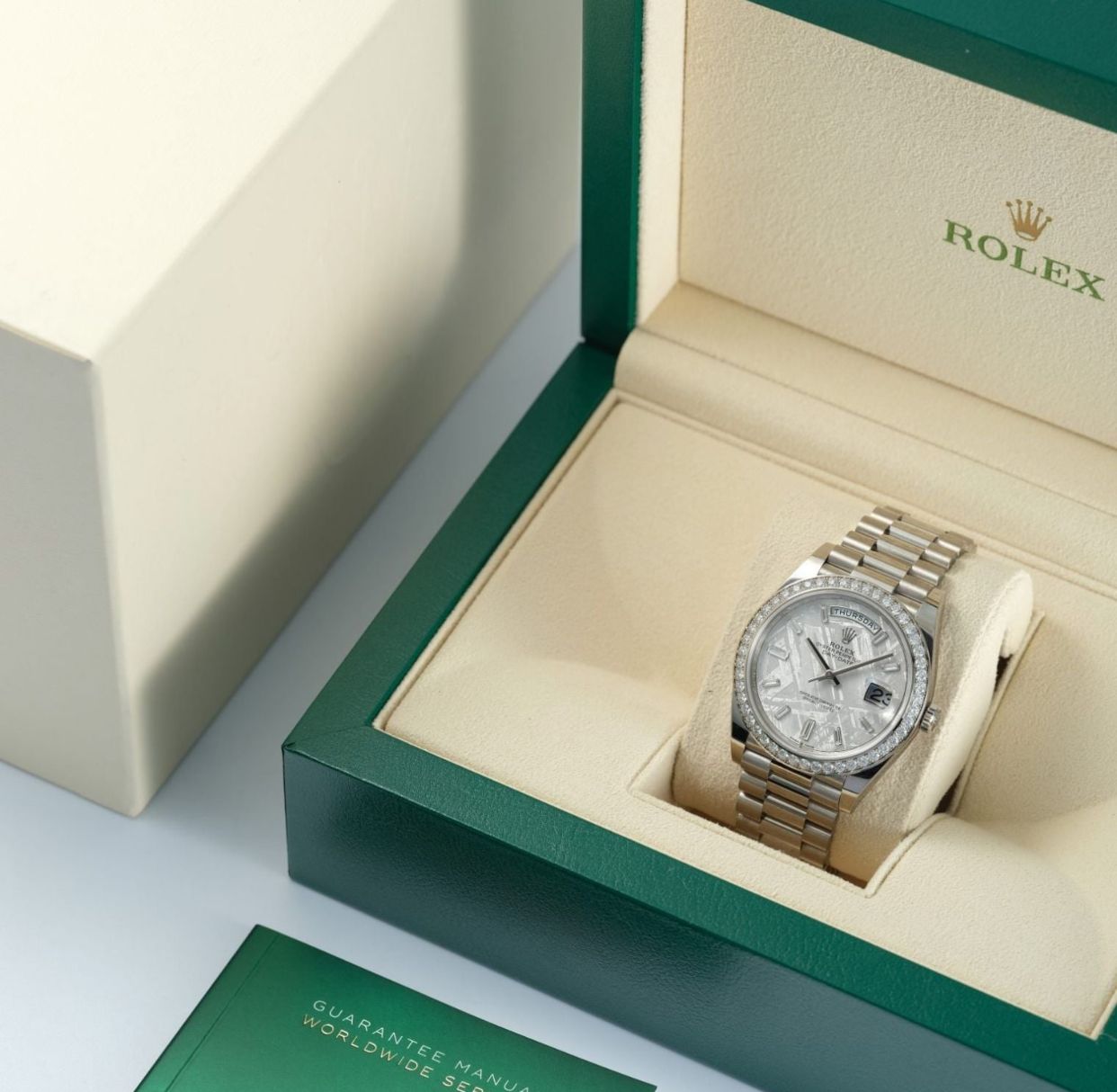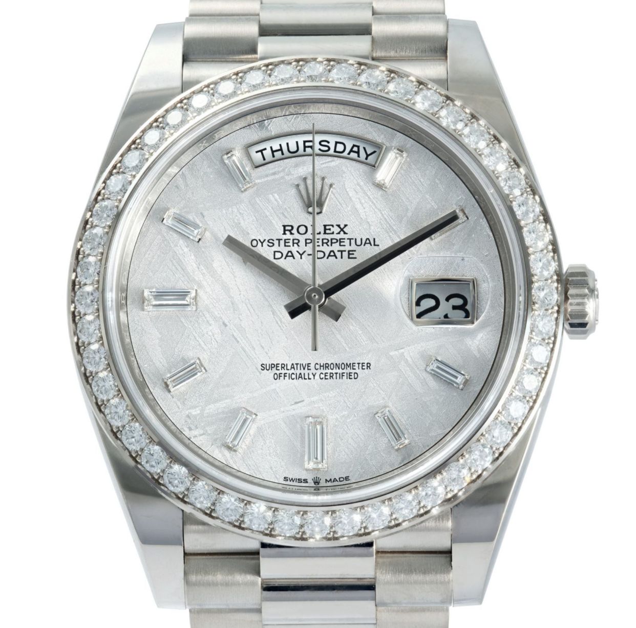 The Rolex Day-Date 40 Ref. 228349RBR embodies prestige in an 18k white gold case and bracelet, distinguished by its diamond-set bezel. Its meteorite dial, accented with diamond hour markers, adds unique natural character to each piece. Powered by Rolex’s chronometer-certified automatic movement and protected by sapphire crystal, it measures 40mm and displays both day and date. From 2022, this example comes complete with box and papers and remains in very good condition.