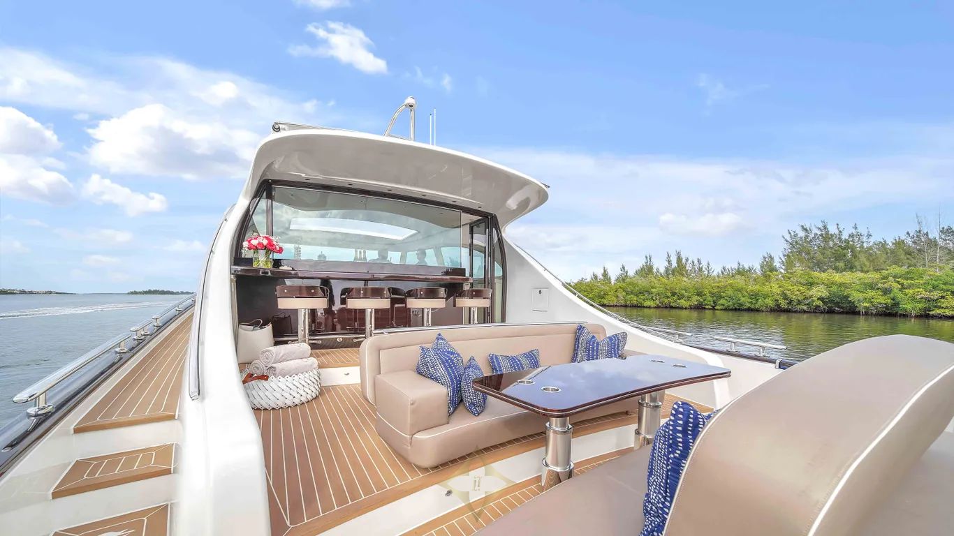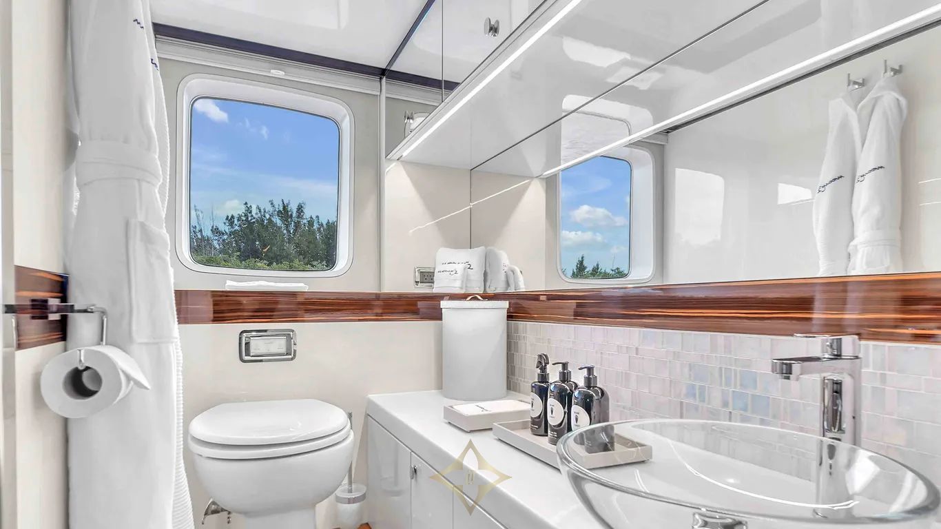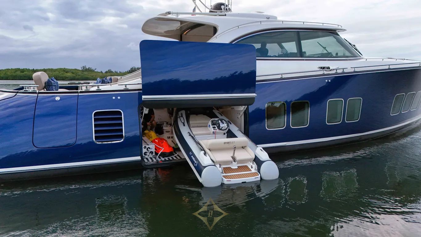 The window separating the bar and the galley goes down and opens up the space and creates a light and airy feeling through out the yacht. The main salon has a large table and wrap around seating. Forward of the main salon is the impressive pilot station. The transom opens and creates a large platform for any water sports or simply lounging in the sun. On the starboard side a water tight door opens to allow access to the tender garage. The tender is launched easily by one person.