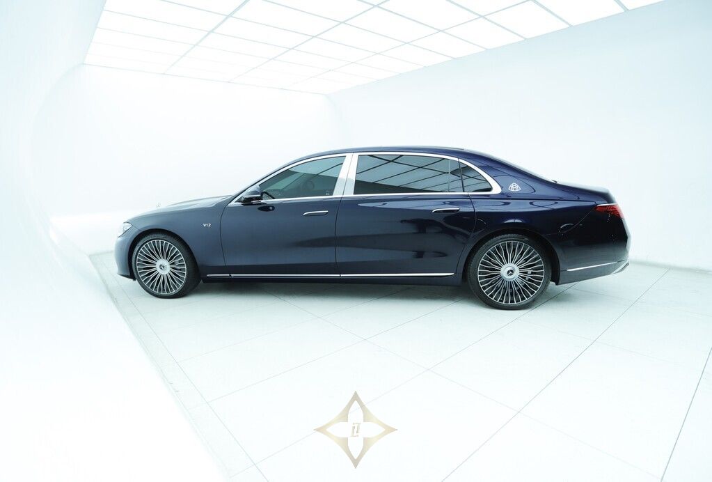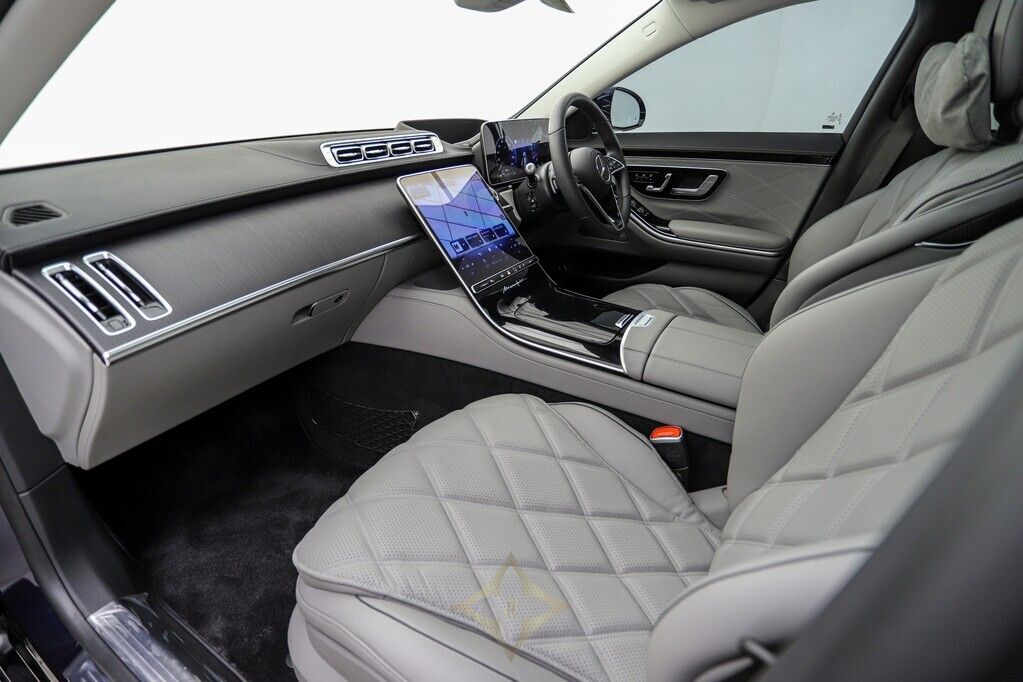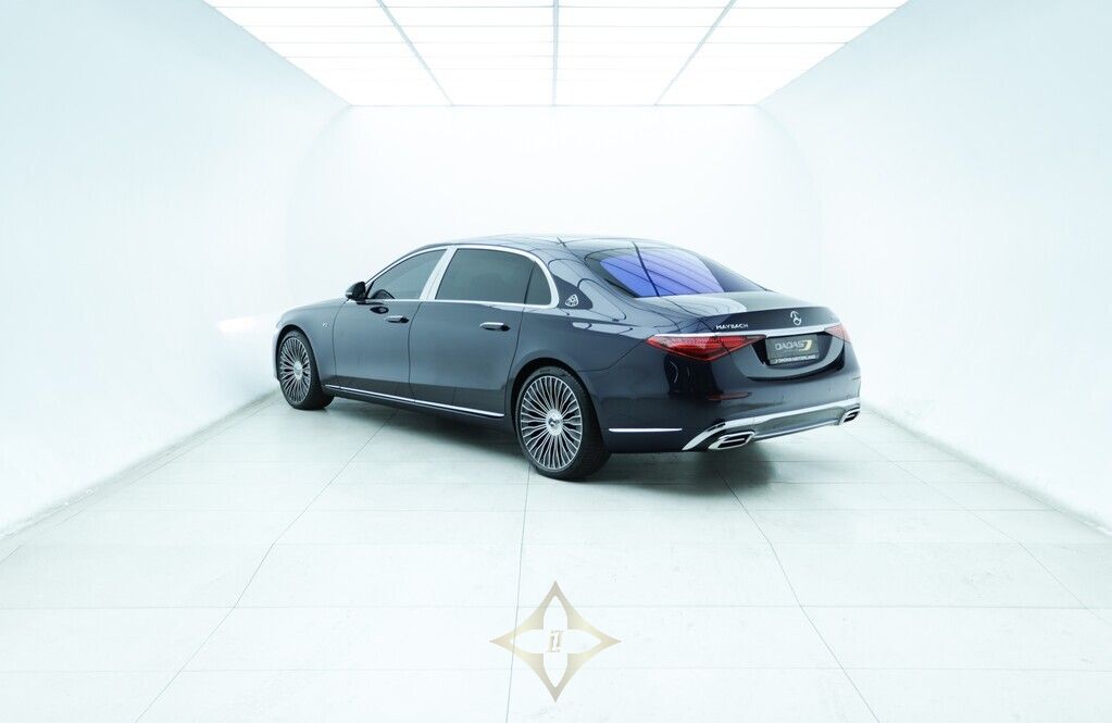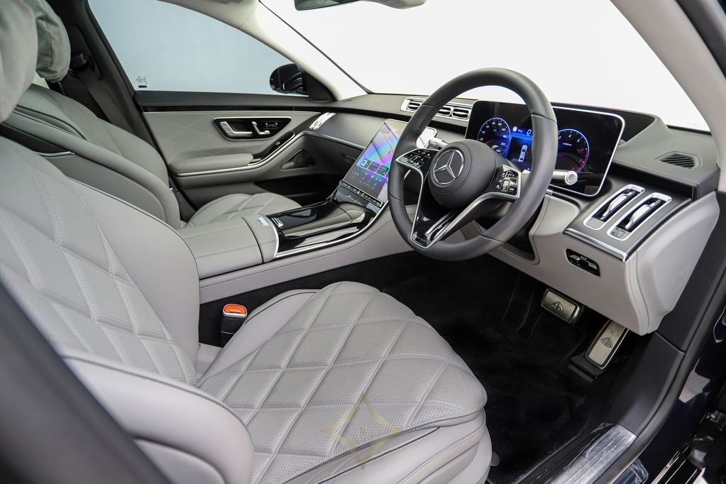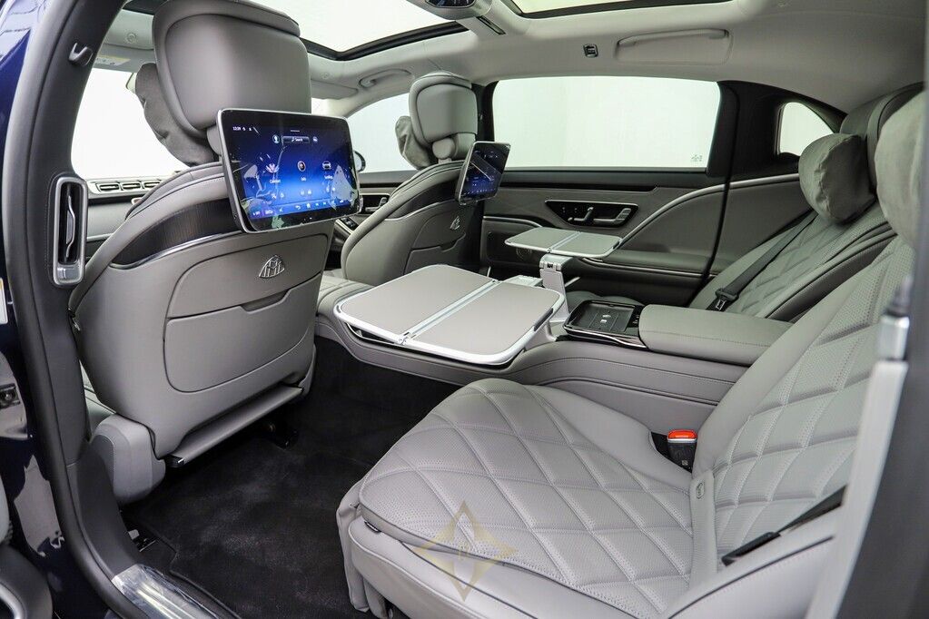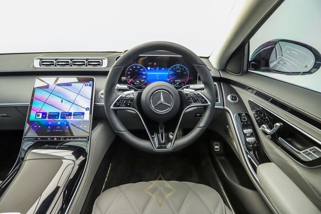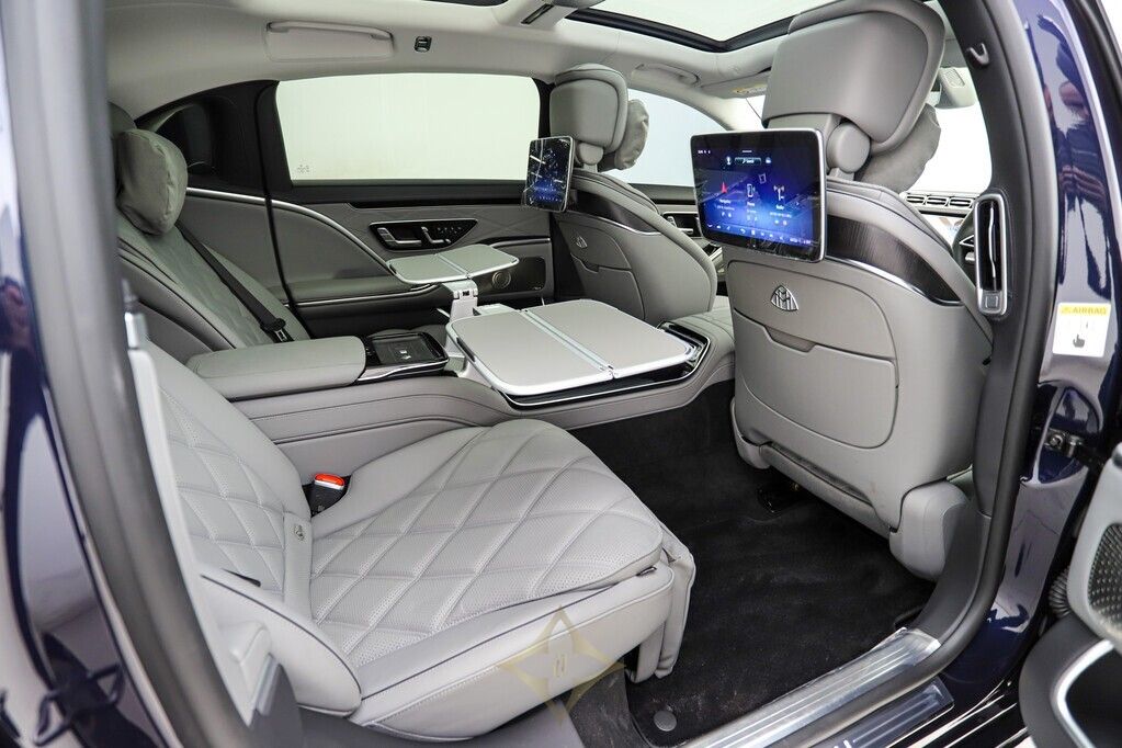This 2023 Mercedes Benz S680 Maybach in Manufaktur Nautic Blue metallic exterior, Signature Maybach exterior chrome, Mercedes Benz HD digital multi-beam adaptive headlight system, 21” Maybach exclusive multi-spoke style forged wheels, Active distance Control (Distronic), Active lane keeping assist, Active steering assist, Mercedes Benz rear axle steering, 360 degree camera, Reverse camera, Active parking assist, Air suspension and an active sound cancellation system which helps the car deliver a silky, ultra-quiet ride, Comfort access, Drive mode options, Maybach exclusive interior package, Maybach exclusive Nappa Manufaktur silver grey / black leather combo interior, Anthracite open-pore poplar wood interior trim, Exclusive Maybach active multi-contour seat package, Front seats in Nappa Silver leather – Auto adjustable with massaging, memory and heating/cooling functions, Maybach multi-function steering wheel in Nappa leather, 3D digital driver display, Heads up display, MBUX touchscreen infotainment system with voice control, Advanced navigations system with live traffic information, Front energizing package, First Class rear compartment, Multi contoured rear seats, Memory package, Comfort package, Warmth comfort package, Neck and shoulder heating in the rear, Calf massage in the rear, Climatised rear seats, Sun blind rear doors, Rear folding tables, Rear refrigerator compartment, MBUX High-end rear seat touchscreen entertainment system, Mercedes Benz Premium Drive 100 service plan until May 2028 or 100 000km