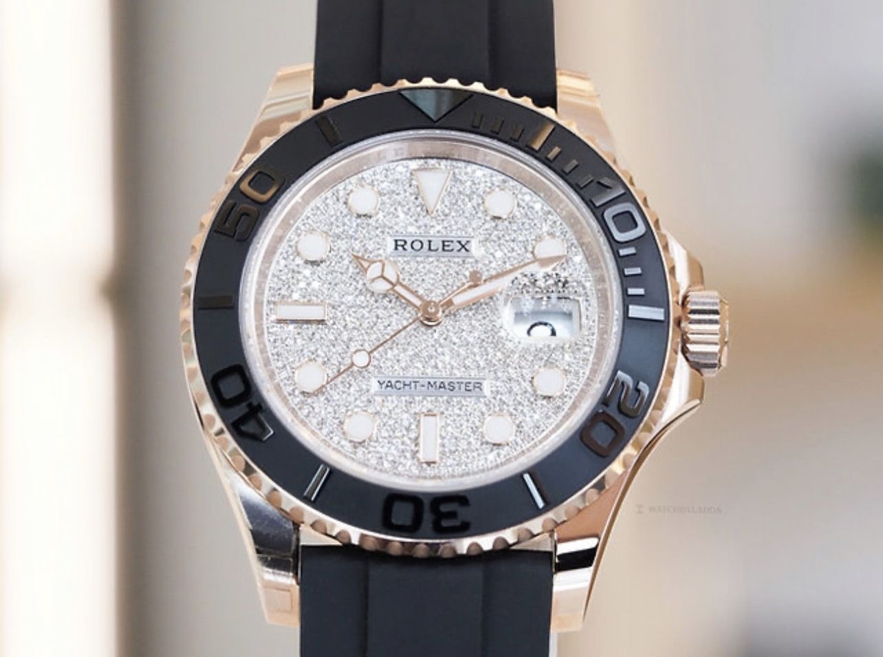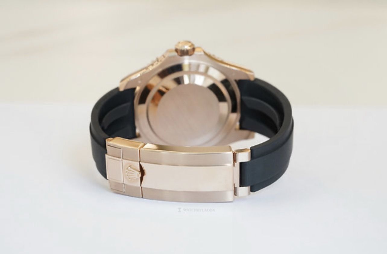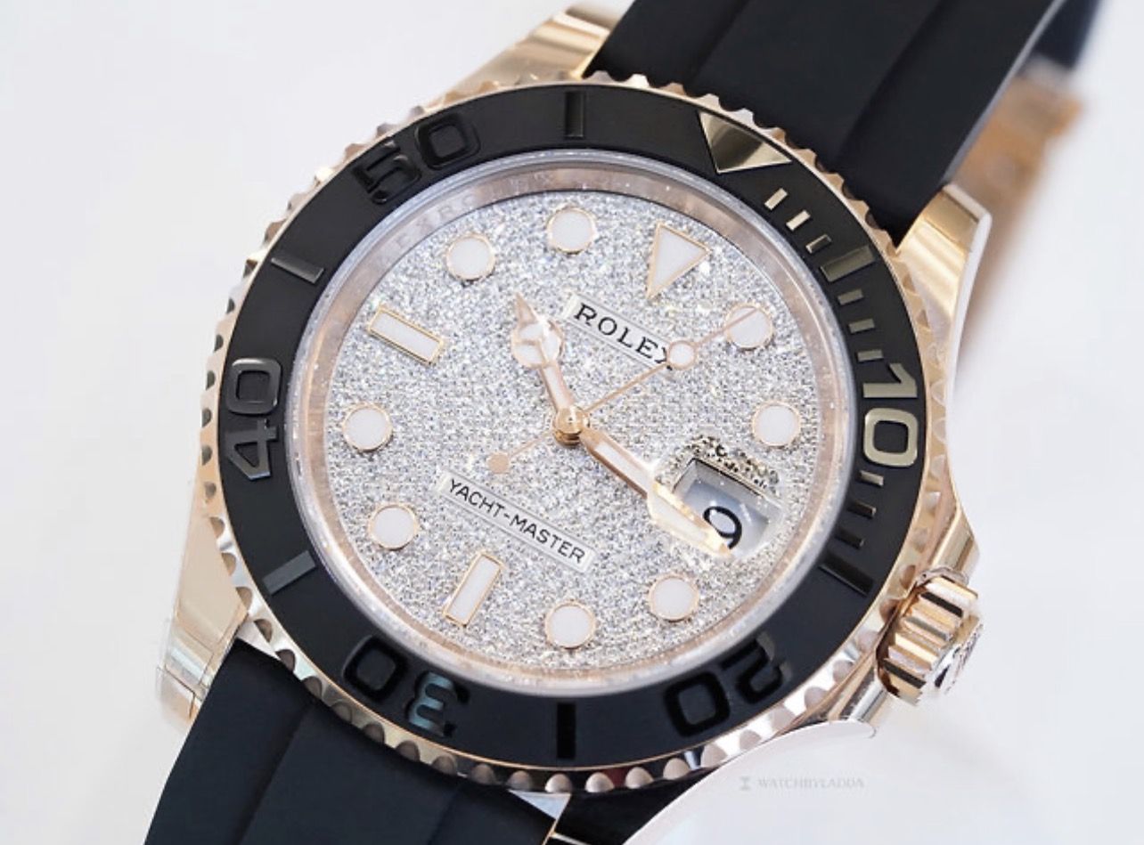 Yacht-Master 40 Rose gold case comes with Diamond-paved dial. Cerachrom case edge shows 60 minutes of two-way rotation. Paired with Oysterflex strap, powered by Calibre 3235, 70 hours of power reserve.