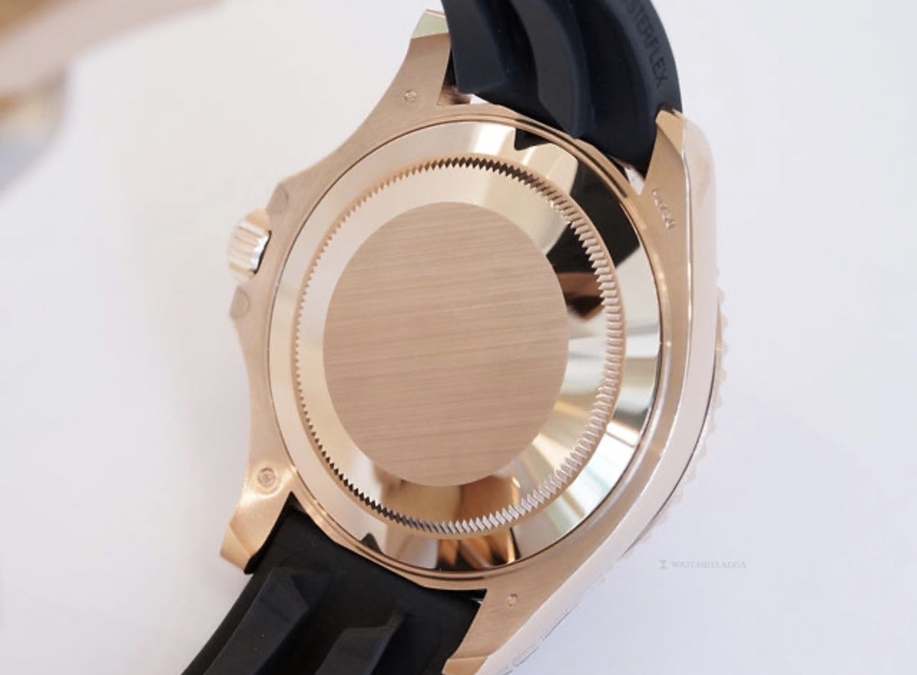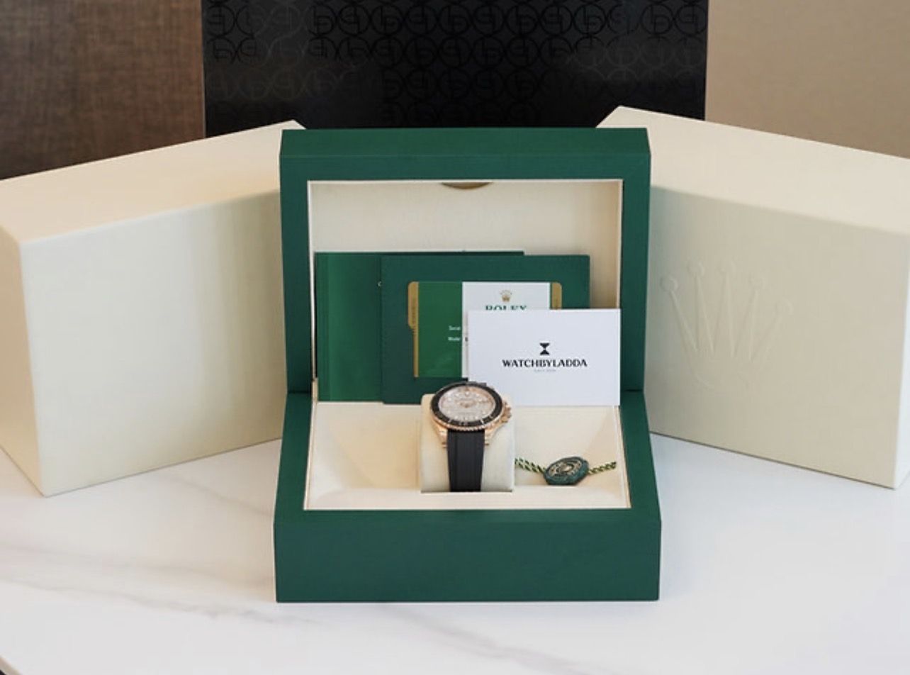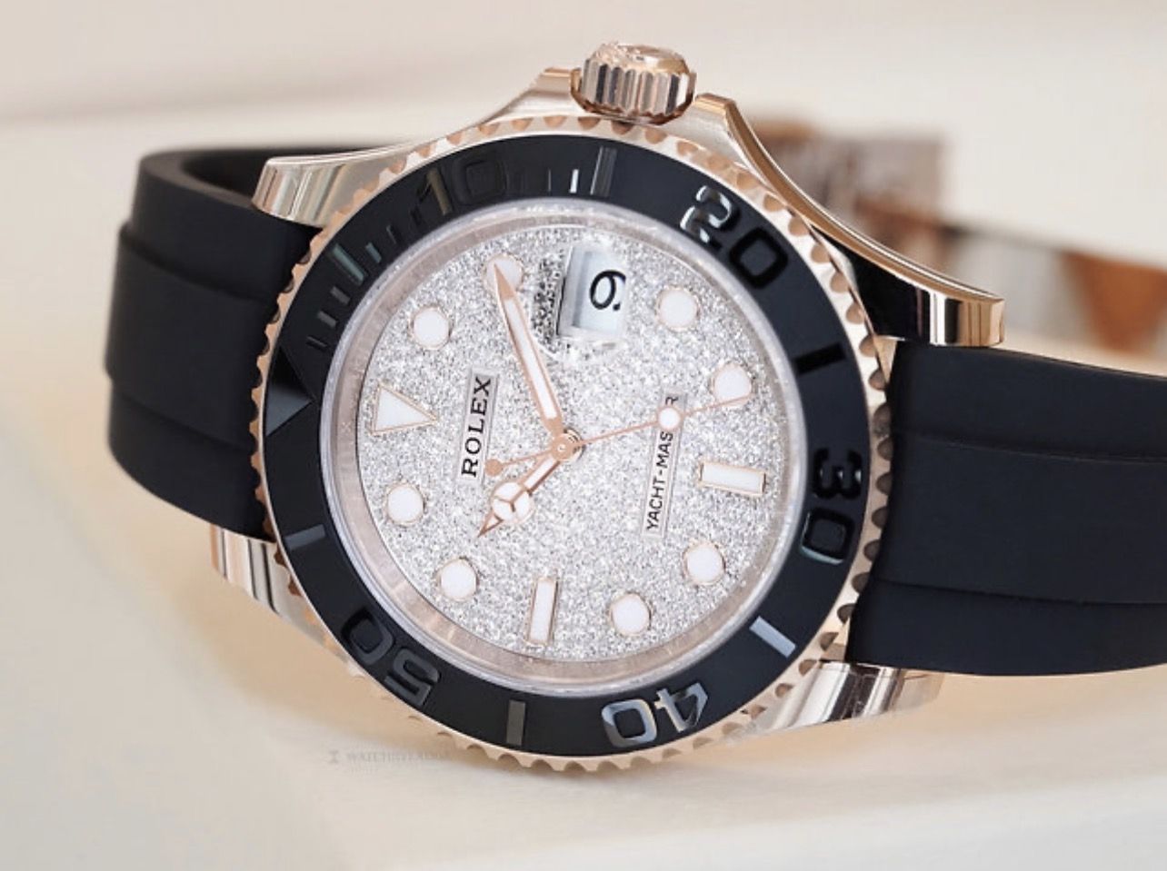 Yacht-Master 40 Rose gold case comes with Diamond-paved dial. Cerachrom case edge shows 60 minutes of two-way rotation. Paired with Oysterflex strap, powered by Calibre 3235, 70 hours of power reserve.