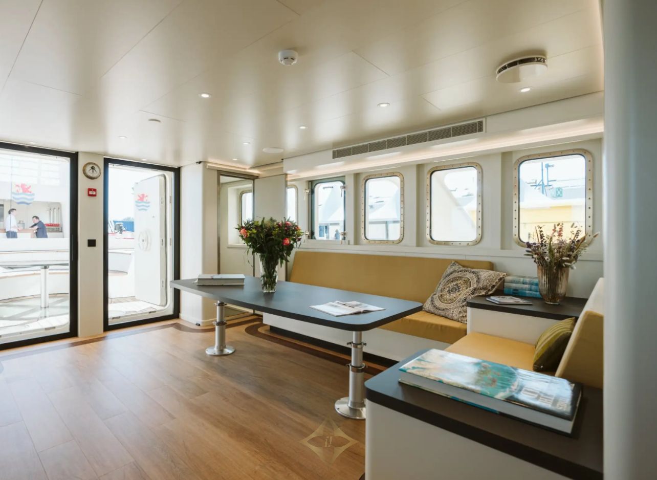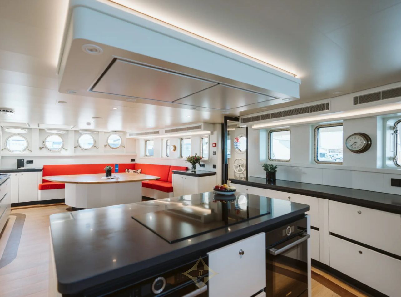 The main deck has a welcoming full beam main galley, designed as a ‘country kitchen’ to foster culinary interactions with the chef. On the spacious bridge deck, three large monitors display navigational and operational information to provide guests with live situational awareness and serve as an open invitation to engage the officers in an informational dialogue.