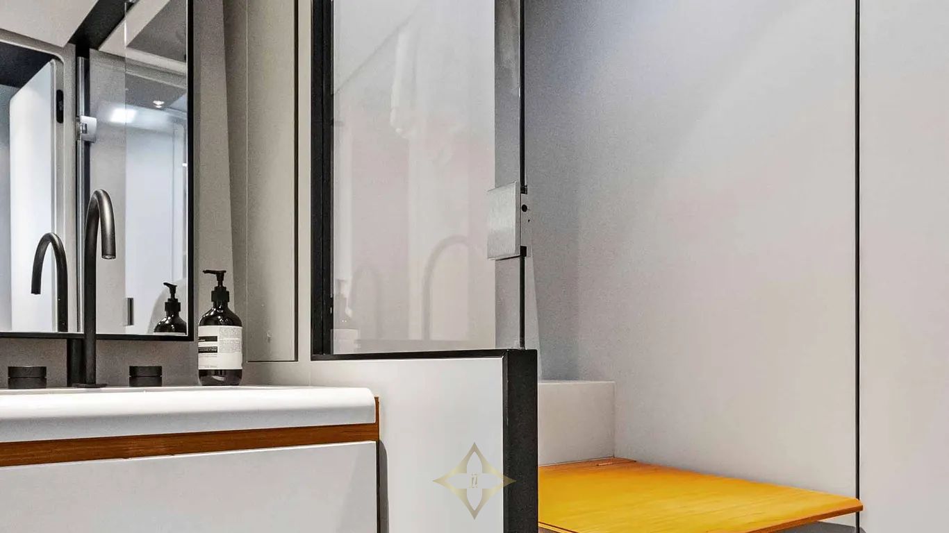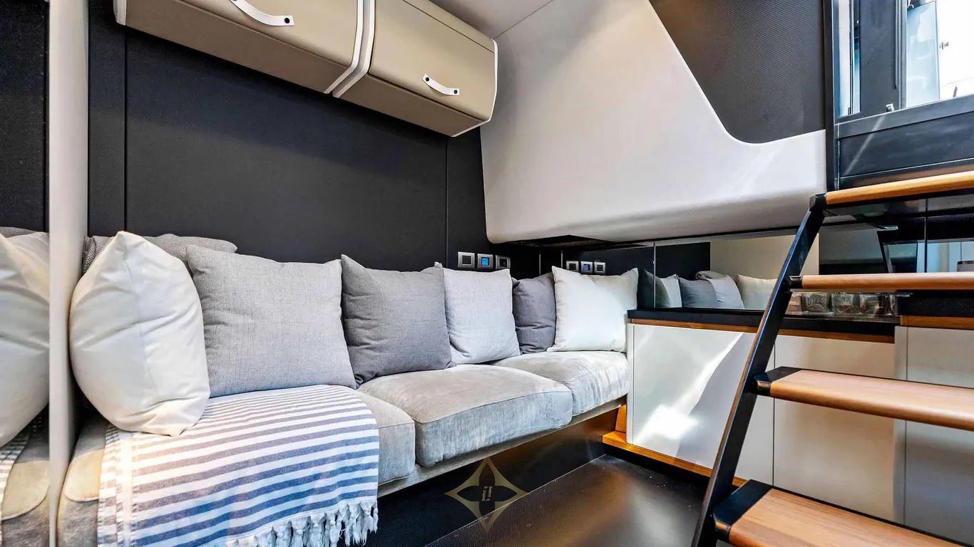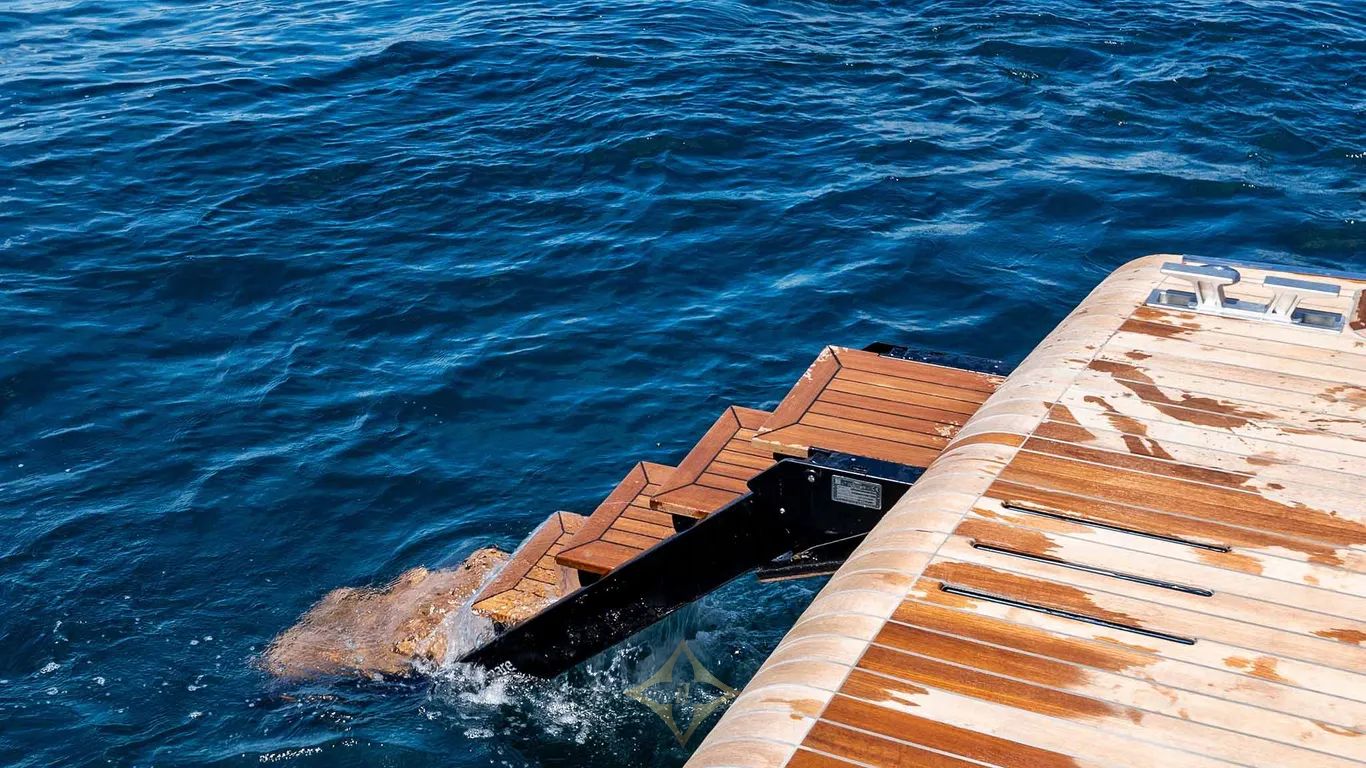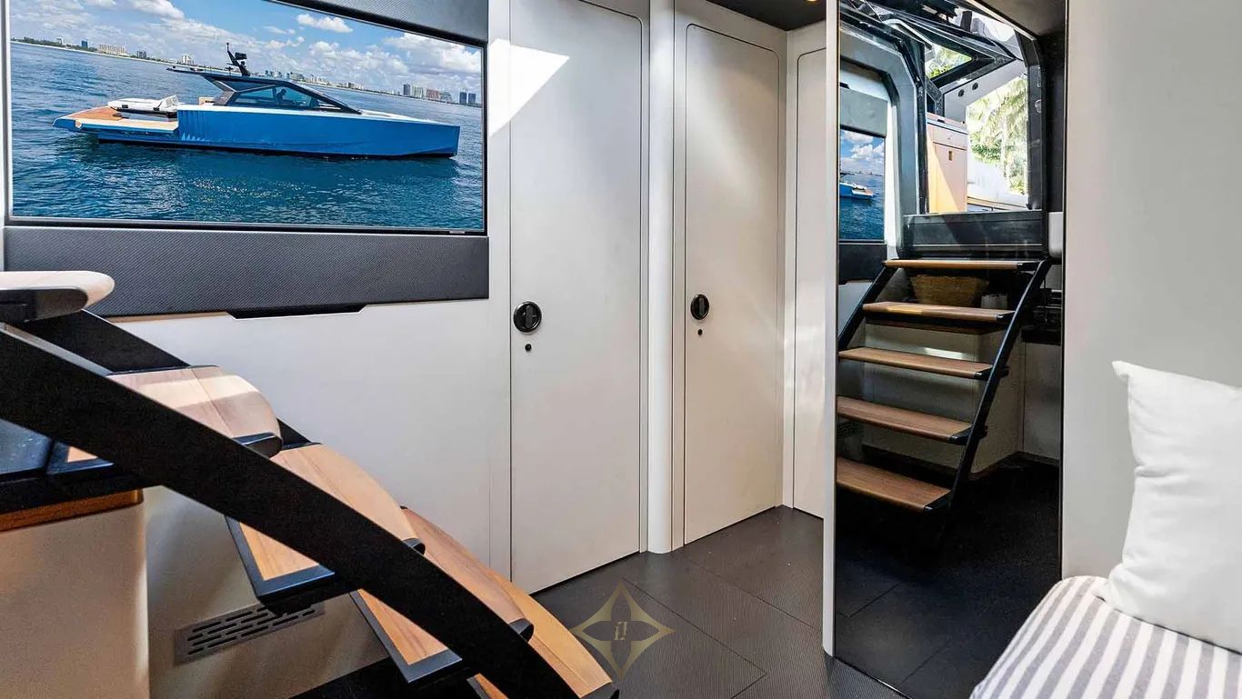 Wrap-around glazing complements the angular sweep of the windscreen and envelops a large cockpit. This offers the room for an elegant polygonal dining table and a deep sofa. A large sunpad dominates the aft deck, with its signature fold-down wings. In a unique twist, Wally has developed a striking electrical awning that swings up out of the deck like the roof of a soft-top car. A convertible passerelle-bathing ladder is hidden in the stern, and the aft platform lowers into the water at the touch of a button to launch/retrieve the tender and water toys.