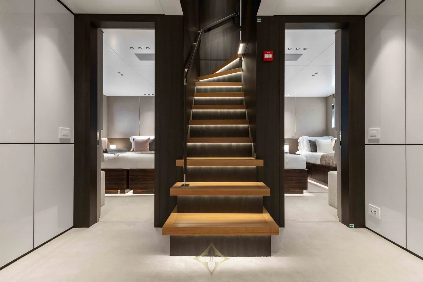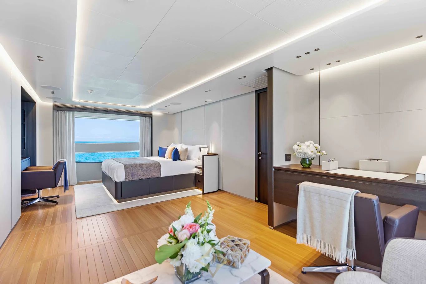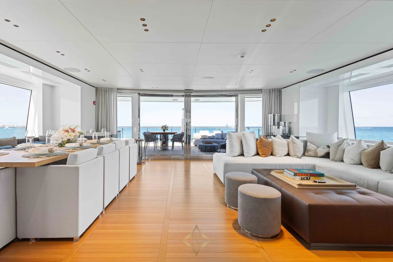 Originally launched as ORENDA, CONTIGO offers luxurious, flexible accommodation for up to 14 guests across 6 cabins, including a full-beam Owner’s suite with private salon, office desk, dressing room, and his-and-her en suite with steam shower and tub. The rest of the accommodation is comprised of two VIP cabins, two convertible twin cabins with an extra Pullman berth in each, and one convertible cabin. CONTIGO also has room for nine crew members.