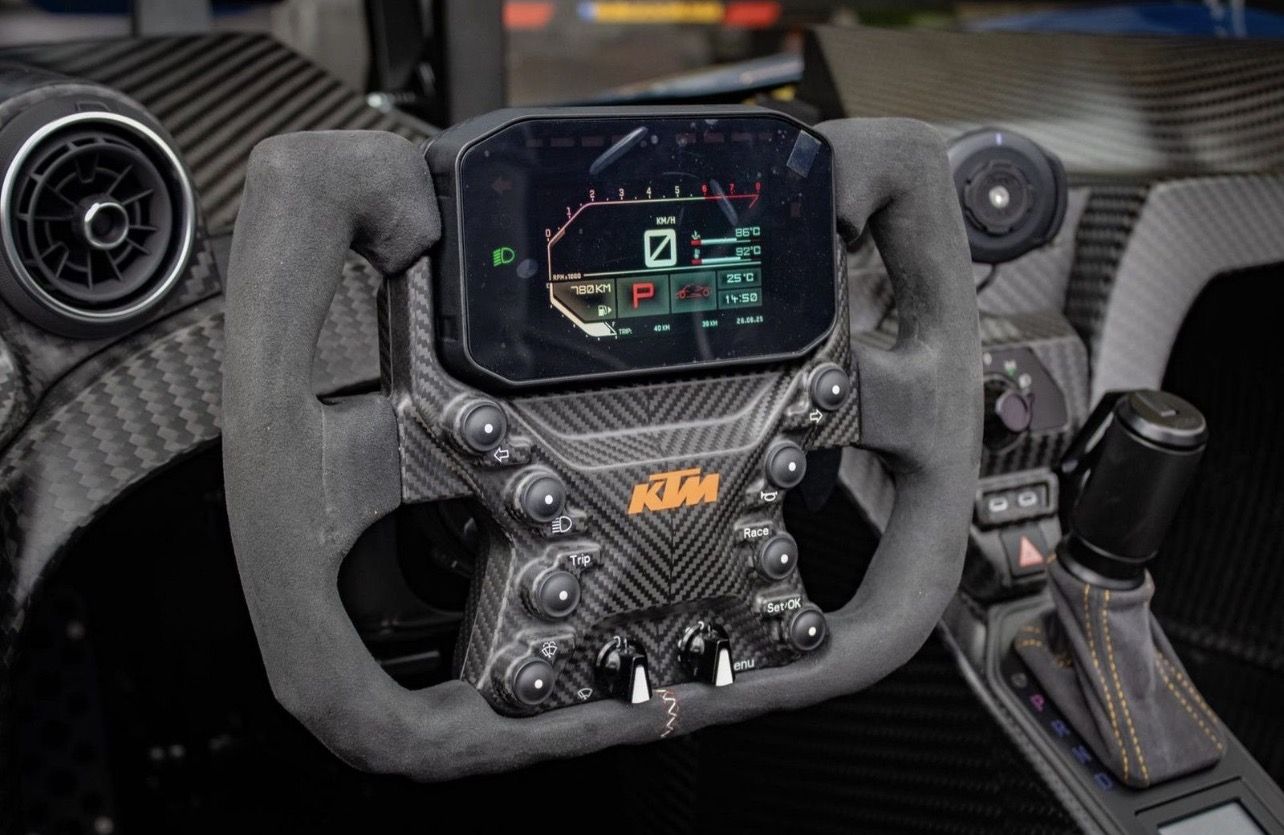 This example has only 27 test kilometers on the odometer and is in absolute mint condition. The car has also been personalized down to the last detail with exclusive gold-colored accents: the rims are finished in Gold Gloss, including the KTM logos on the wheel hub covers. The brake calipers are also finished in RAL 9005 black with gold logos. Furthermore, the suspension, emblems (interior and exterior), seat stitching, tow hook and the '100 Limited Edition' badge are all finished in gold. The GT-XR runs on Pirelli P ZERO TROFEORACE semi-slick tyres, mounted on 19-inch front and 20-inch rear.