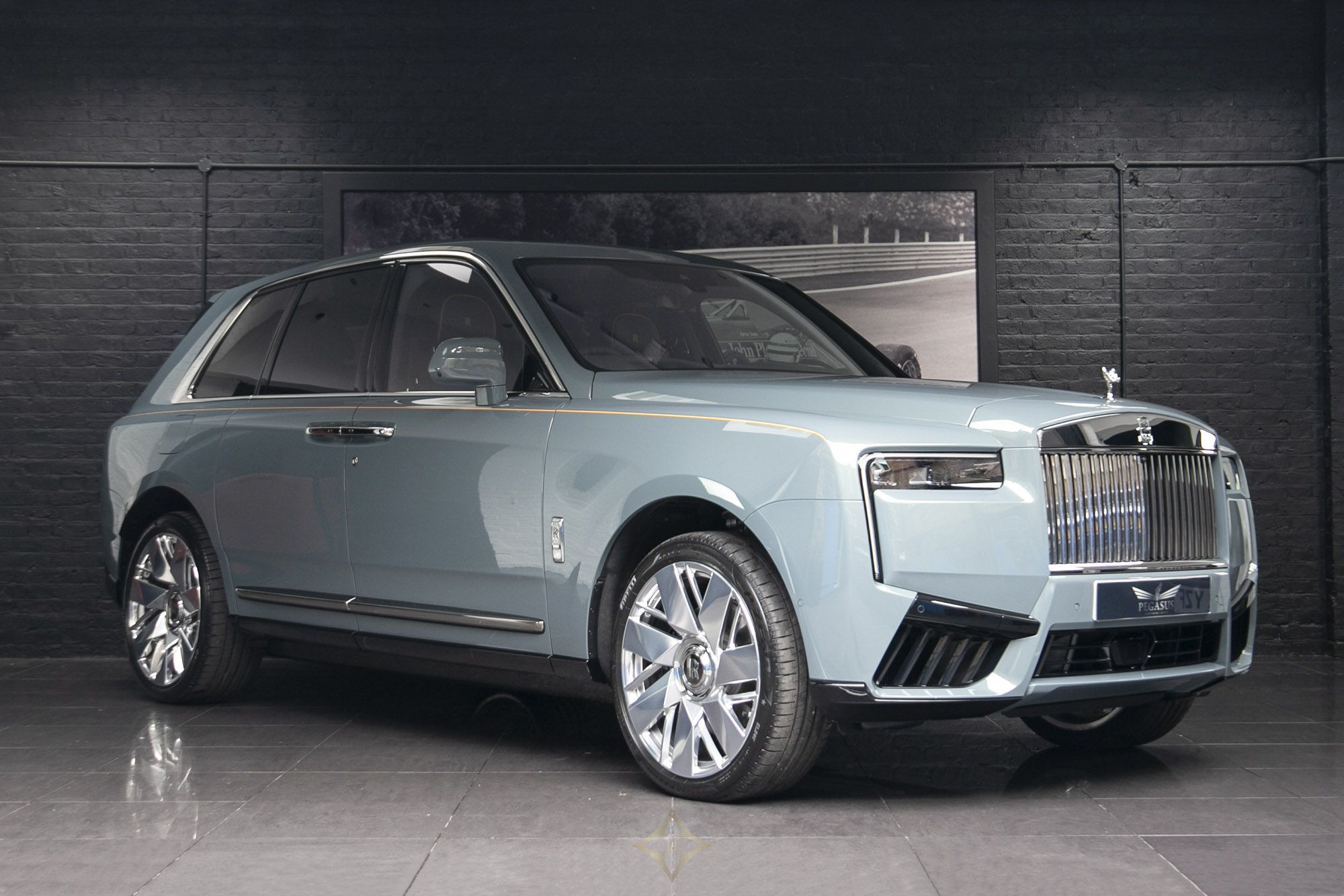 The Rolls-Royce Cullinan Series 2, dressed in the stunning Monteverde exterior, exudes sophistication with a bold Single Forge Yellow coachline and a polished stainless steel package. Riding on 23-inch fully polished wheels and featuring rear privacy glass, this SUV is an undeniable statement of style and exclusivity.
