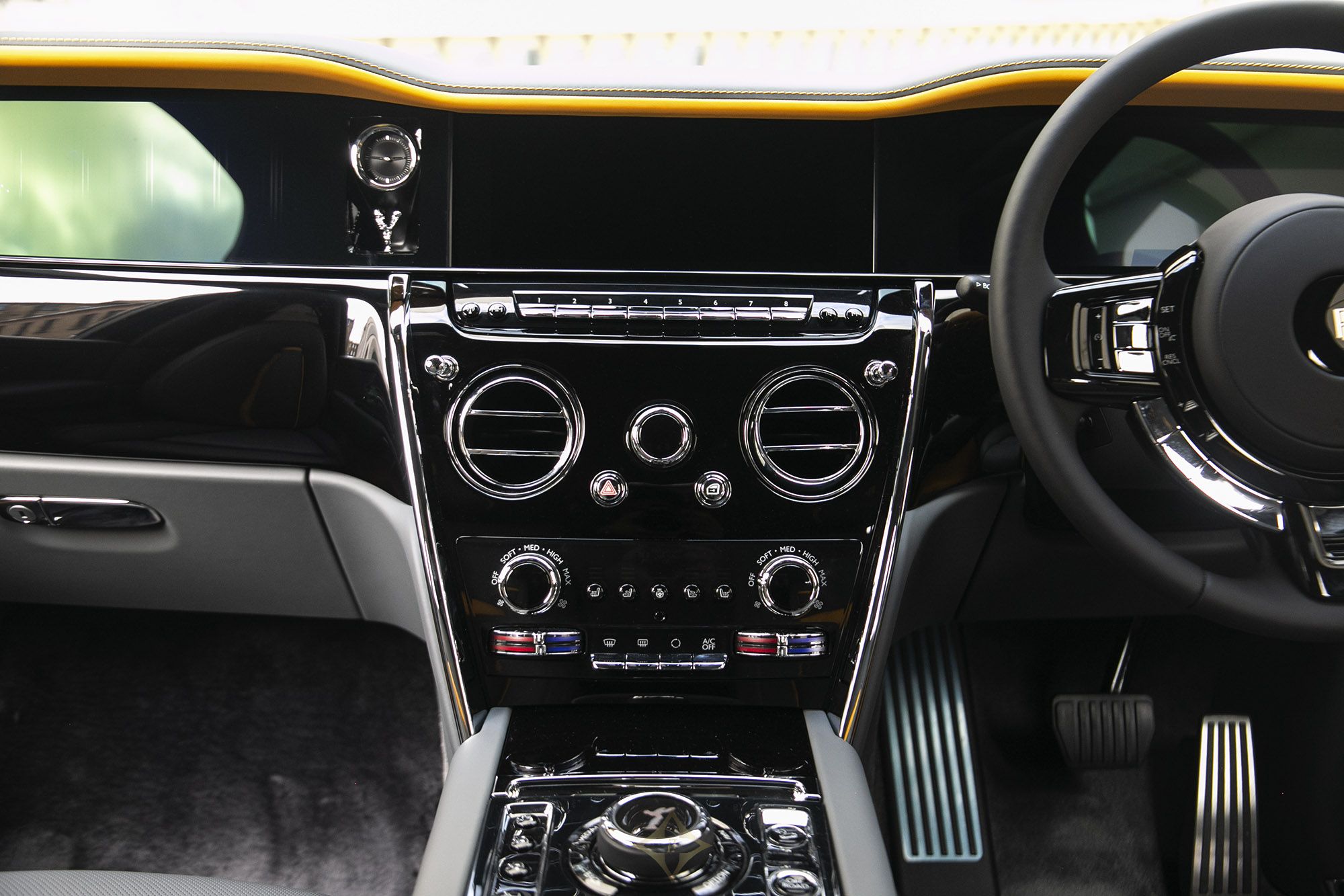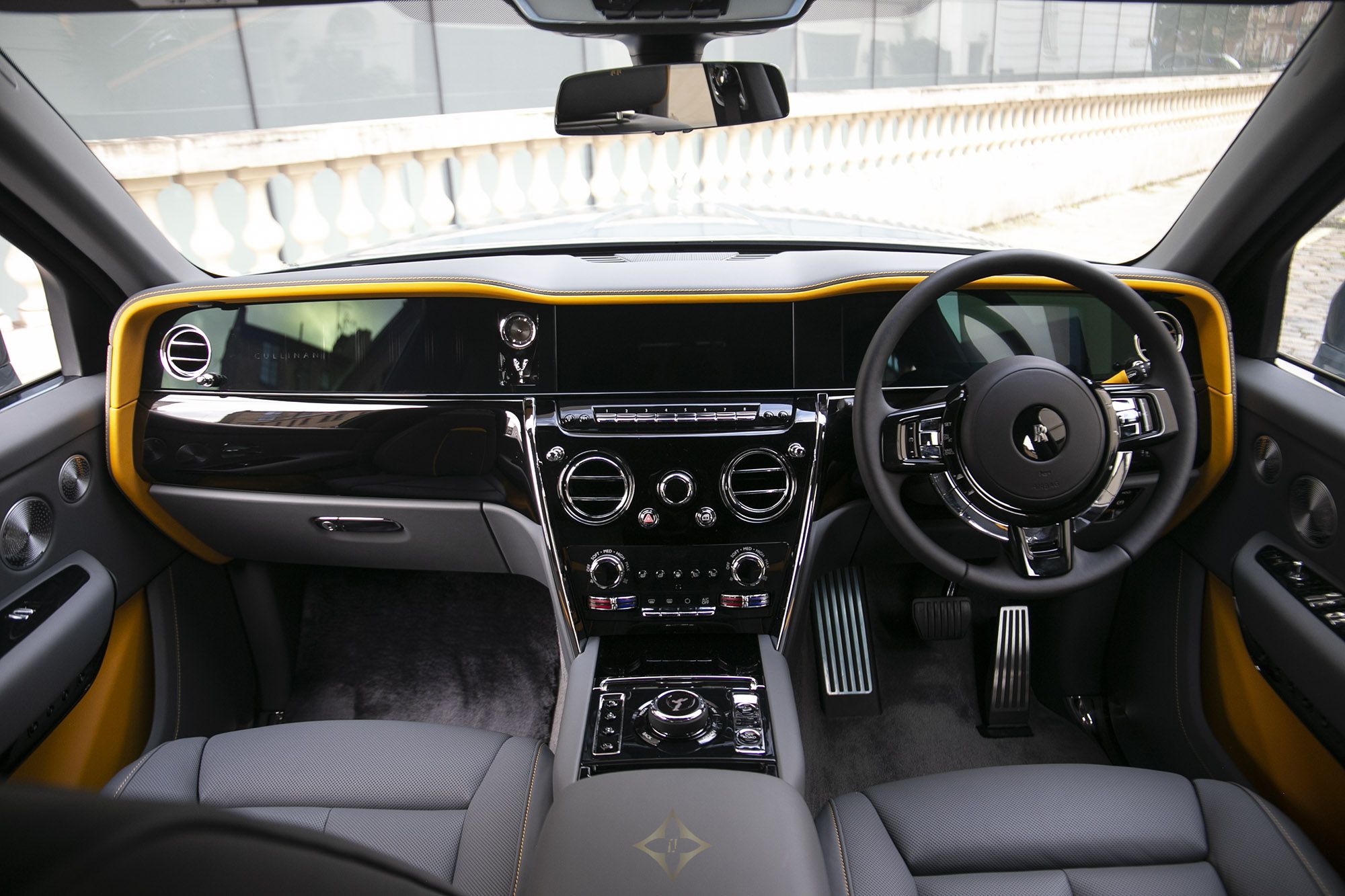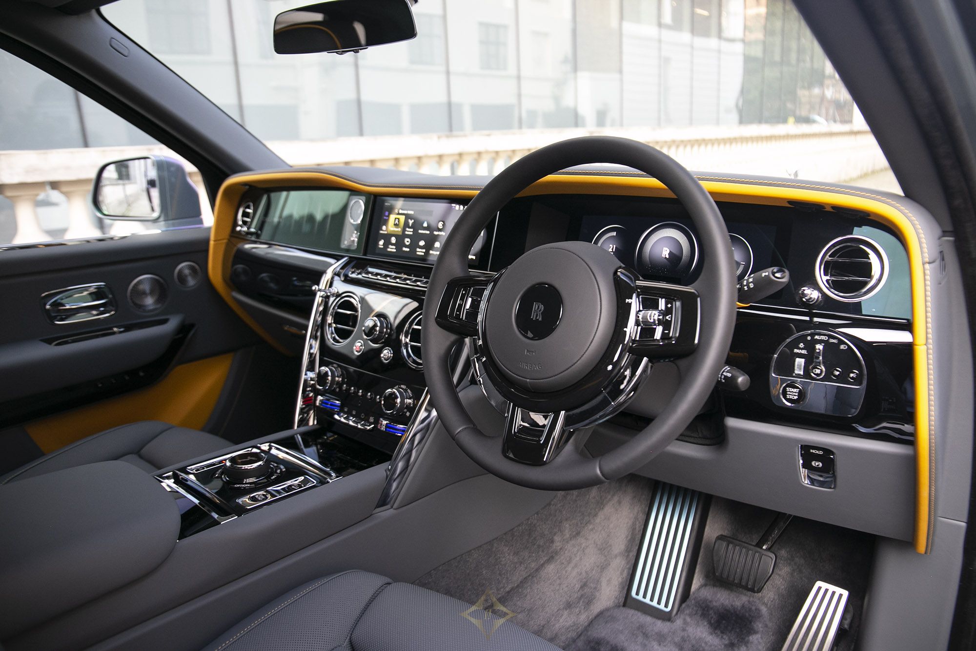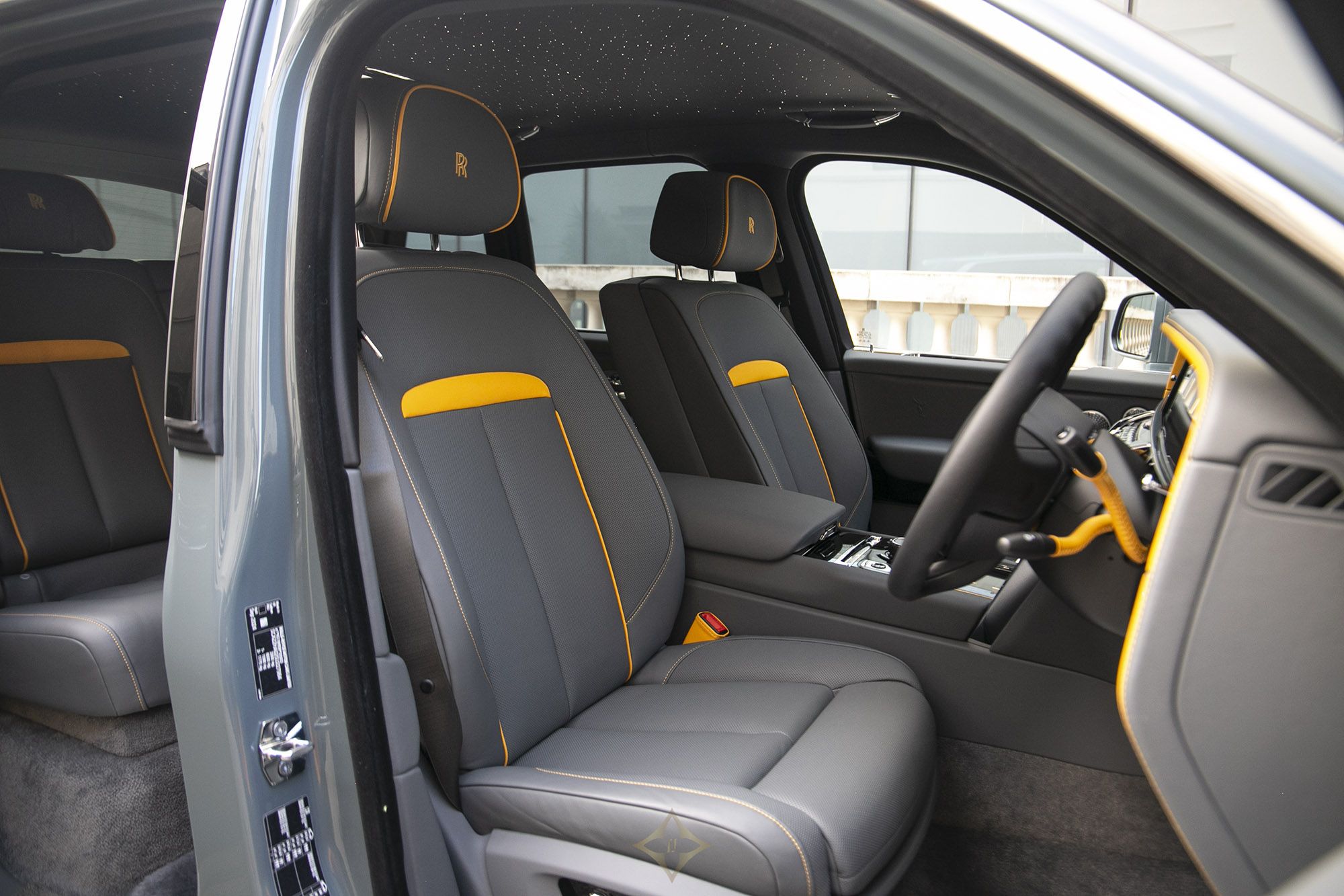 Step inside to a bespoke interior featuring Scivaro Grey perforated leather with Forge Yellow contrasting stitching and the RR monogram elegantly embroidered into all headrests. The illuminated fascia, piano black trim, and extended veneer center line enhance the cabin’s opulence. With a shooting star headliner and lambswool floor mats, every detail speaks of meticulous craftsmanship.