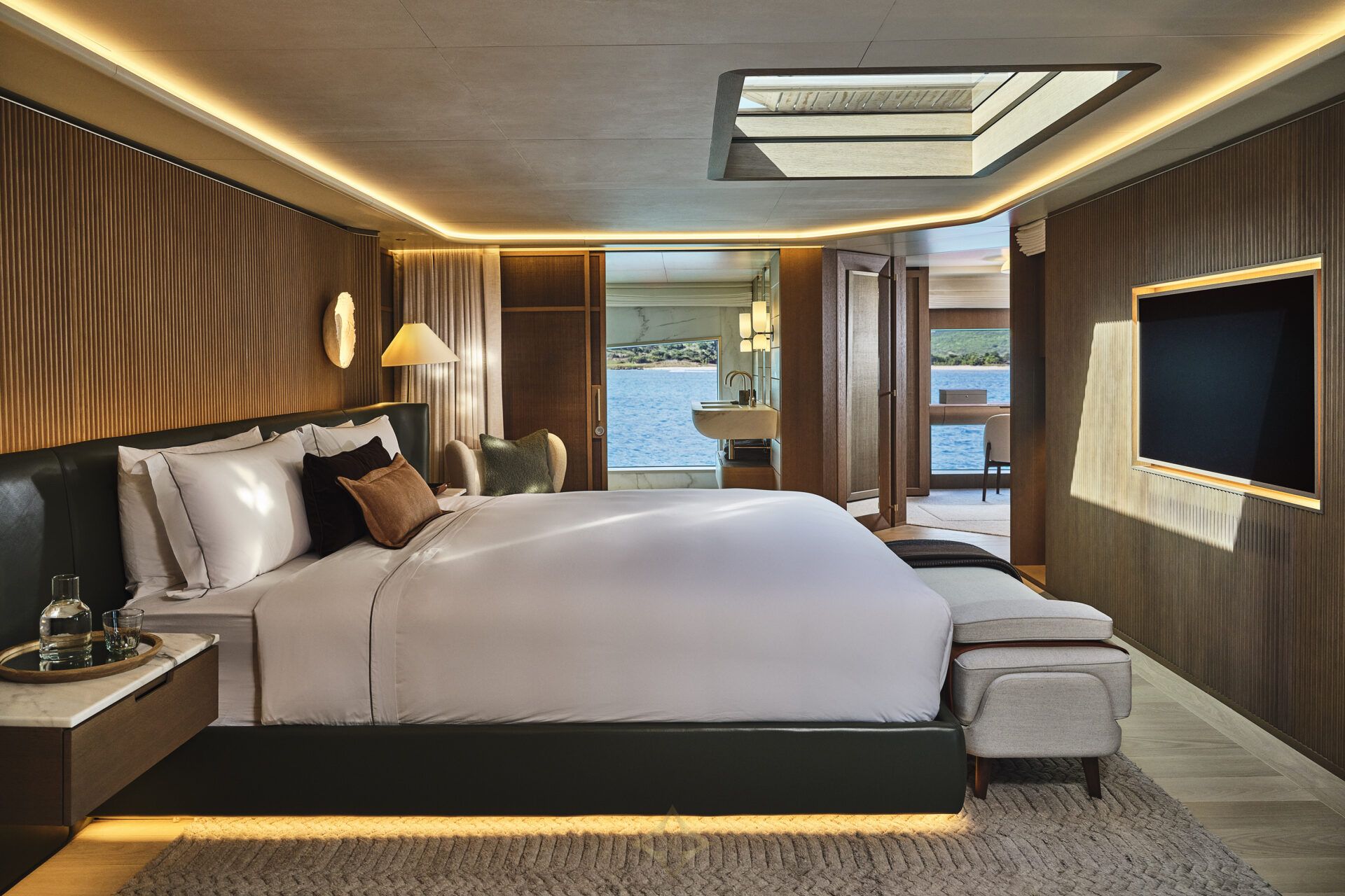 Her eco-luxury inspired interiors, by Meyer Davis, imbue the yacht with a sense of nature through the use of sustainable materials. The 13.6m beam provides an exceptional amount of room, accommodating up to 12 guests across 5 luxurious, spacious staterooms, including a spectacular full beam 70m² master suite.