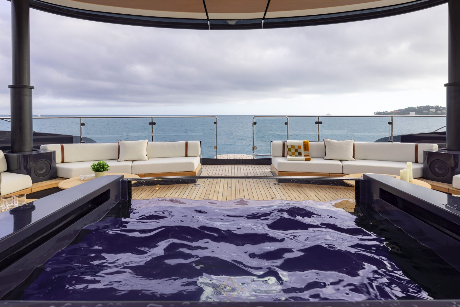 The hybrid-electric propulsion system cuts fuel use by up to 75%, and her revolutionary silent anchor mode allows for up to 24 hours of silent anchoring and vibration-free electric cruising, leaving your environment undisturbed. A wide array of on-board amenties ensure a tranquil stay for guest too, with a heated swimming pool with hydromassage jets, a jacuzzi, and a beach club equipped with a sauna.