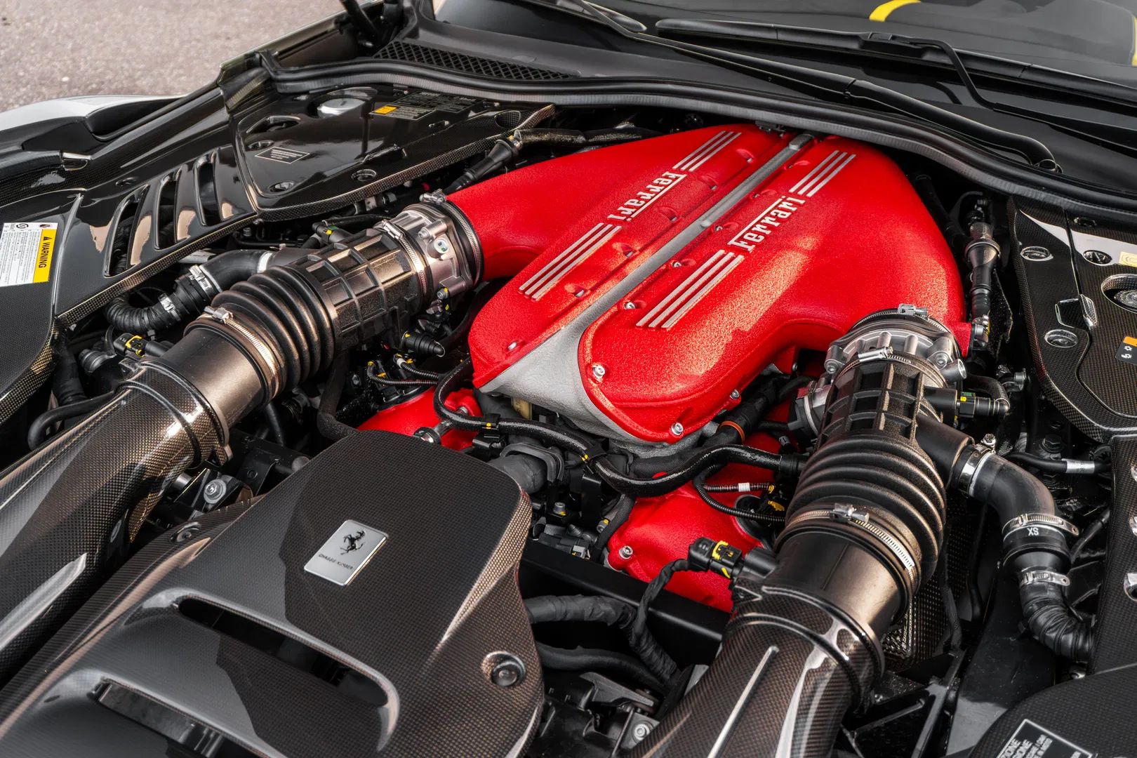 It has the same 6.5L block as the 812 Superfast, but the internals have been refined and triple-distilled for more performance. The pistons have been redesigned, the titanium connecting rods are 40 percent lighter, and a diamond-like carbon (DLC) coating wraps the piston pins. There's a rebalanced crankshaft (3 percent lighter than before), new cylinder heads, F1-inspired camshaft technology, a redesigned intake system (including manifold and plenum), and intake ducts with variable geometry. Plenty of improvements to really set it apart from the 'standard' 812.