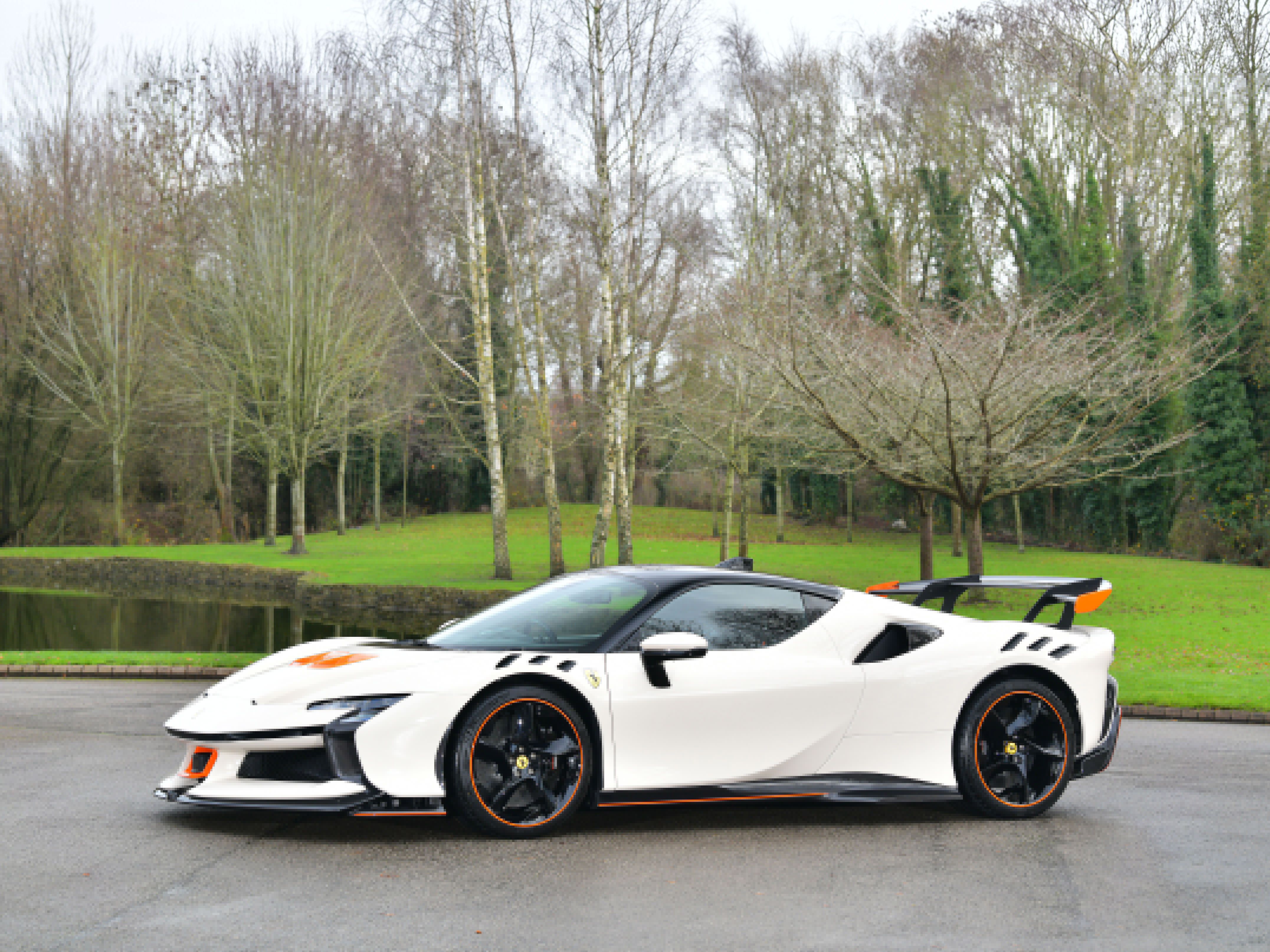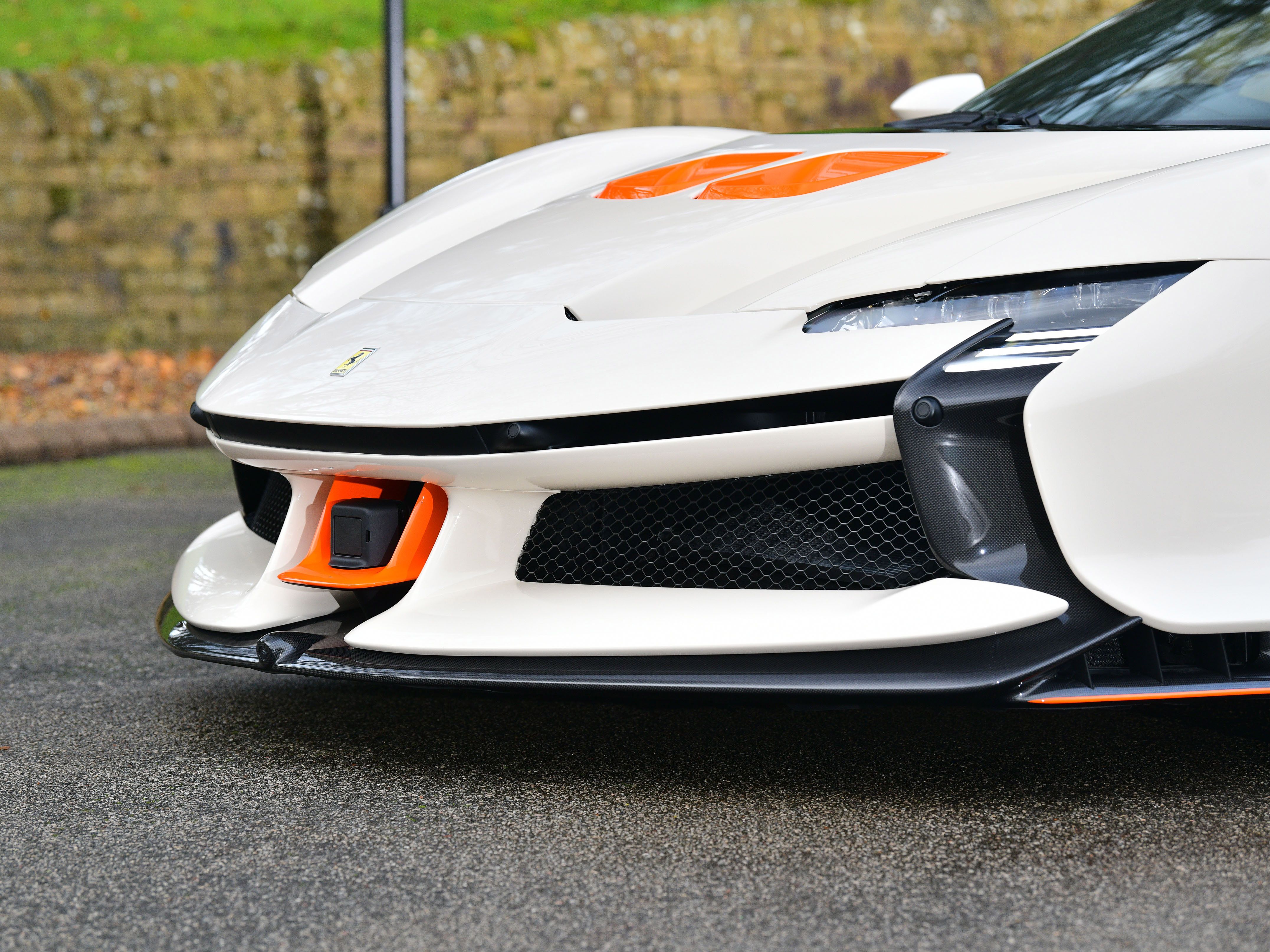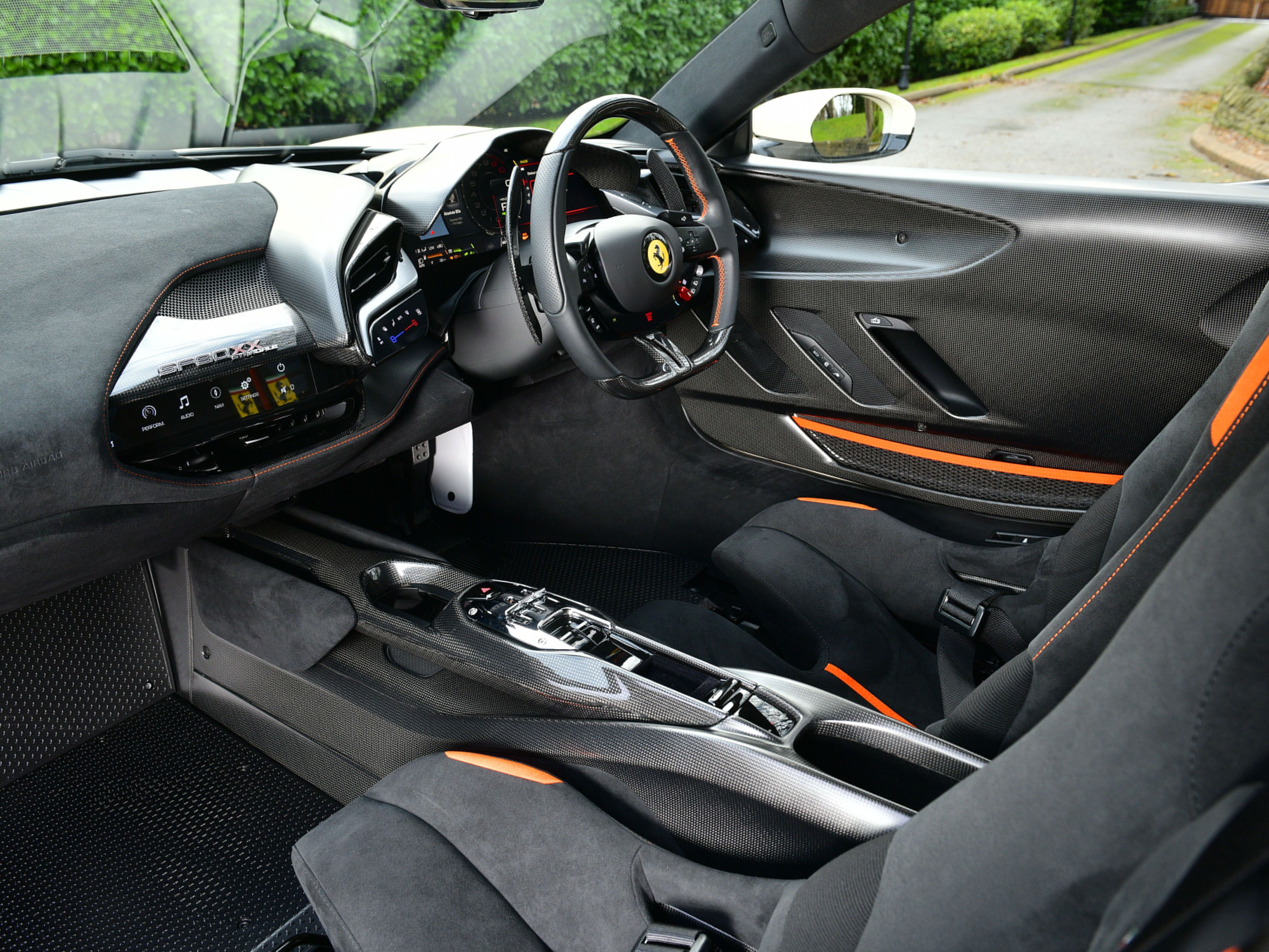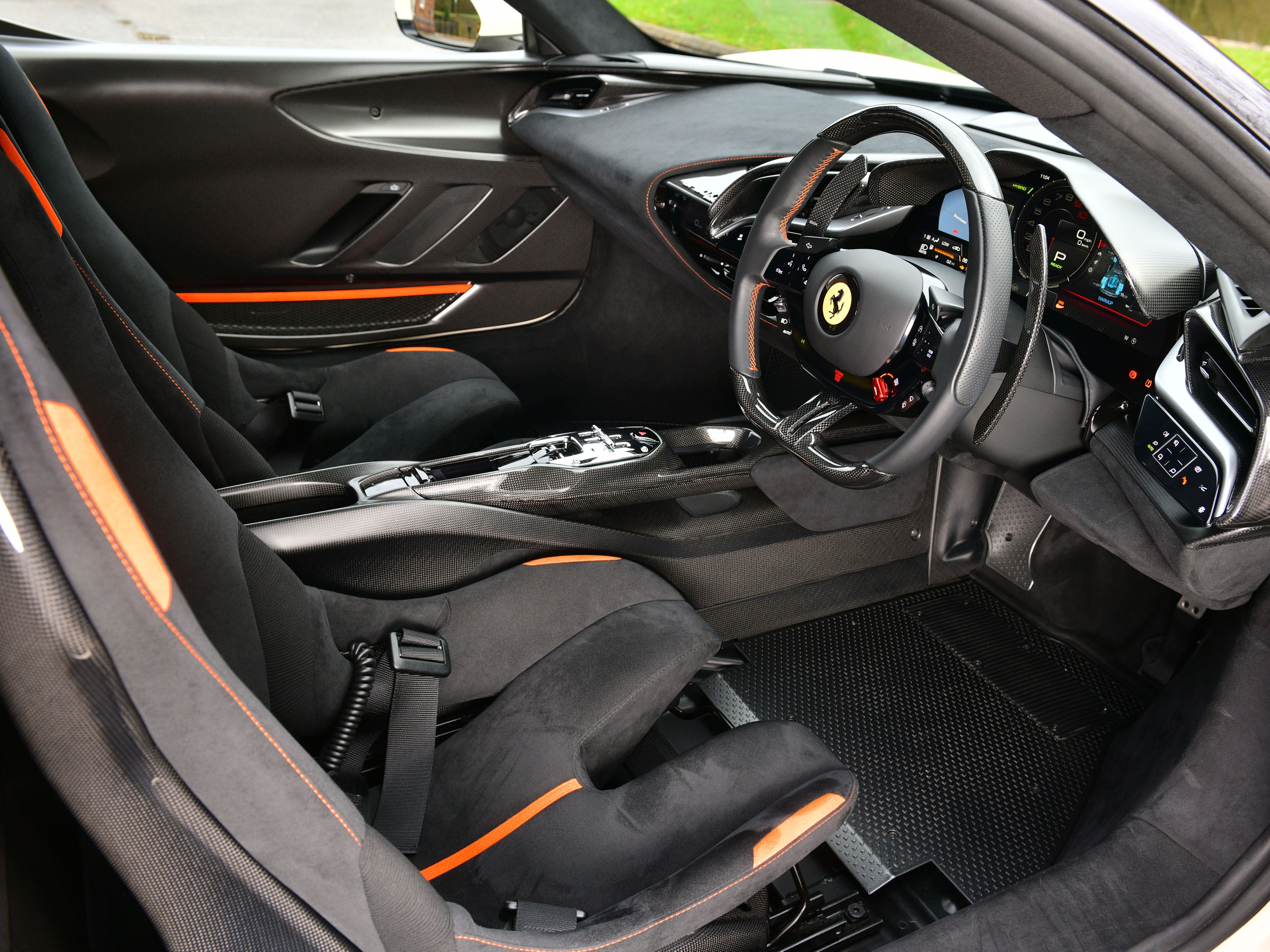 This car is a UK supplied example that was specified with the following factory options and features that include: iconic special paint finish, two-tone bodywork, livery in orange, carbon fibre racing seats, carbon fibre dashboard air vents, carbon fibre luggage compartment side walls, carbon fibre dashboard insert stripes, carbon fibre rear interior finishing, carbon fibre rear bench, carbon fibre interior rear view mirror surround, seat piping in flash orange, seat inserts in flash orange Alcantara, Cavallino stitching to headrests in flash orange, carbon fibre-black leather steering wheel with stitching in flash orange and LEDs, interior stitching throughout in flash orange, leather passenger compartment accents, lower zone in black Alcantara, 4 point seat harnesses, adaptive front lighting system, suspension lifter, front and rear parking cameras, front and rear parking sensors, MY Ferrari connect, smartphone interface, carbon fibre front spoiler, carbon fibre lateral engine air intakes, carbon fibre engine compartment, carbon fibre rear spoiler, carbon fibre diffuser, carbon fibre side skirts, carbon fibre front compartment area, dreamline on exterior carbon fibre sections, Scuderia shields, matt black exhaust pipes, 20″ black gloss alloy wheels, black brake callipers and security tracker system.