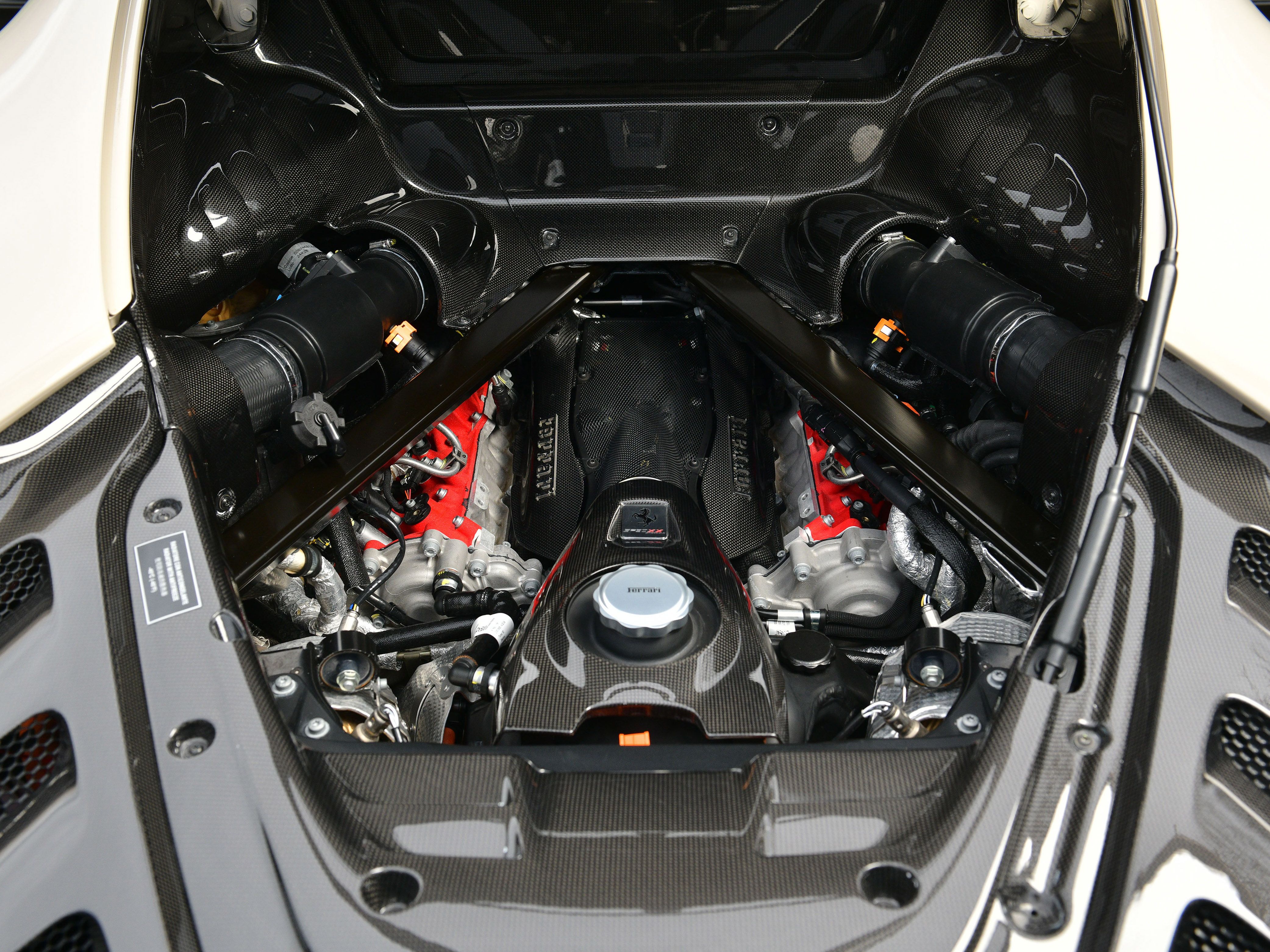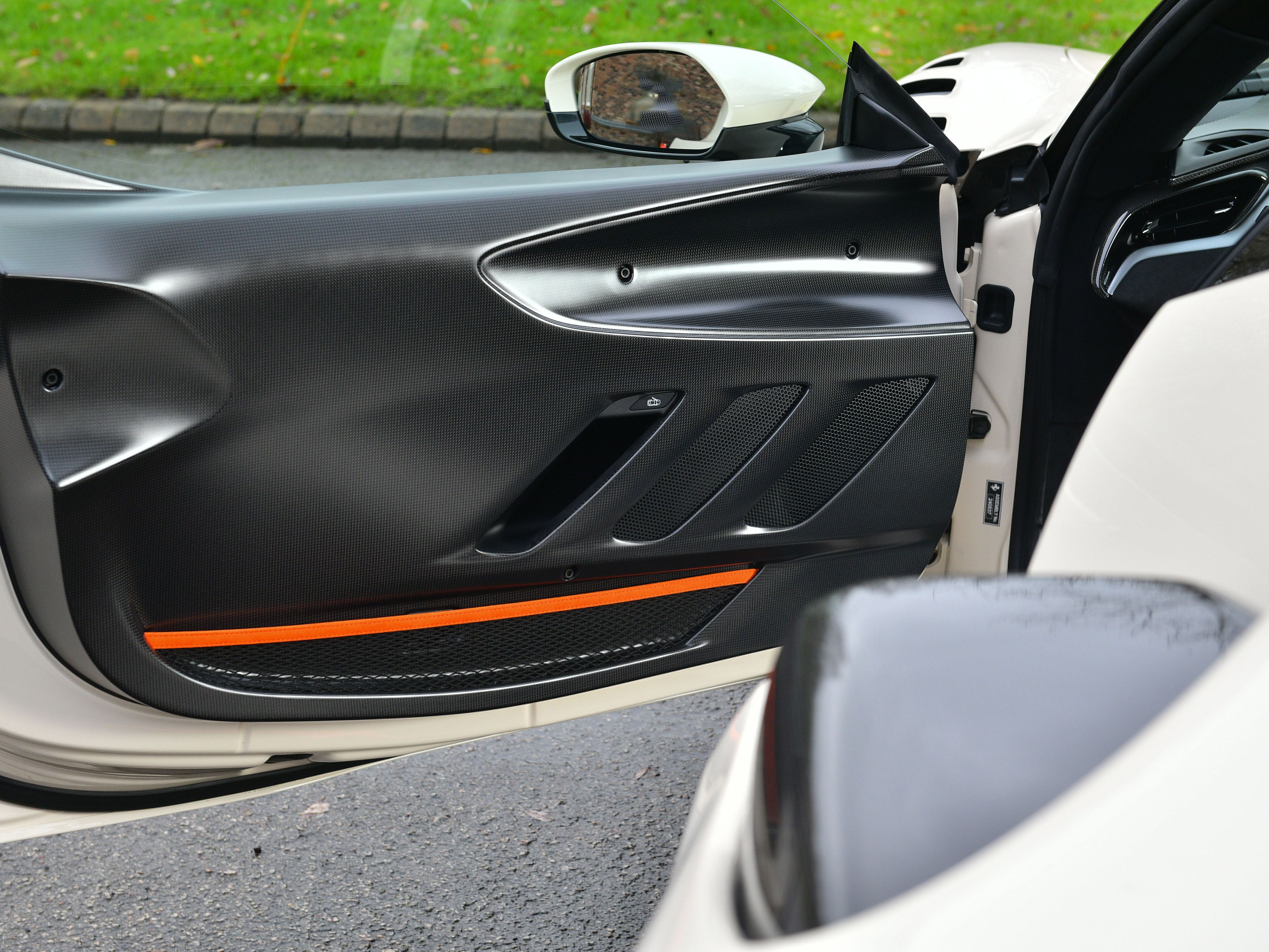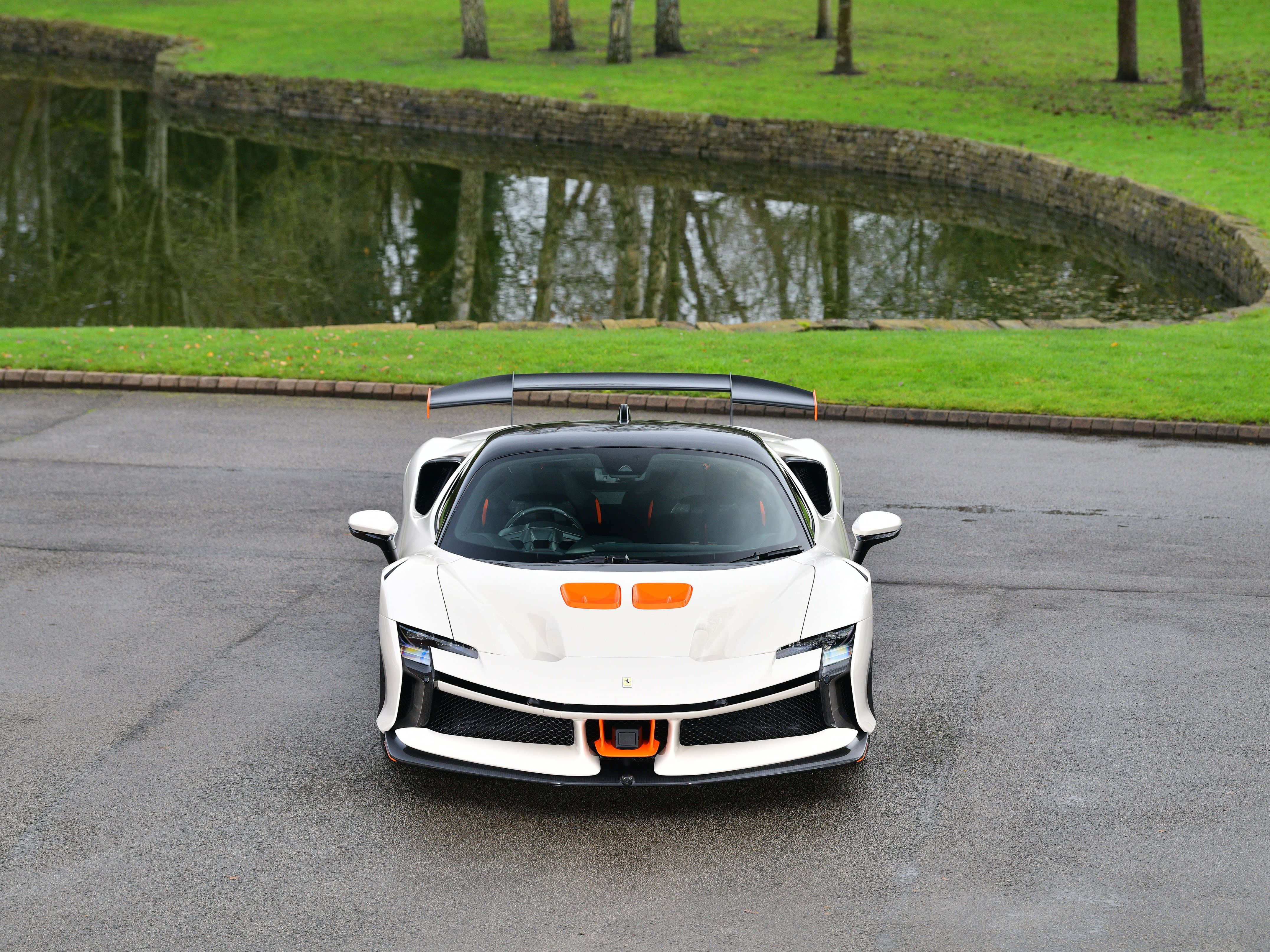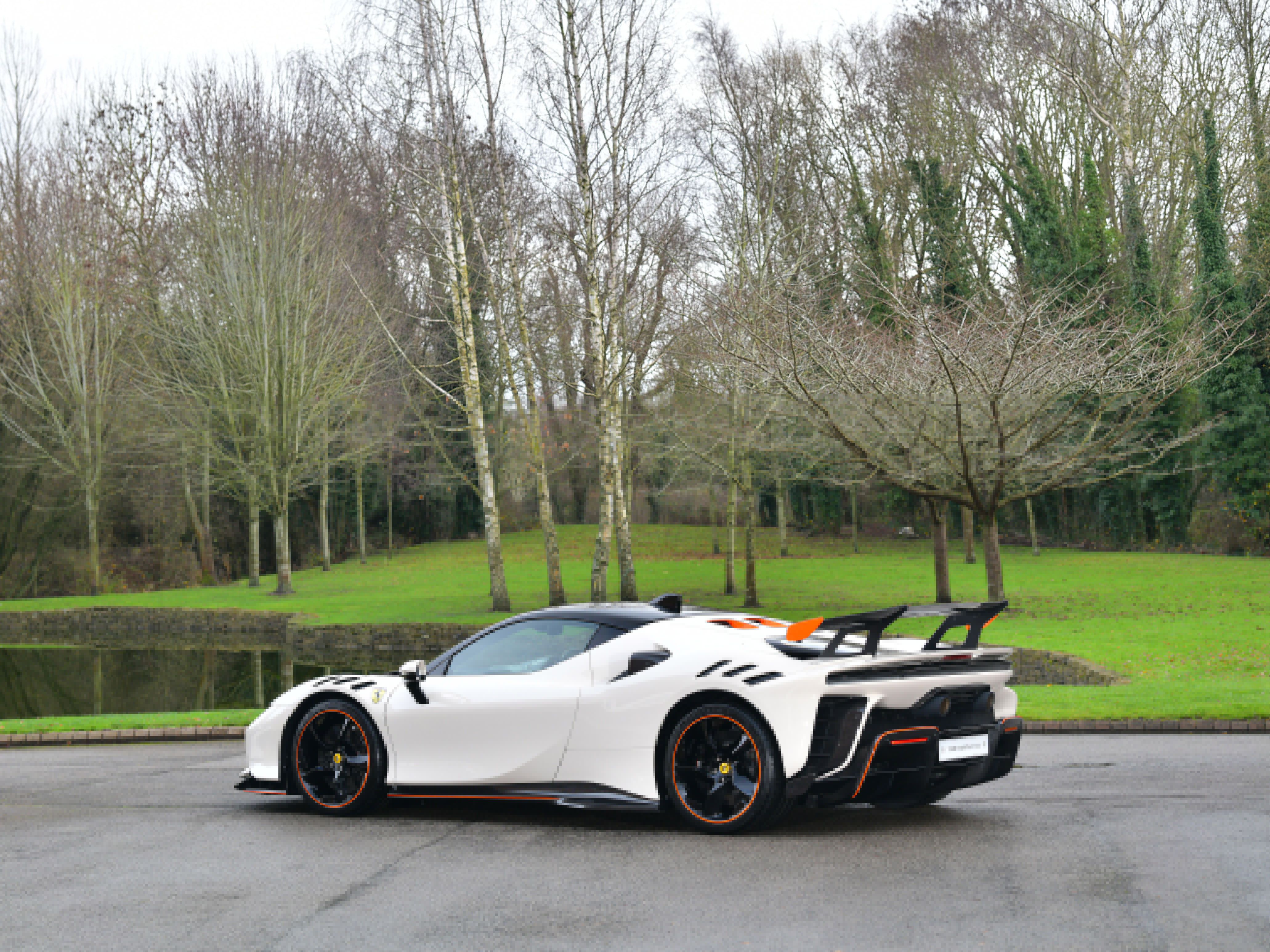 This car is a UK supplied example that was specified with the following factory options and features that include: iconic special paint finish, two-tone bodywork, livery in orange, carbon fibre racing seats, carbon fibre dashboard air vents, carbon fibre luggage compartment side walls, carbon fibre dashboard insert stripes, carbon fibre rear interior finishing, carbon fibre rear bench, carbon fibre interior rear view mirror surround, seat piping in flash orange, seat inserts in flash orange Alcantara, Cavallino stitching to headrests in flash orange, carbon fibre-black leather steering wheel with stitching in flash orange and LEDs, interior stitching throughout in flash orange, leather passenger compartment accents, lower zone in black Alcantara, 4 point seat harnesses, adaptive front lighting system, suspension lifter, front and rear parking cameras, front and rear parking sensors, MY Ferrari connect, smartphone interface, carbon fibre front spoiler, carbon fibre lateral engine air intakes, carbon fibre engine compartment, carbon fibre rear spoiler, carbon fibre diffuser, carbon fibre side skirts, carbon fibre front compartment area, dreamline on exterior carbon fibre sections, Scuderia shields, matt black exhaust pipes, 20″ black gloss alloy wheels, black brake callipers and security tracker system.