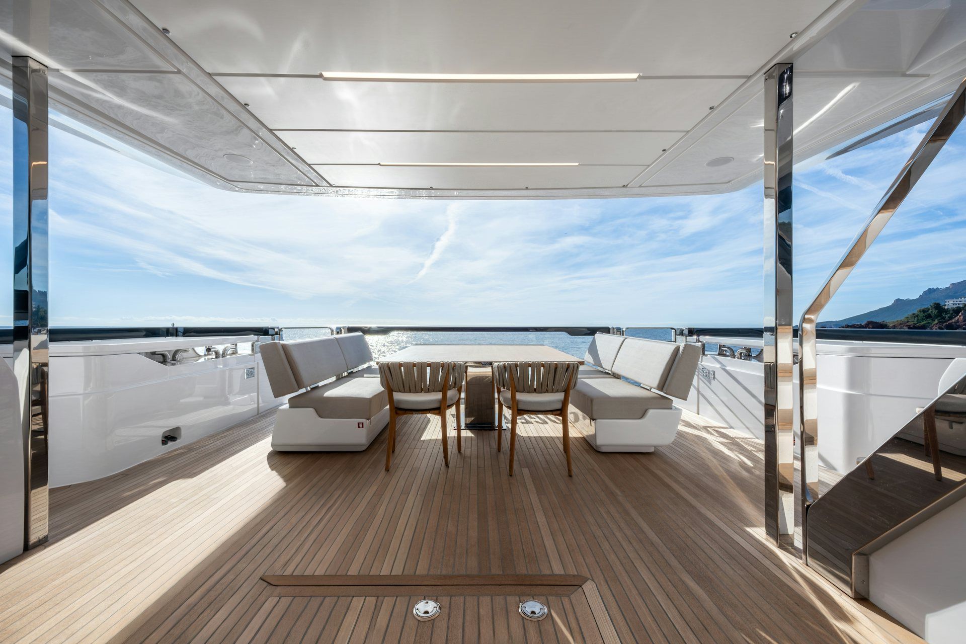 Flybridge designed as a true living space, with an electric hardtop, full