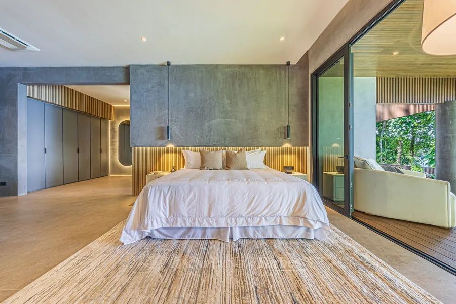 The grandest space is the primary living area with a cathedral ceiling of almost three stories encased in floor-to-ceiling windows conjuring the sensation of being seated within the canopy. This room is steps down from the main floor and leads out to a deck bordered by a Balinese-tiled wraparound pool effectively blurring the boundaries between inside and out.