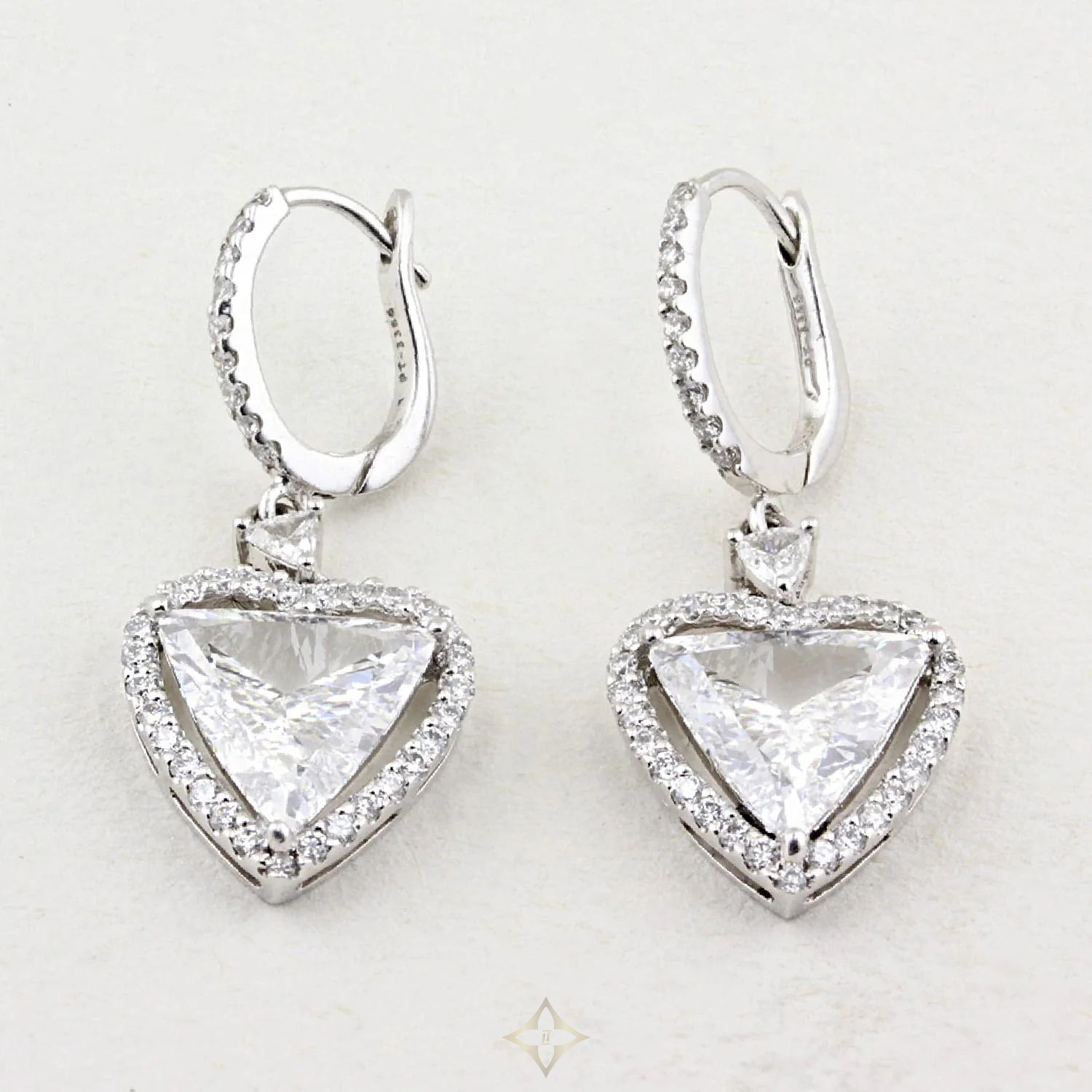 Heart shaped cluster is suspended from a levered hoop fitting, set with further brilliant cut Diamonds, with a small decorative trillion cut Diamond in between to add sparkle. Making the total length 30mm.