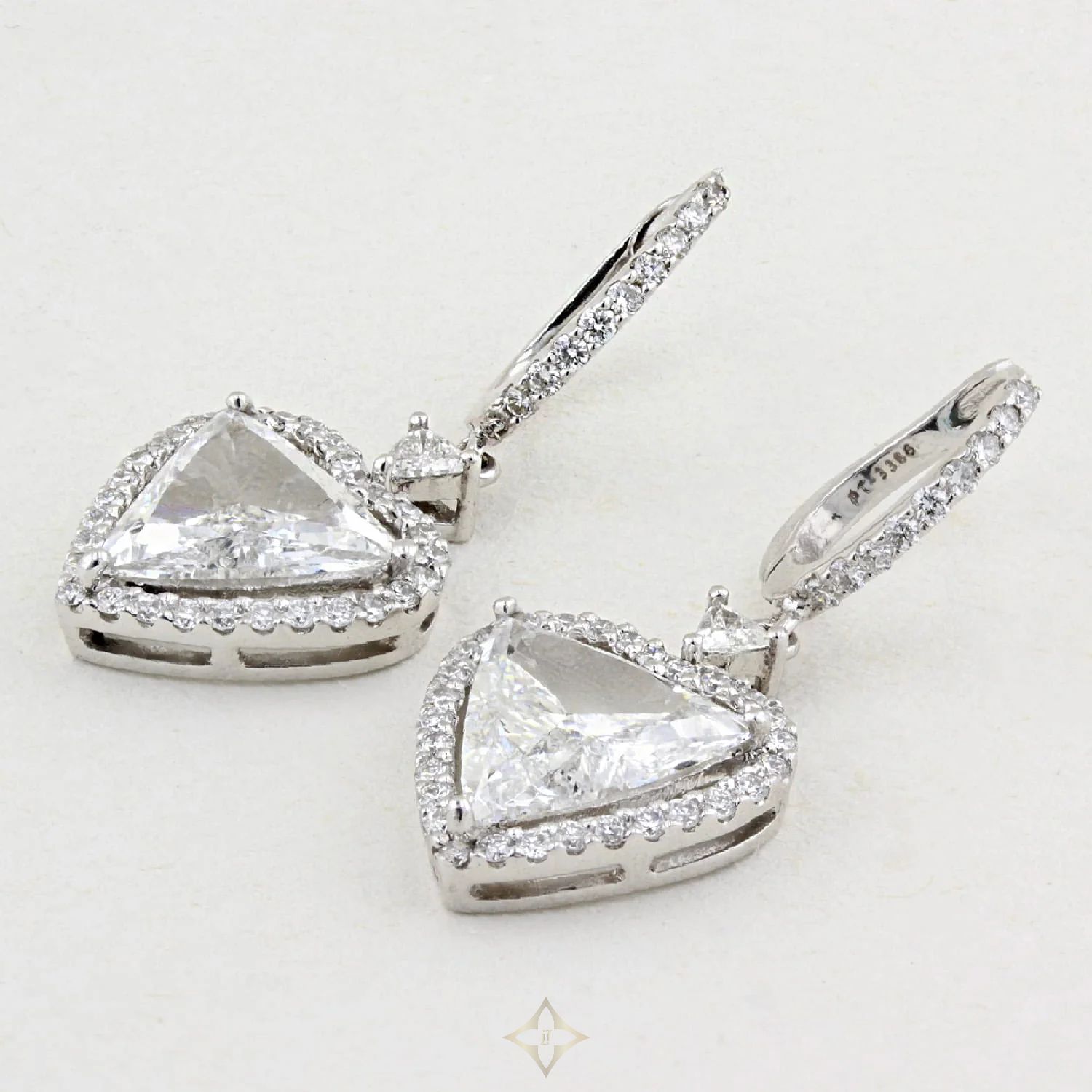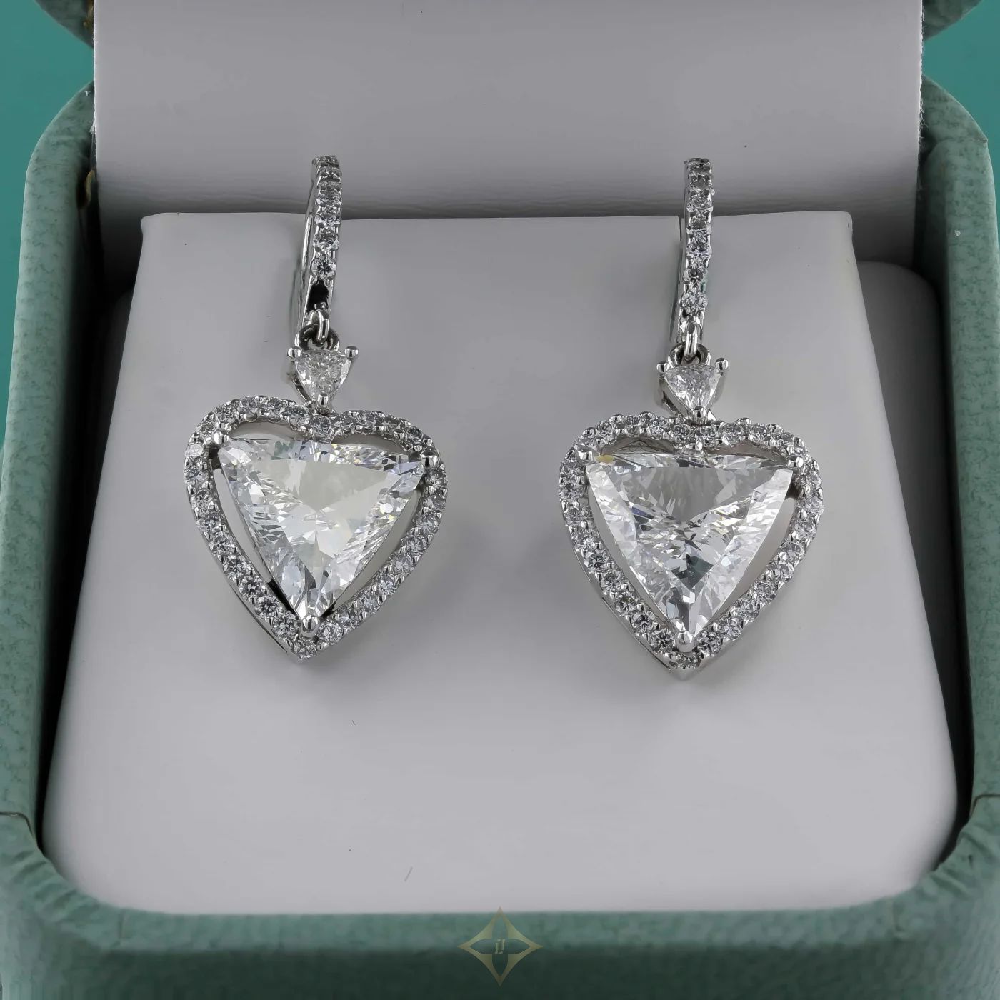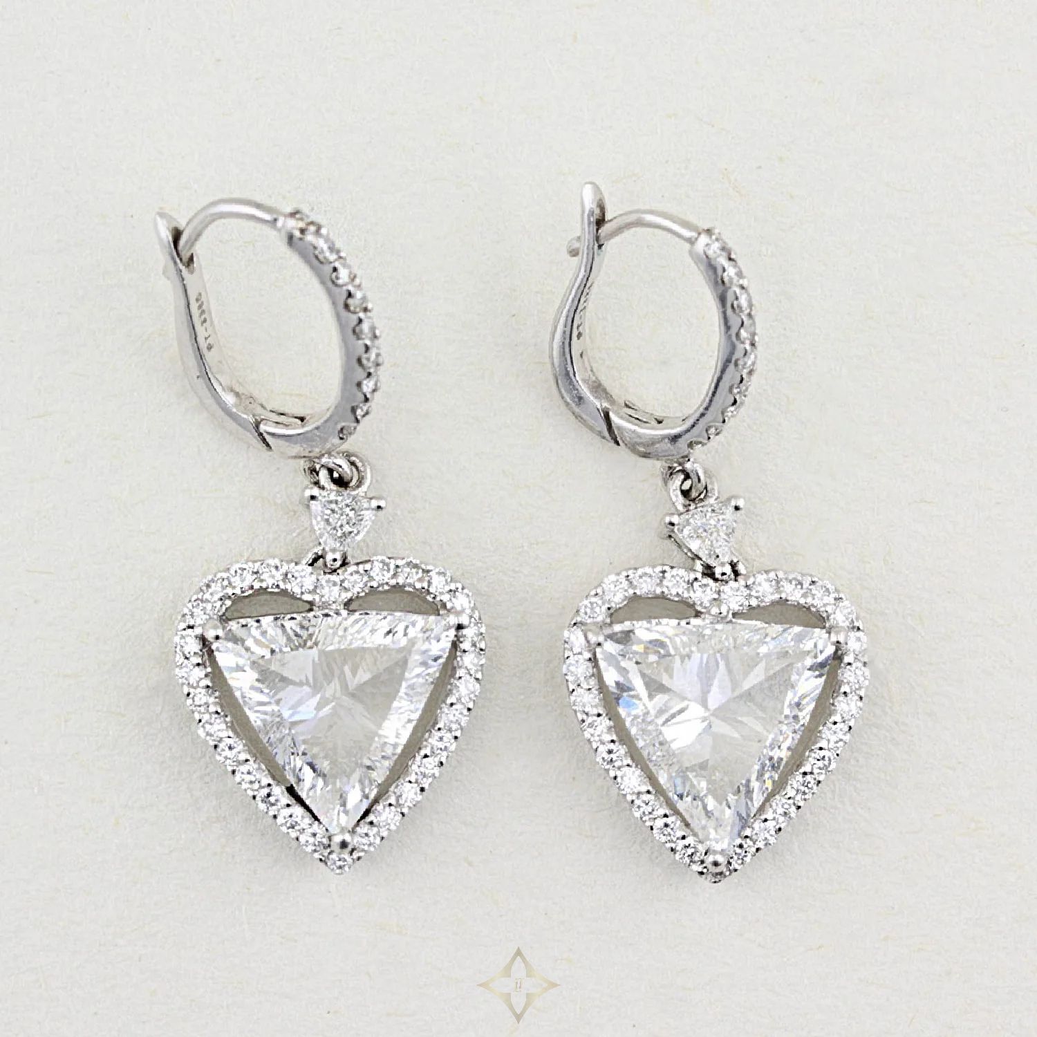 Pre-Owned Platinum heart-shaped Diamond drop earrings. Each earring features a trillion cut Diamond, weighing 1.46ct and 1.72ct, set by three claws, surrounded by a heart shaped halo of micro-set brilliant cut Diamonds, with a total Diamond weight of 4.00ct.