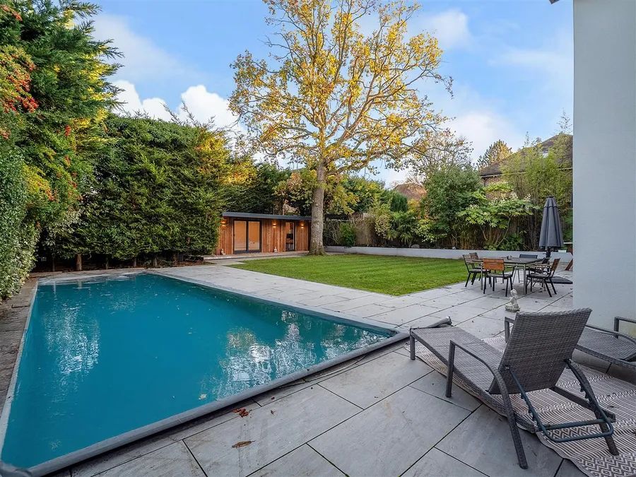 Renovated to an impeccable standard in 2021, the property opens into a grand entrance hall, leading to a stunning open-plan kitchen and dining space featuring a bespoke handmade tulip-wood kitchen with premium Miele appliances. Expansive bi-fold doors flow out to the landscaped garden and heated swimming pool, creating effortless indoor-outdoor living.