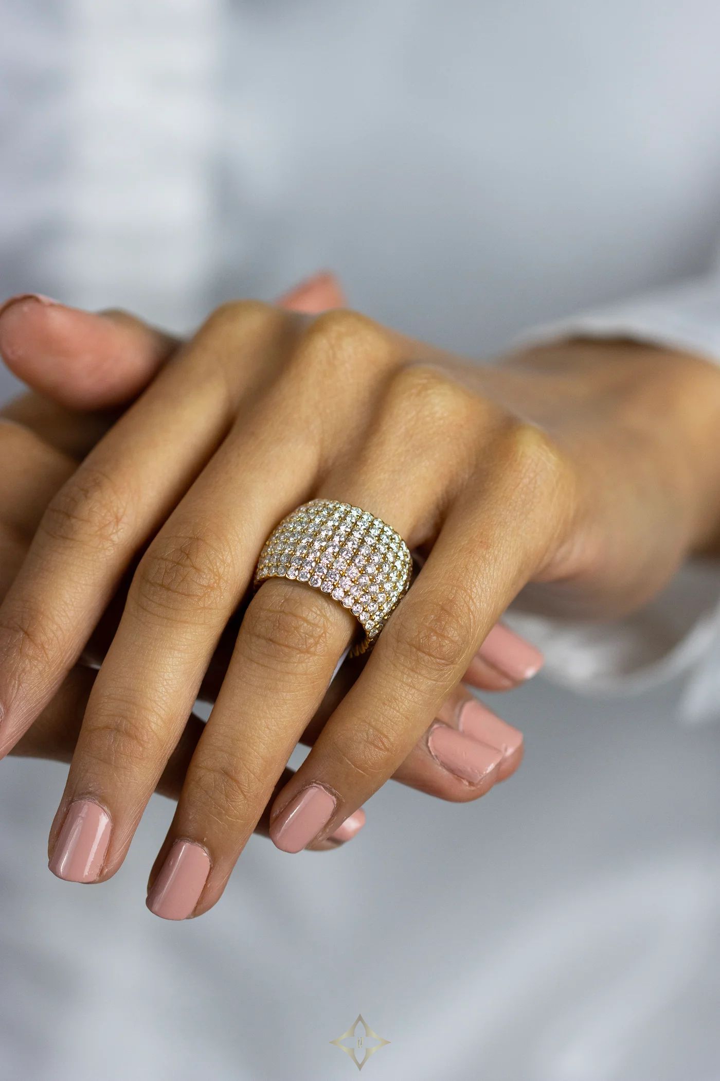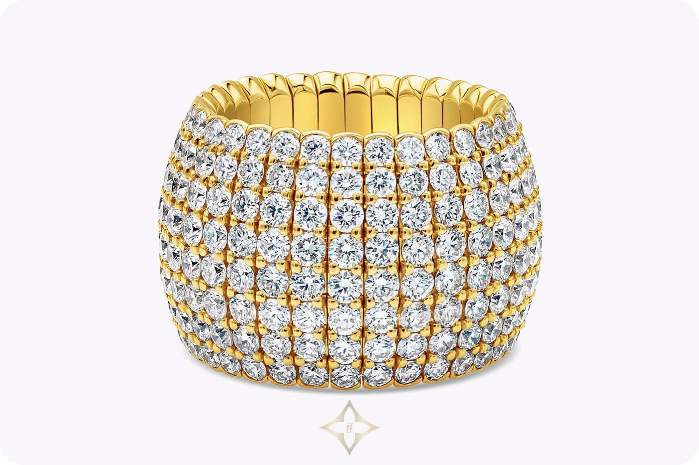 ROMAN MALAKOV FINE JEWELRY - NEW YORK, NYC 8.11 Carat Total Round Brilliant Cut Diamond Flexible Fashion Ring in Yellow Gold Price: $20,875.00 RM20690-001 A stylish and flexible fashion ring, showcasing eight rows of 256 round brilliant cut diamonds weighing 8.11 carats total, set with a beautiful micropavé design on a shared prong setting. Finely made with 18K yellow gold. Size 6.5 US, adjustable. Roman Malakov Diamonds