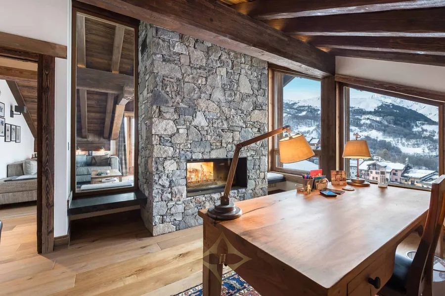 The top floor has a beautiful second living room and a private study both sharing a central fireplace and enjoying simply stunning South and Westerly views over the village of Le Cochet and over to Châtelard and the Vallée des Encombres