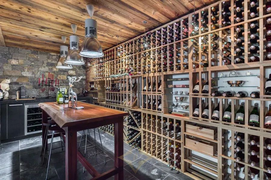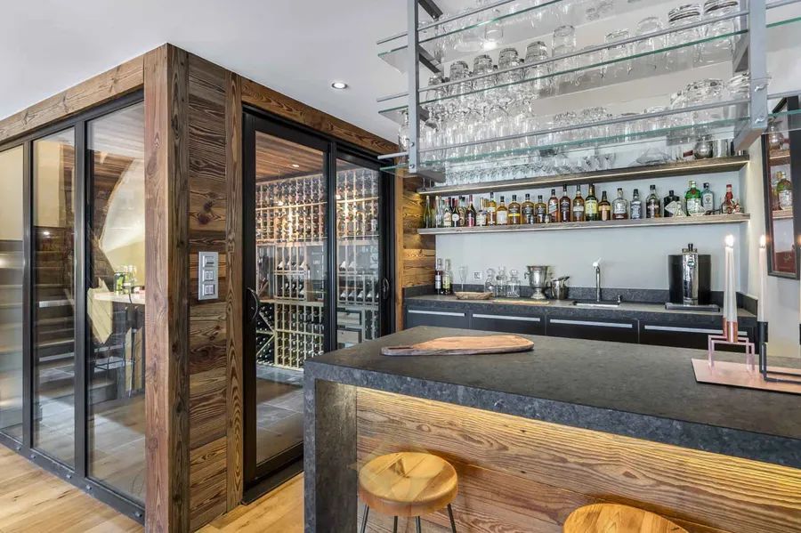 The first floor is given over entirely to alpine living and entertainment – this stunning open plan area of approx 110 msq has a bespoke kitchen, impressive glazed wine and degustation cave, dining area and lounge area with full height ceiling and fireplace. large glazed doors open out onto a huge wraparound deck with outdoor fireplace.