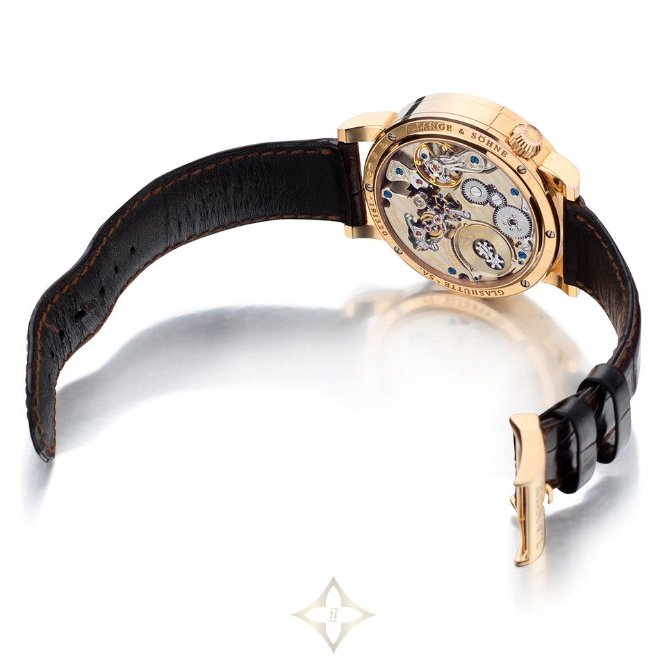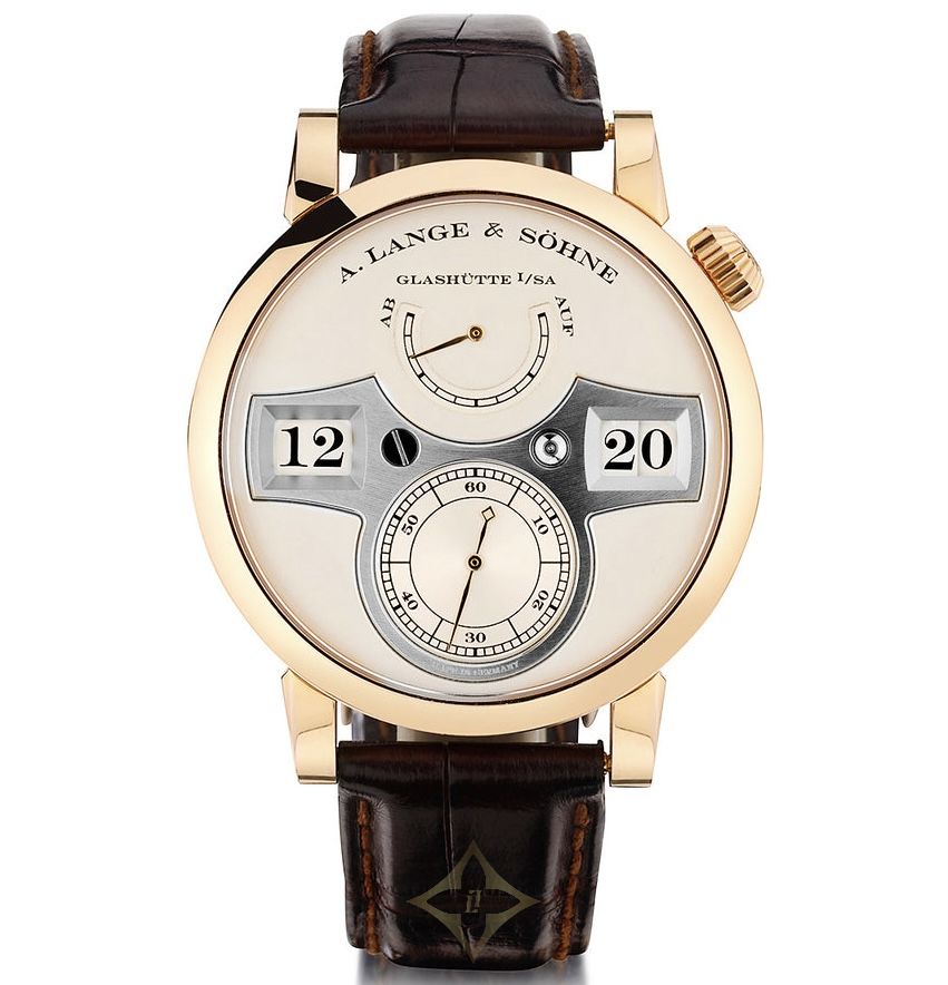 Masterpiece!!! A. Lange & Sohne Zeitwerk in 18kt Pink gold wristwatch. Time in hours and minutes digitally. Easy to read. Case size: 41.9mm x 12.6mm (thick). Brown Alligator band with pink gold tang clasp. Movement: Manual winding. 388 movement parts. Power reserve: 36 hours. Water resistance: 3 Bar. Power reserve indicator. Complications: Constant force escapement indicator. Power reserve indicator. Sapphire caseback. Made in Germany. Reference number: 140.032/LS1404AD. Purchased: 2010.