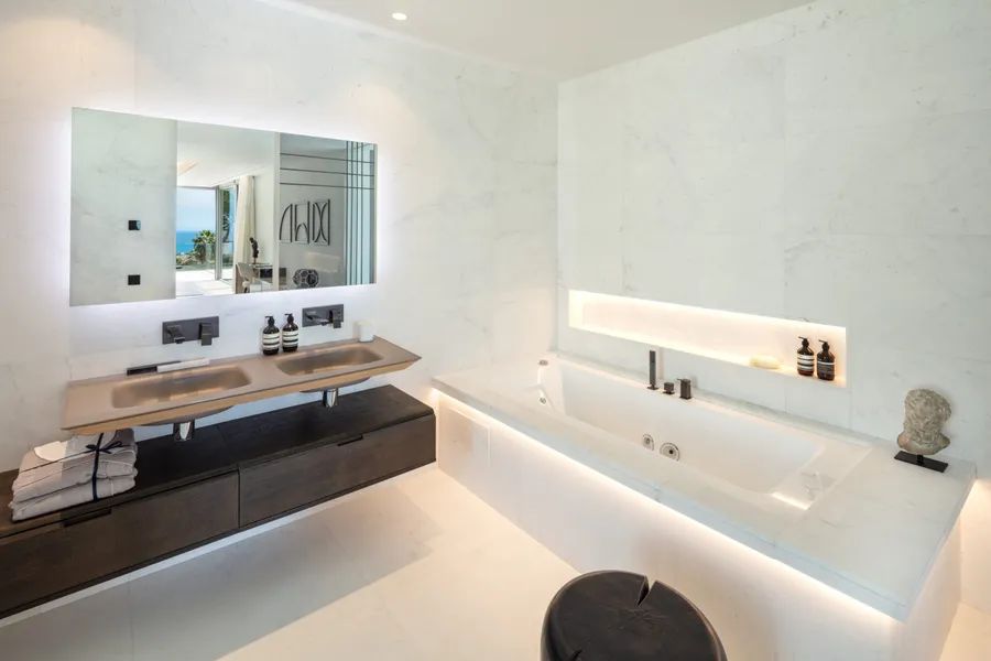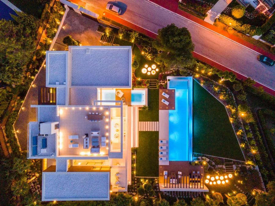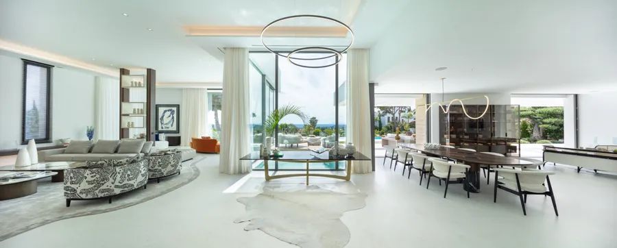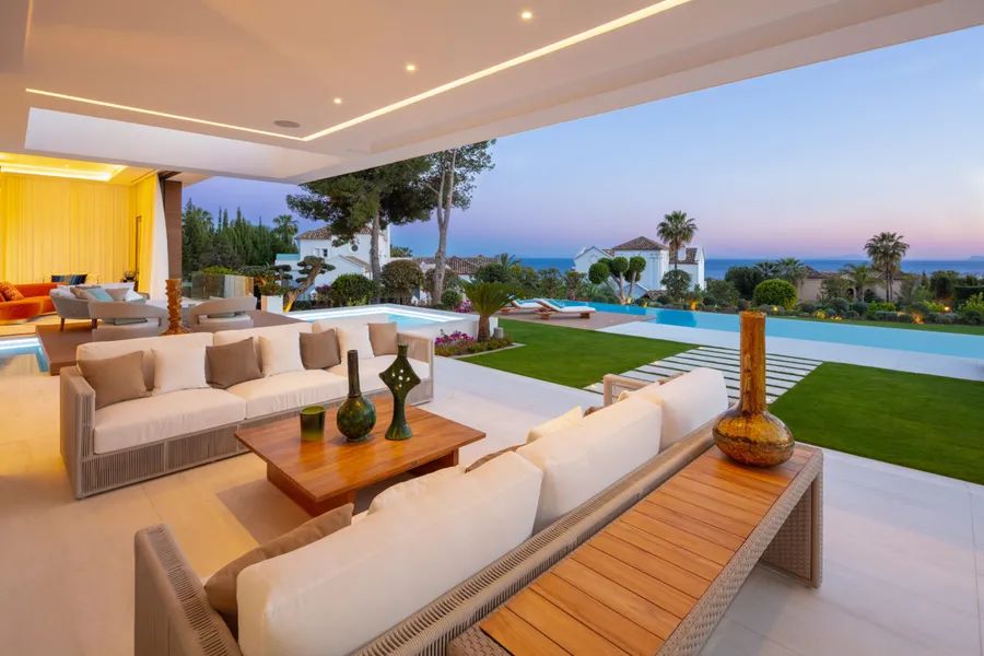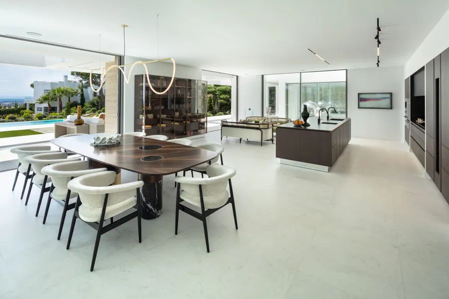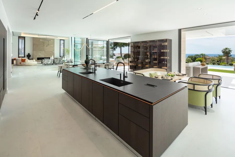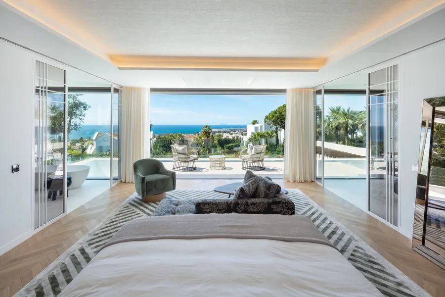 The property is meticulously designed to face the sea, creating an illusion of endless extension from the front garden and pool area towards the horizon, cleverly utilizing the natural slope of Marbella’s iconic mountain, La Concha. The entire Sierra Blanca urbanization is gracefully set on this gentle incline, ensuring panoramic views for all residences.