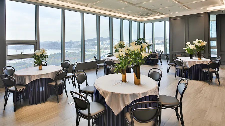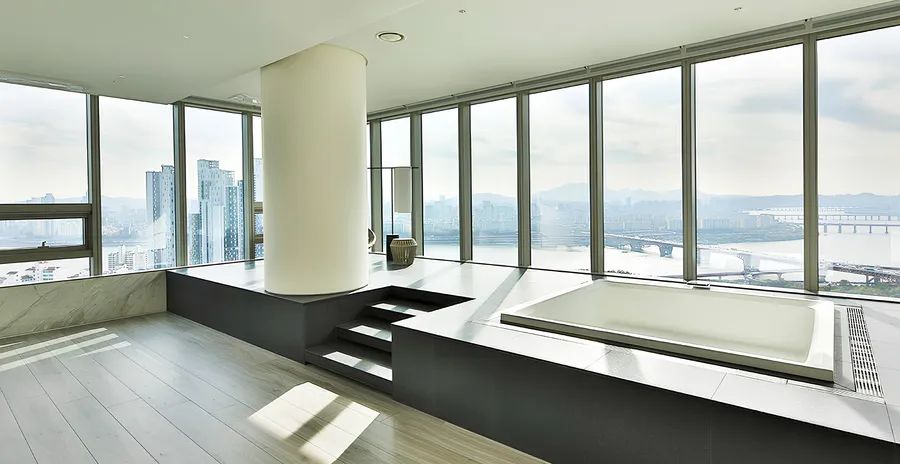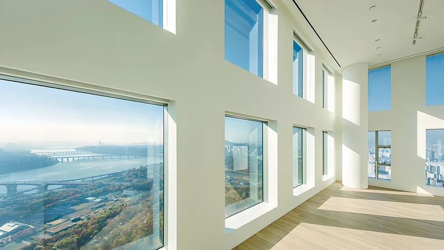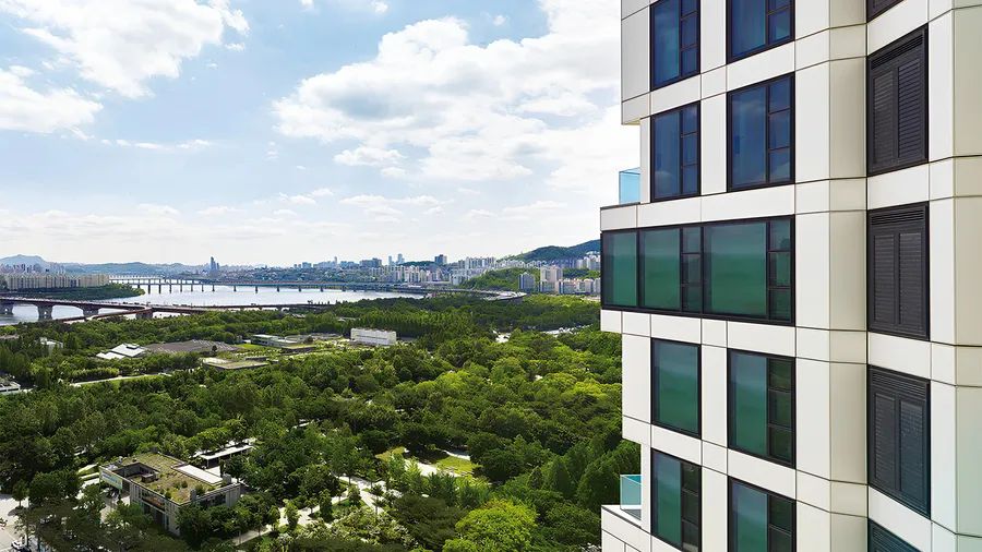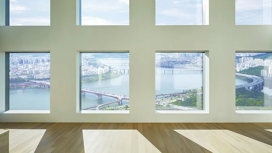 The exterior is finished in a sleek, grid-pattern design, providing stunning, unobstructed views of the Han River and Seoul Forest through a three-sided open