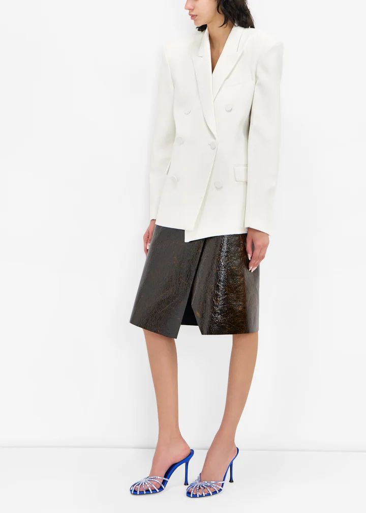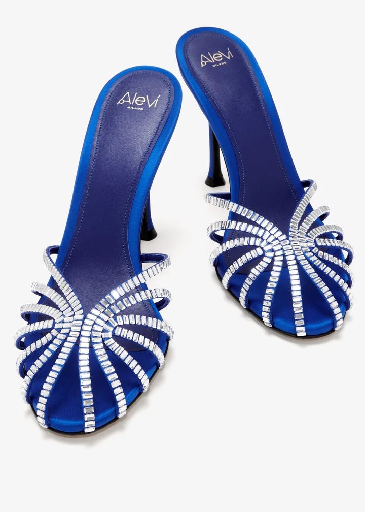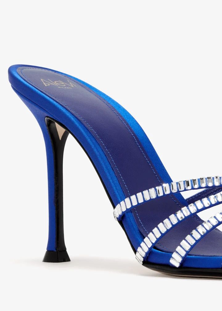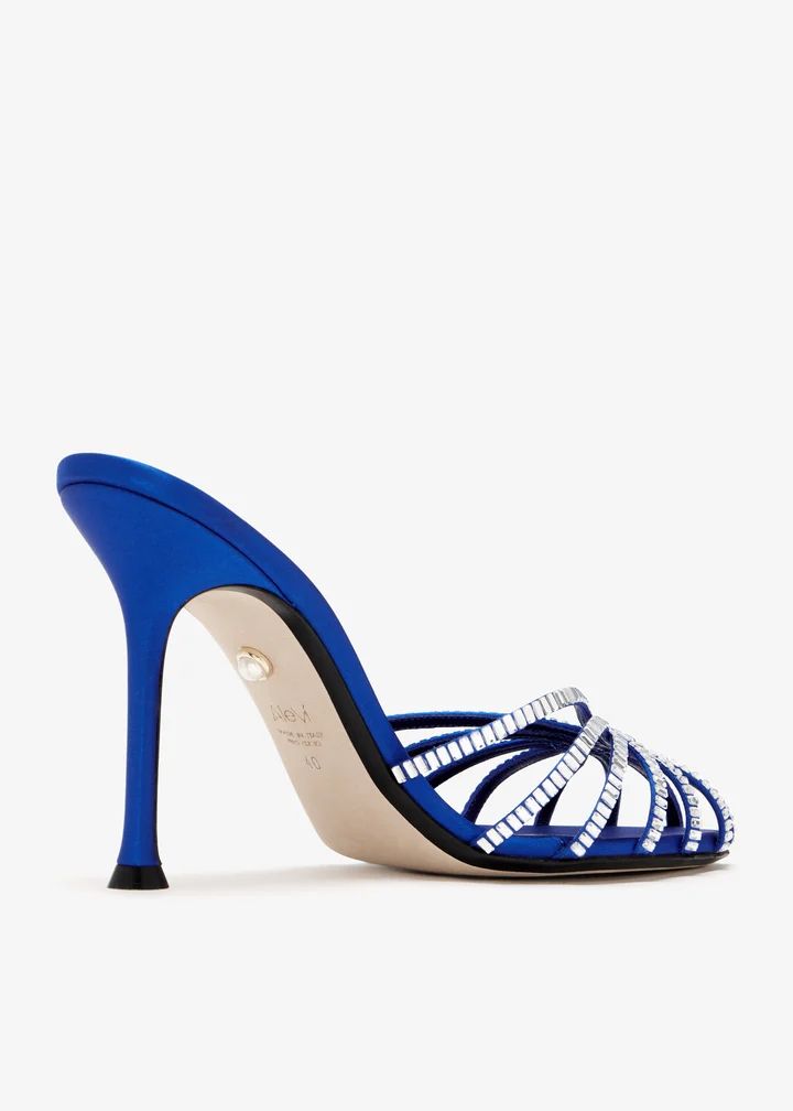 In a sabot-inspired design, these mules are built for nights that demand drama. Crafted in luxe satin detailed with signature baguette crystals on the caged upper, they're finished with a subtle pearl accessory on the leather sole.