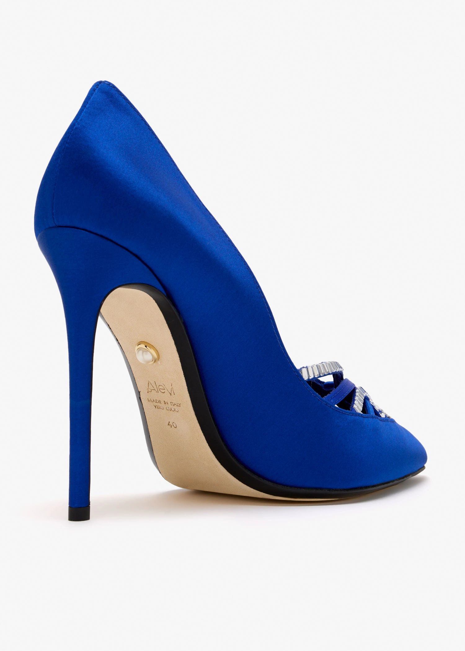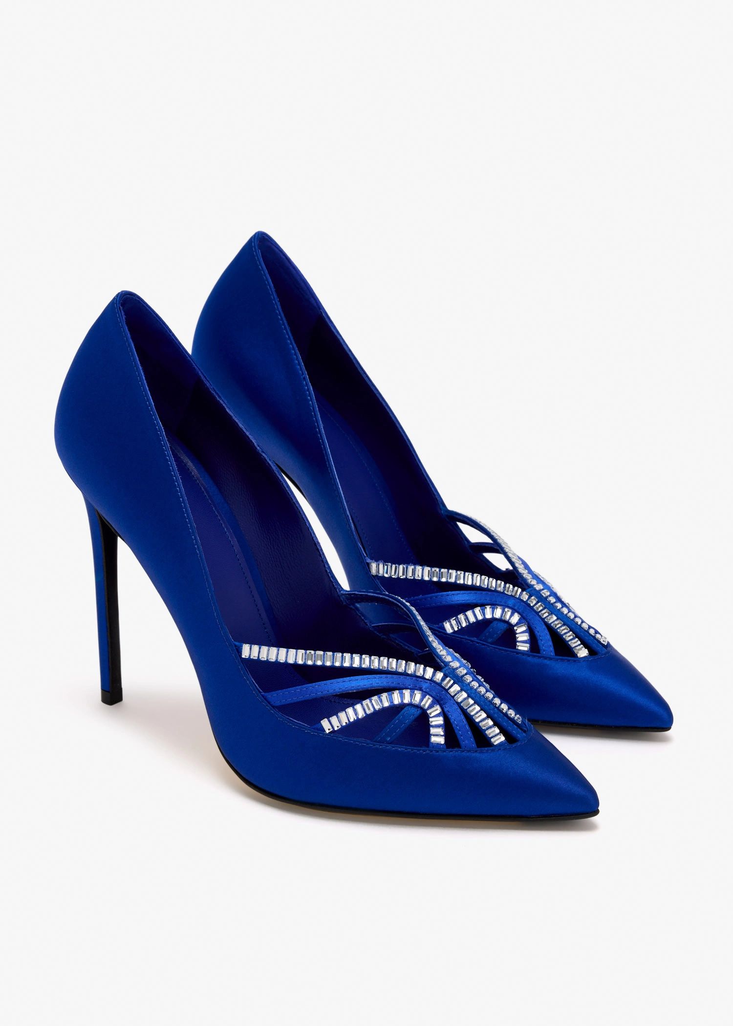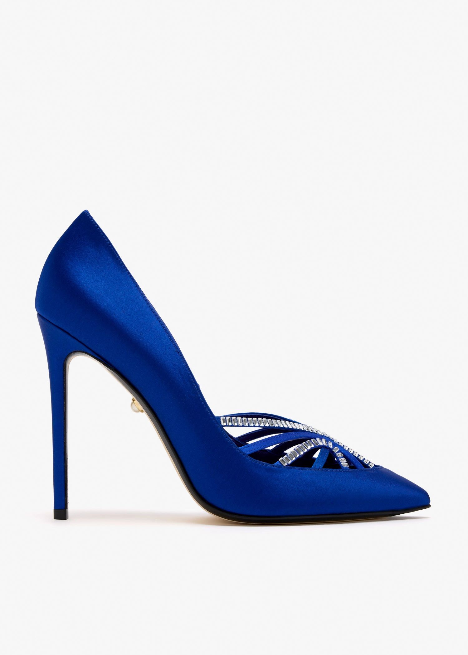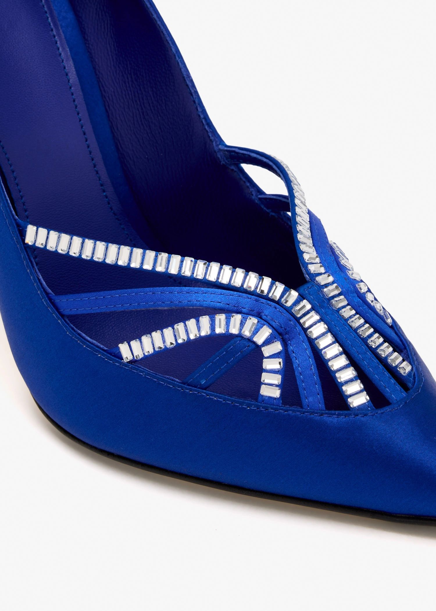 A pair built for nights that demand drama. Crafted in luxe satin detailed with signature baguette crystals on the upper, they're finished with a subtle pearl accessory on the leather sole.