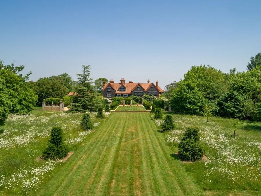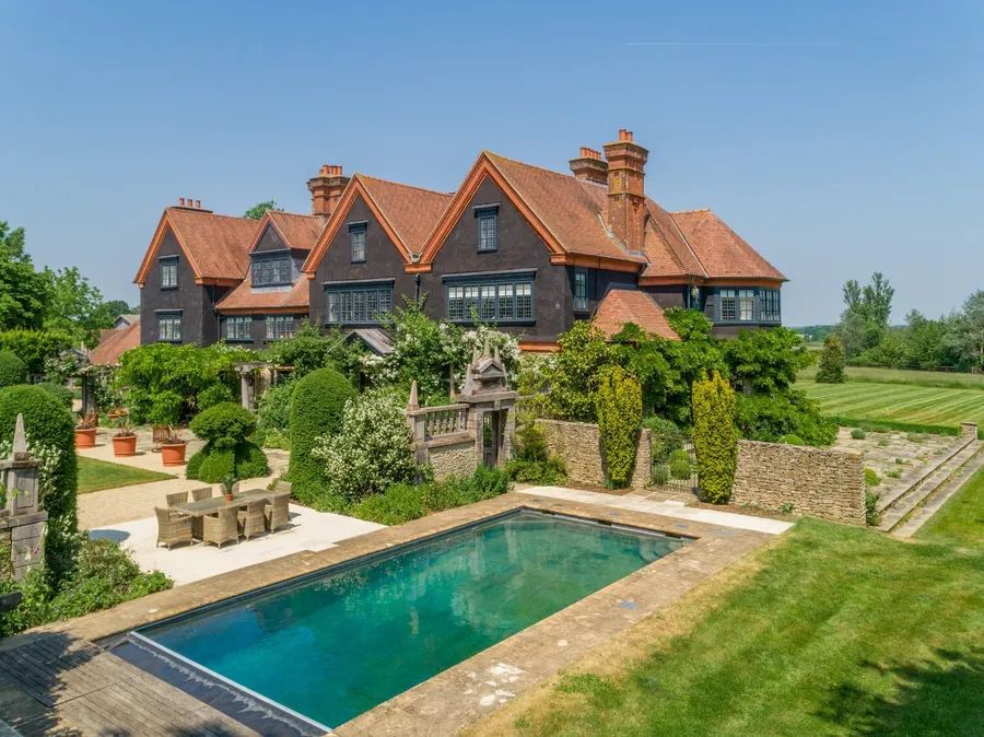 Built in 1905, the house is a handsome composition of Cotswold stone, warm red brick and lime render, its elevations animated by stone-mullioned leaded windows, intricate brick detailing beneath the roofline and a series of tall, decorative chimneys. The architecture has a quiet confidence, rich in period character yet balanced in proportion, and immediately announces the stature of the house within its landscape.