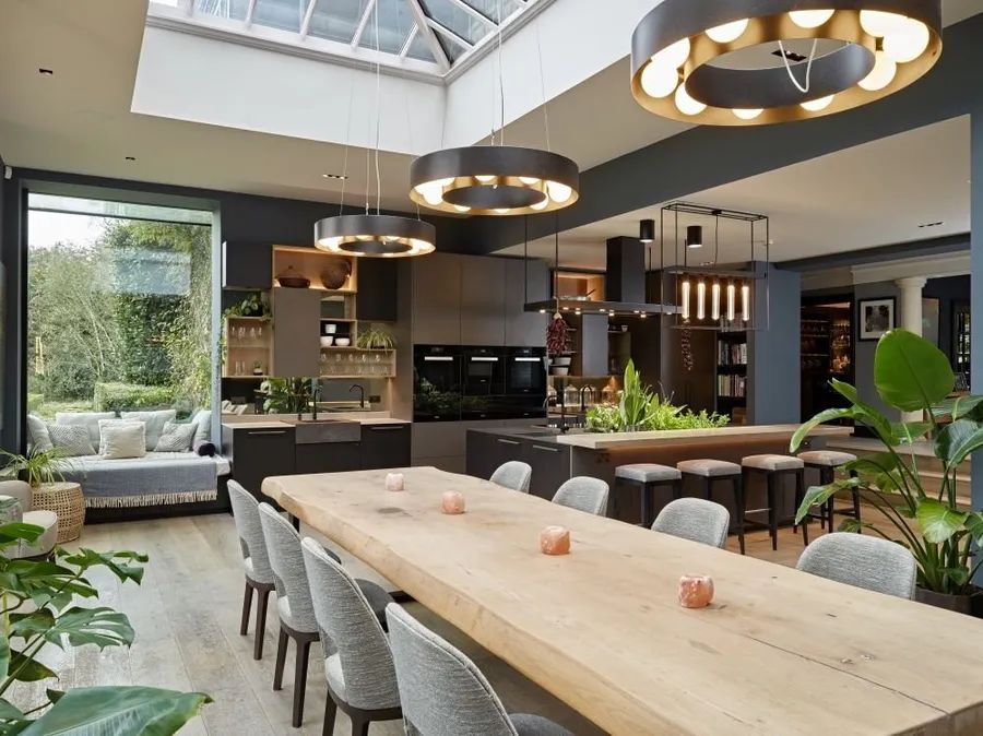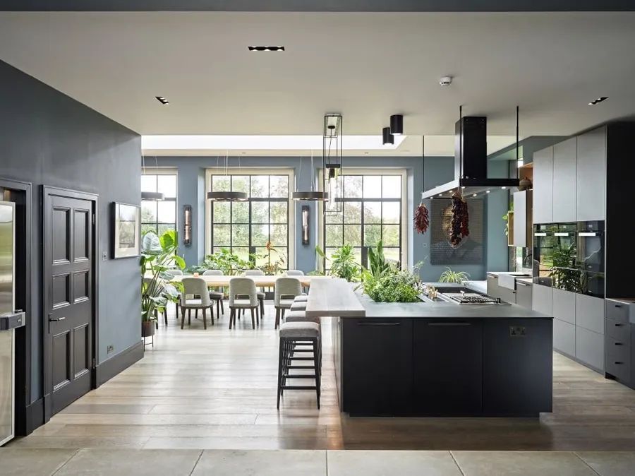 At the heart of the house lies the kitchen, breakfast and garden room, a striking central space that anchors daily life. Designed as a social hub, it enjoys views across both the front and rear gardens, with dark contemporary cabinetry set beneath veined composite worktops. A substantial island with oak breakfast bar provides informal seating, while a champagne sink at its centre reinforces the room’s entertaining credentials. The flow from kitchen to garden room creates a natural rhythm between inside and out. The principal bedroom suite occupies a particularly peaceful position, enjoying dual-aspect views over the gardens. It is complemented by a large dressing room with fitted wardrobes and a beautifully appointed bathroom featuring a freestanding claw-foot roll-top bath and separate shower. Further bedroom accommodation is arranged across the upper floors, including guest suites and family bedrooms, as well as a self-contained apartment on the second floor with its own kitchen and living space, ideal for extended family or staff.
